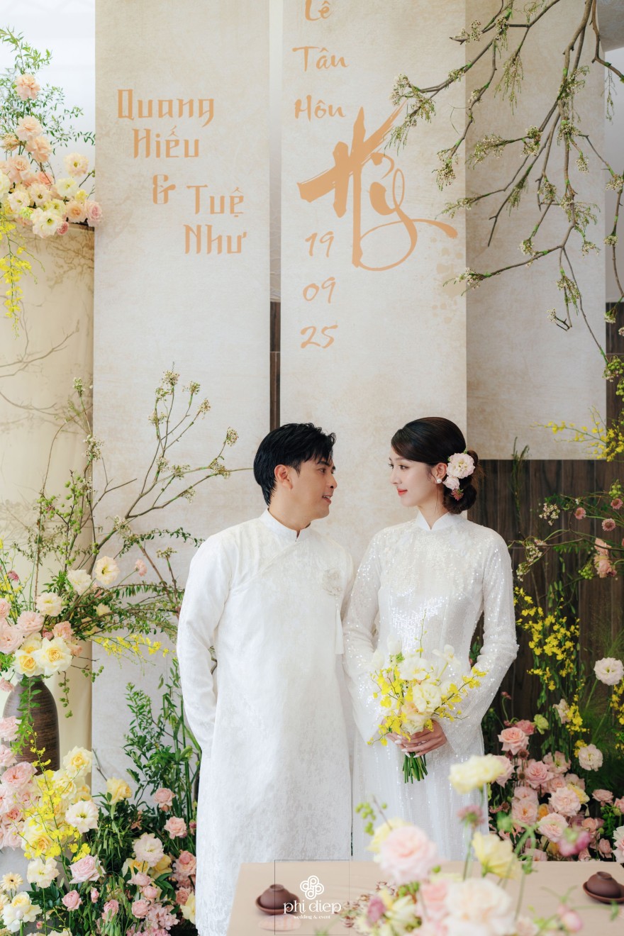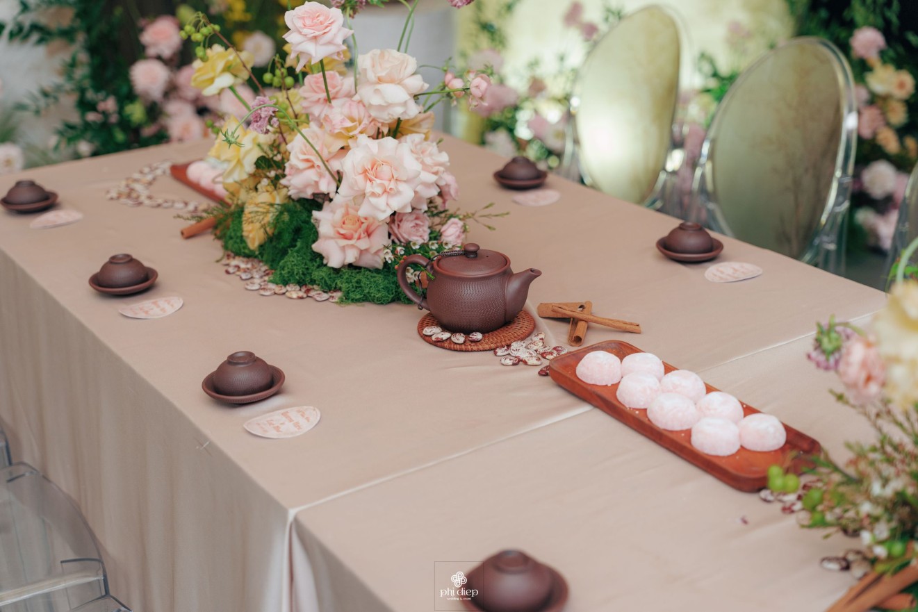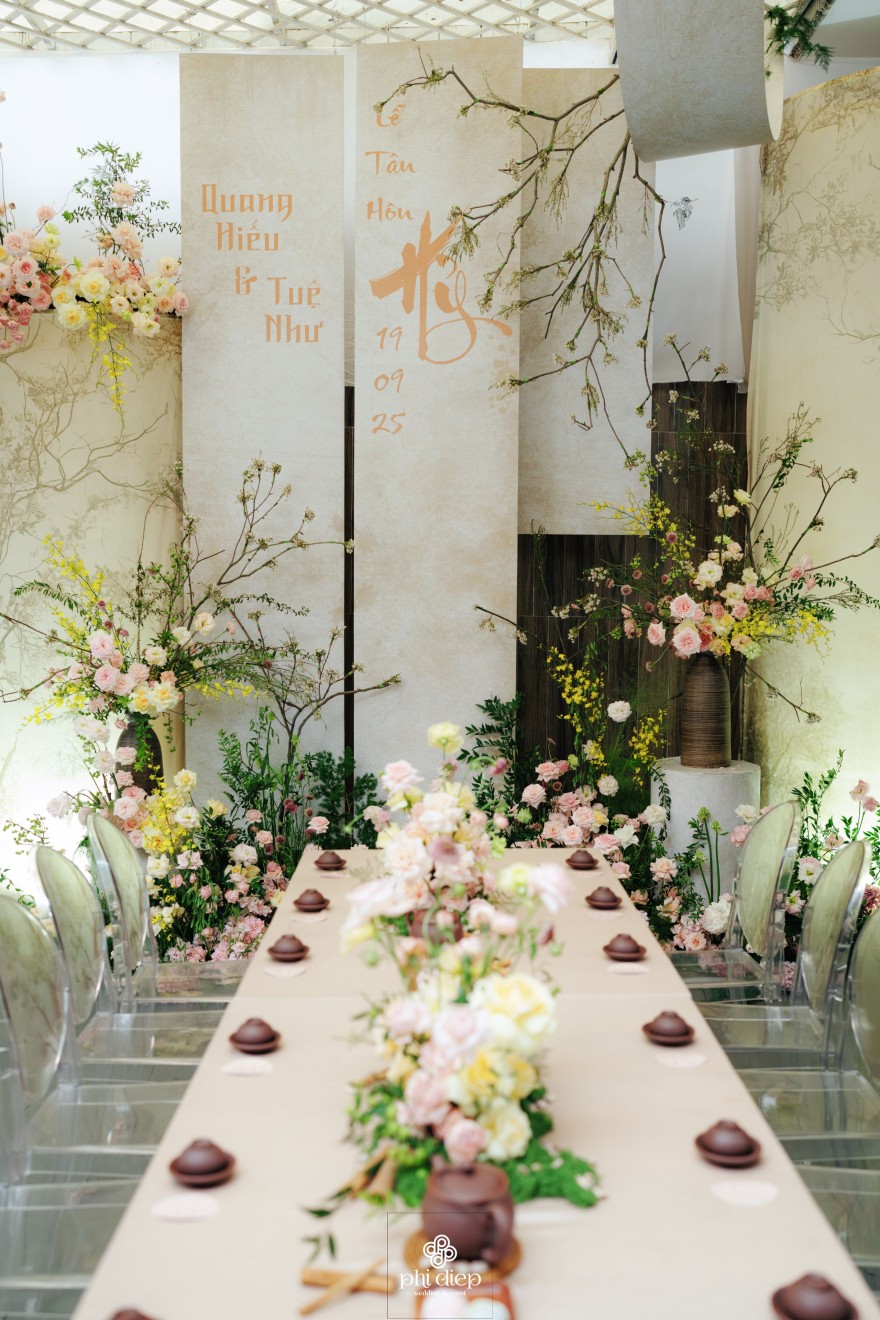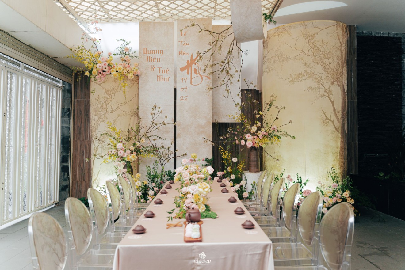 - Love story: Lễ tân hôn trọn vẹn và rực rỡ trong không gian chan chứa niềm vui, hạnh phúc. Mang trên mình tông màu vàng hồng làm chủ đạo, lễ cưới tựa như một bản tình ca ngọt ngào và lãng mạn. Hồng – sắc màu của yêu thương và mộng mơ, kết nối những trái tim đang chung nhịp đập. Vàng – biểu tượng của hạnh phúc, thịnh vượng và sự viên mãn. Trong văn hoá Á Đông, vàng còn là sắc màu của phú quý và trường thọ, như một lời chúc phúc gửi gắm đến đôi uyên ương về một tương lai bền lâu, rạng ngời.