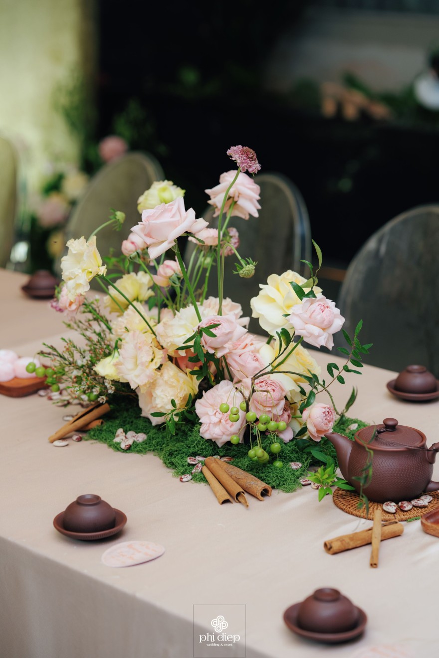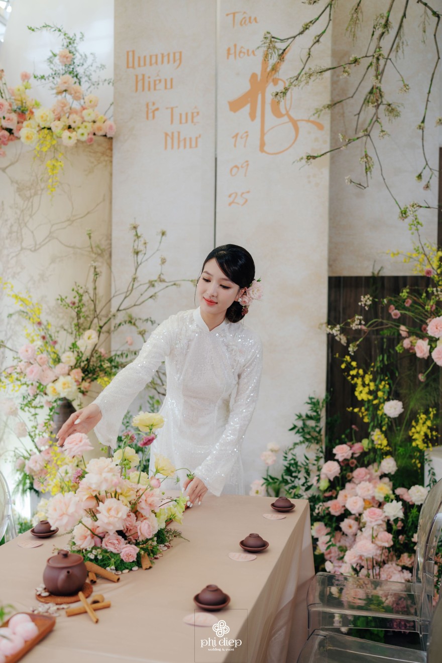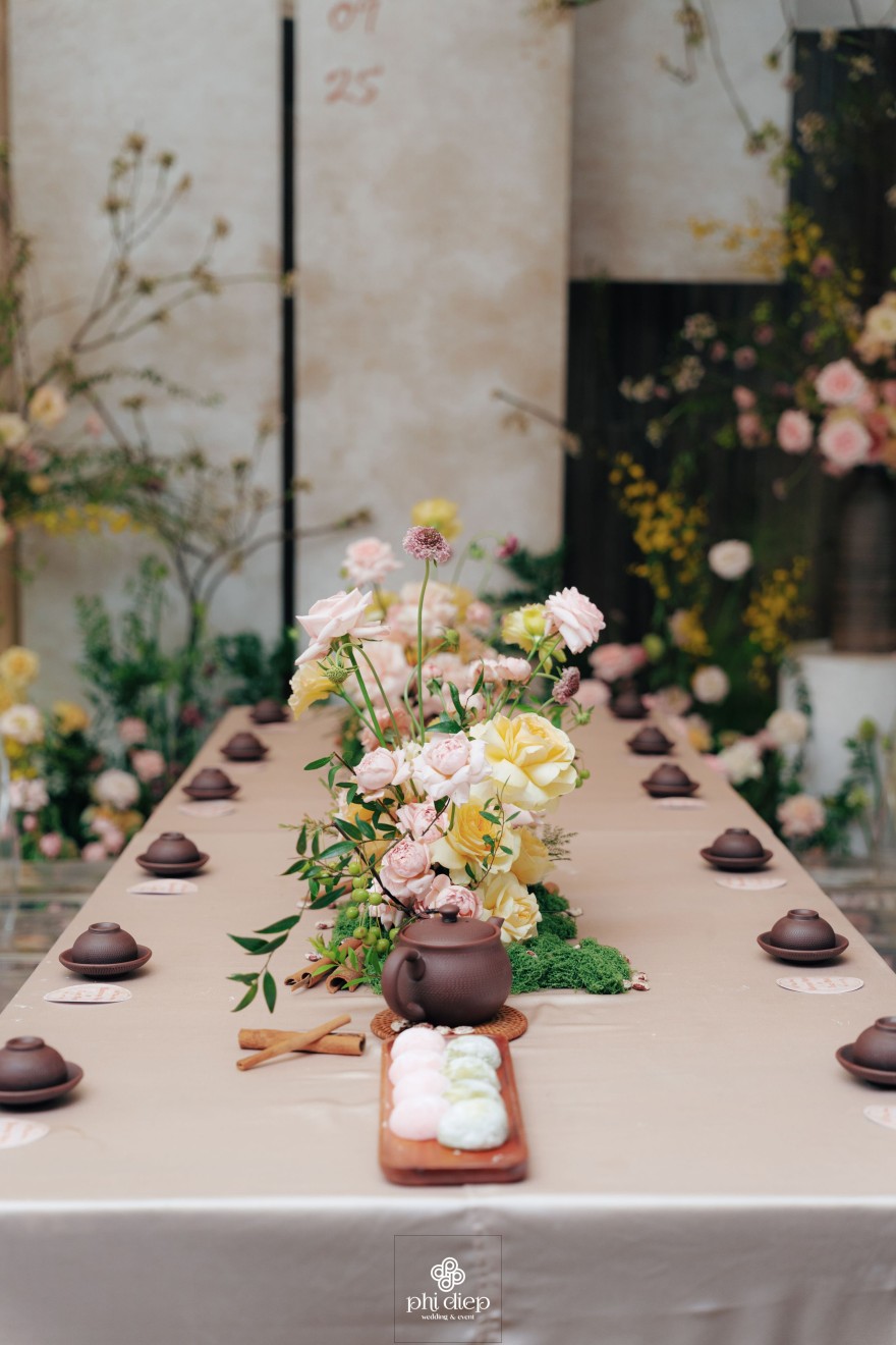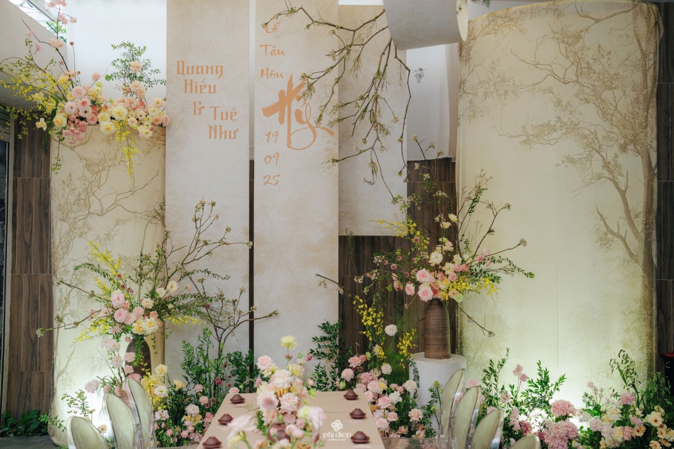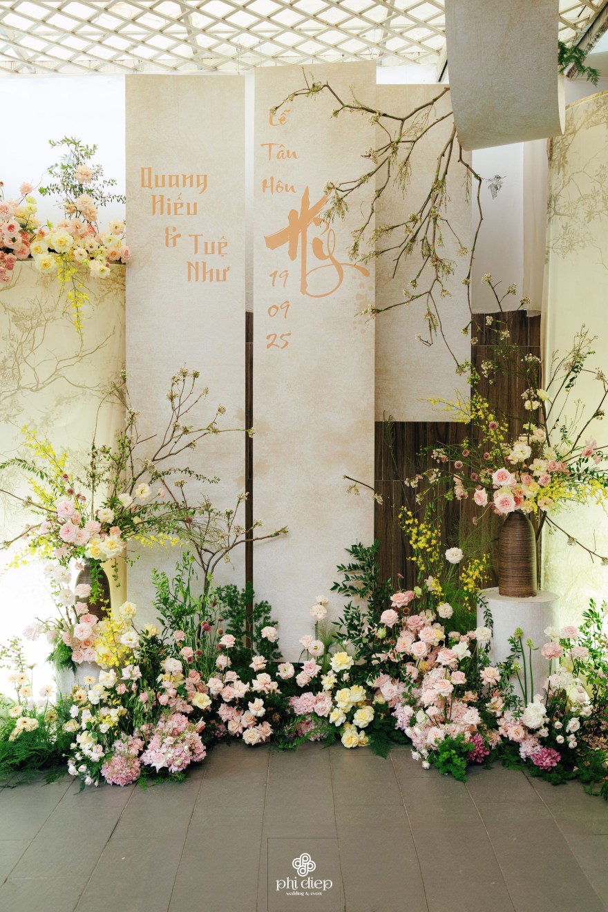 - Love story: Lễ tân hôn trọn vẹn và rực rỡ trong không gian chan chứa niềm vui, hạnh phúc. Mang trên mình tông màu vàng hồng làm chủ đạo, lễ cưới tựa như một bản tình ca ngọt ngào và lãng mạn. Hồng – sắc màu của yêu thương và mộng mơ, kết nối những trái tim đang chung nhịp đập. Vàng – biểu tượng của hạnh phúc, thịnh vượng và sự viên mãn. Trong văn hoá Á Đông, vàng còn là sắc màu của phú quý và trường thọ, như một lời chúc phúc gửi gắm đến đôi uyên ương về một tương lai bền lâu, rạng ngời.