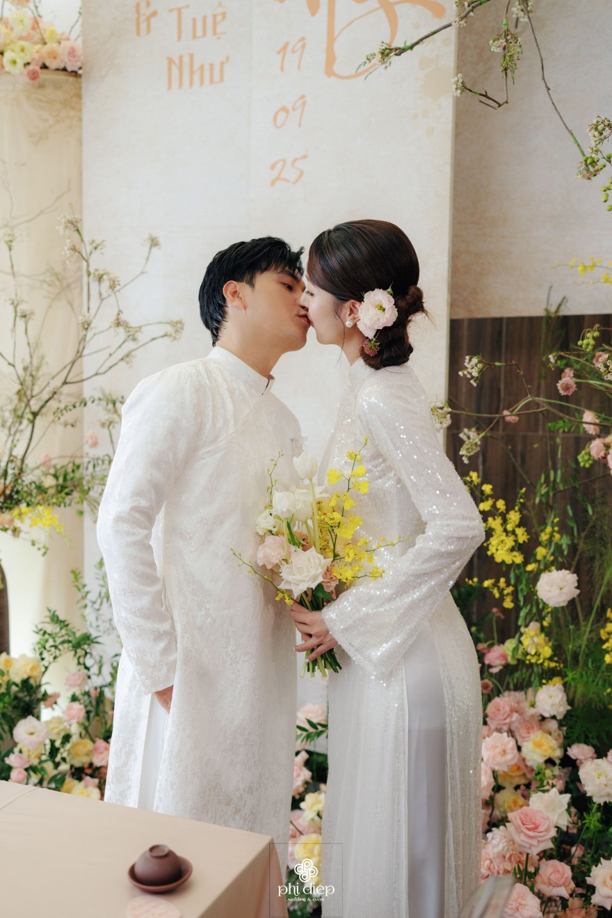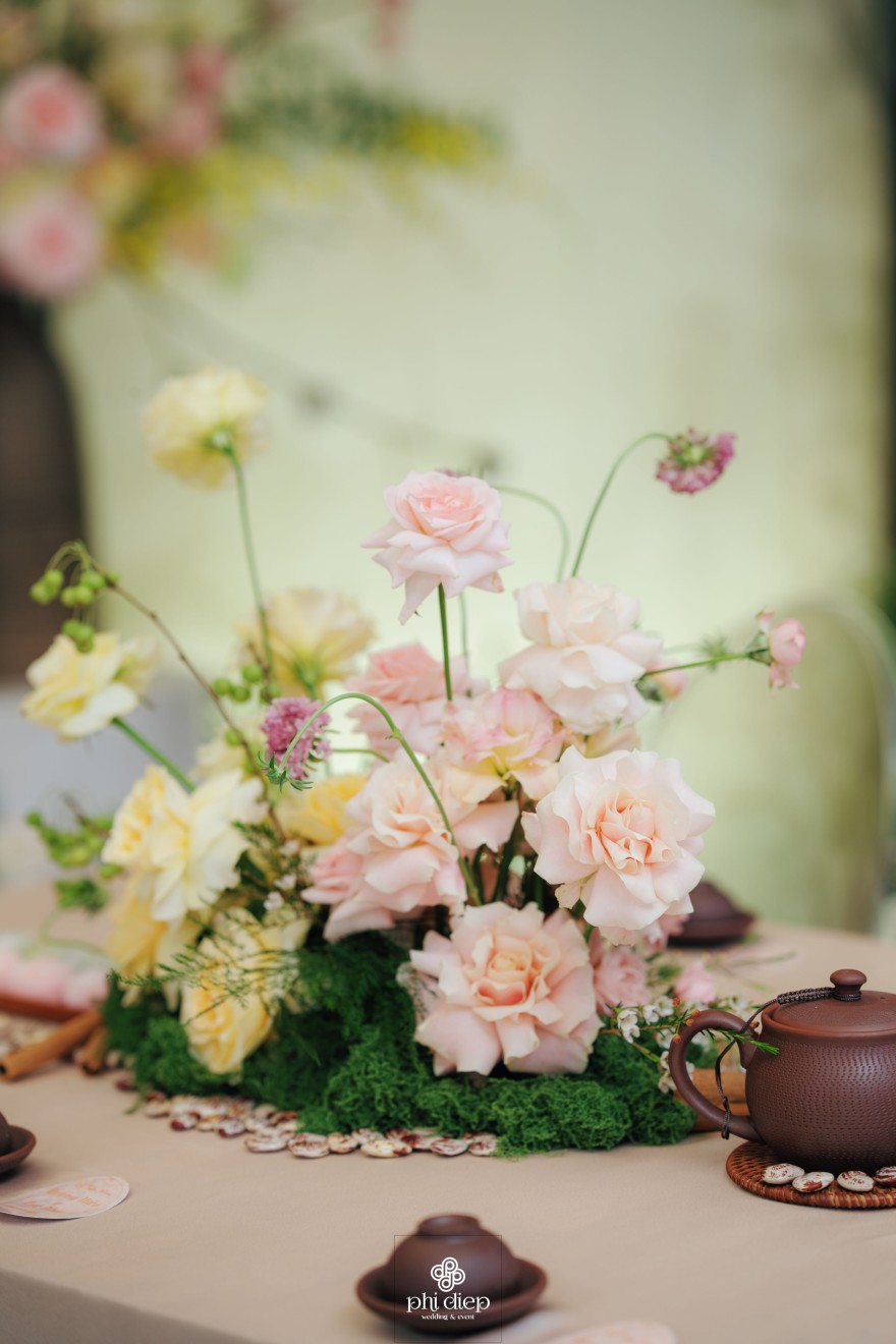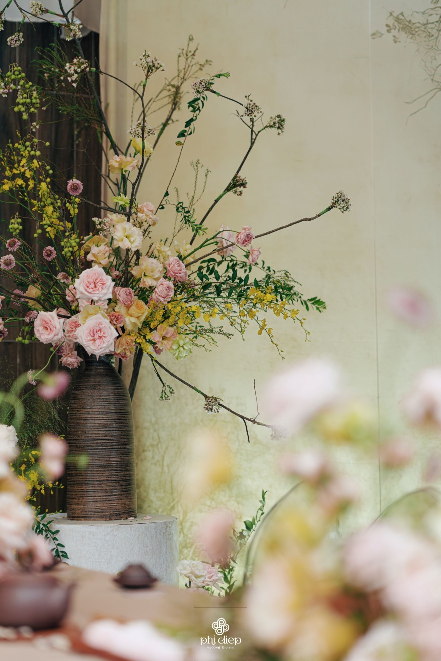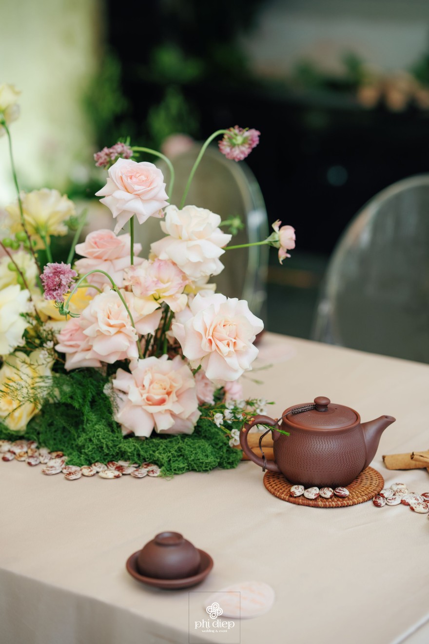 - Love story: Lễ tân hôn trọn vẹn và rực rỡ trong không gian chan chứa niềm vui, hạnh phúc. Mang trên mình tông màu vàng hồng làm chủ đạo, lễ cưới tựa như một bản tình ca ngọt ngào và lãng mạn. Hồng – sắc màu của yêu thương và mộng mơ, kết nối những trái tim đang chung nhịp đập. Vàng – biểu tượng của hạnh phúc, thịnh vượng và sự viên mãn. Trong văn hoá Á Đông, vàng còn là sắc màu của phú quý và trường thọ, như một lời chúc phúc gửi gắm đến đôi uyên ương về một tương lai bền lâu, rạng ngời.