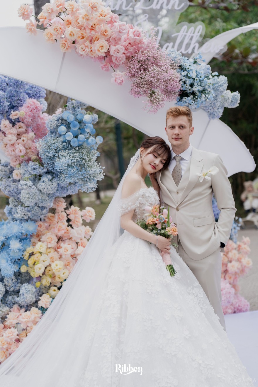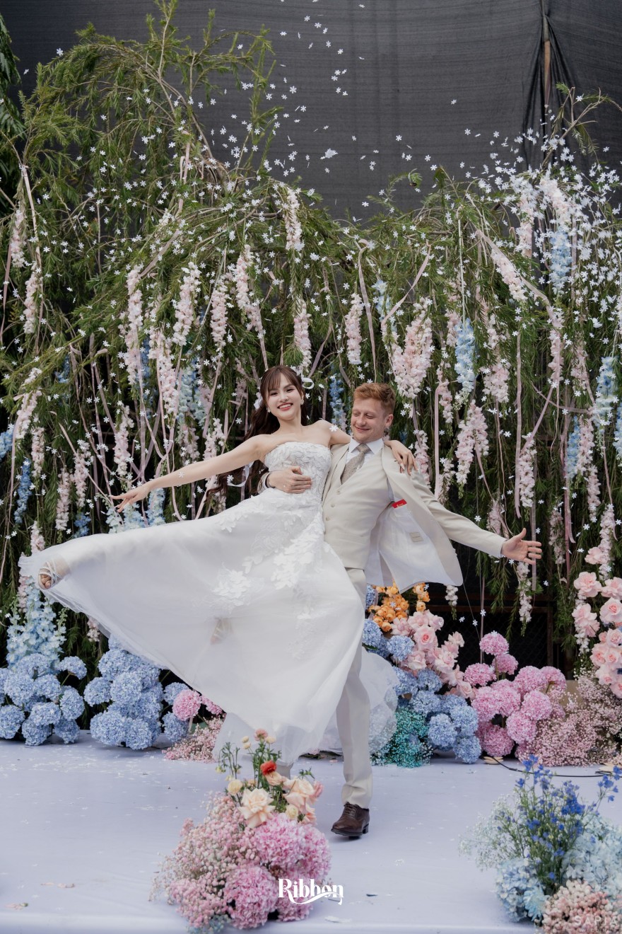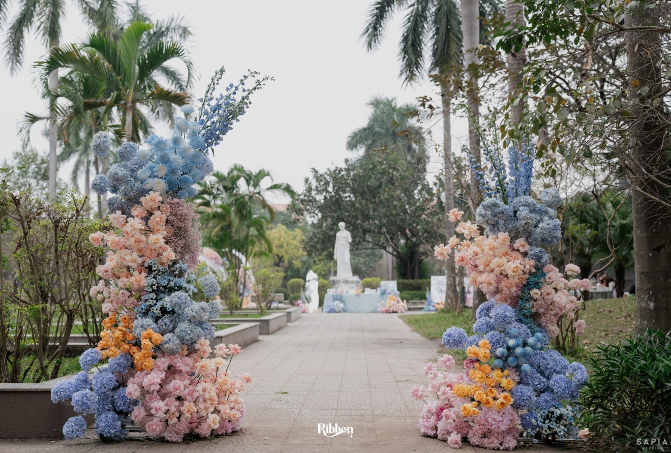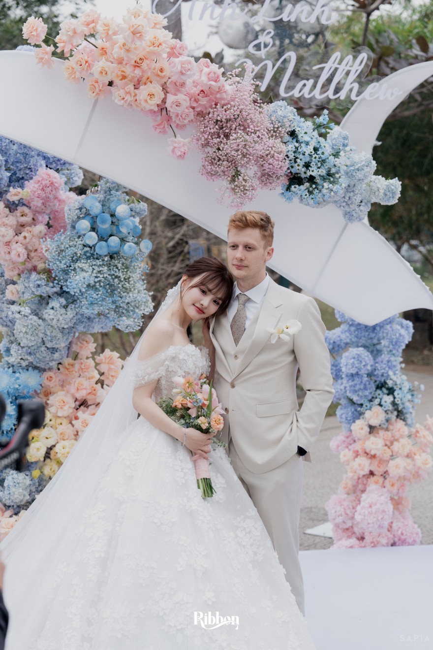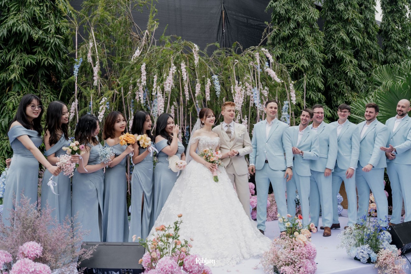 - Love story: Ánh xanh dịu không phải là màu xanh rực rỡ, mà là sắc xanh của sự tin tưởng, của bình yên, của một tình yêu đã đủ trưởng thành để không cần nói quá nhiều. Loài hoa chủ đạo của concept Delphinium xuất hiện một cách đầy dụng ý. Trong ngôn ngữ hoa, delphinium tượng trưng cho sự chân thành, bảo hộ và một tình yêu được chúc phúc. Những nhành hoa vươn cao, mảnh mai nhưng kiêu hãnh, như chính cách Linh & Mathew bước vào hành trình hôn nhân, dịu dàng, tin tưởng và luôn hướng về phía nhau.
