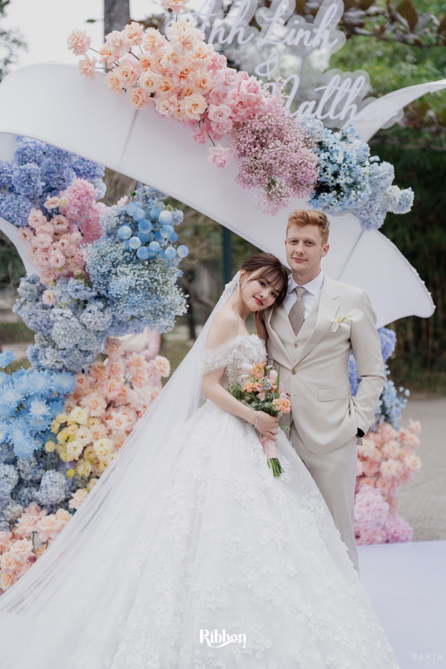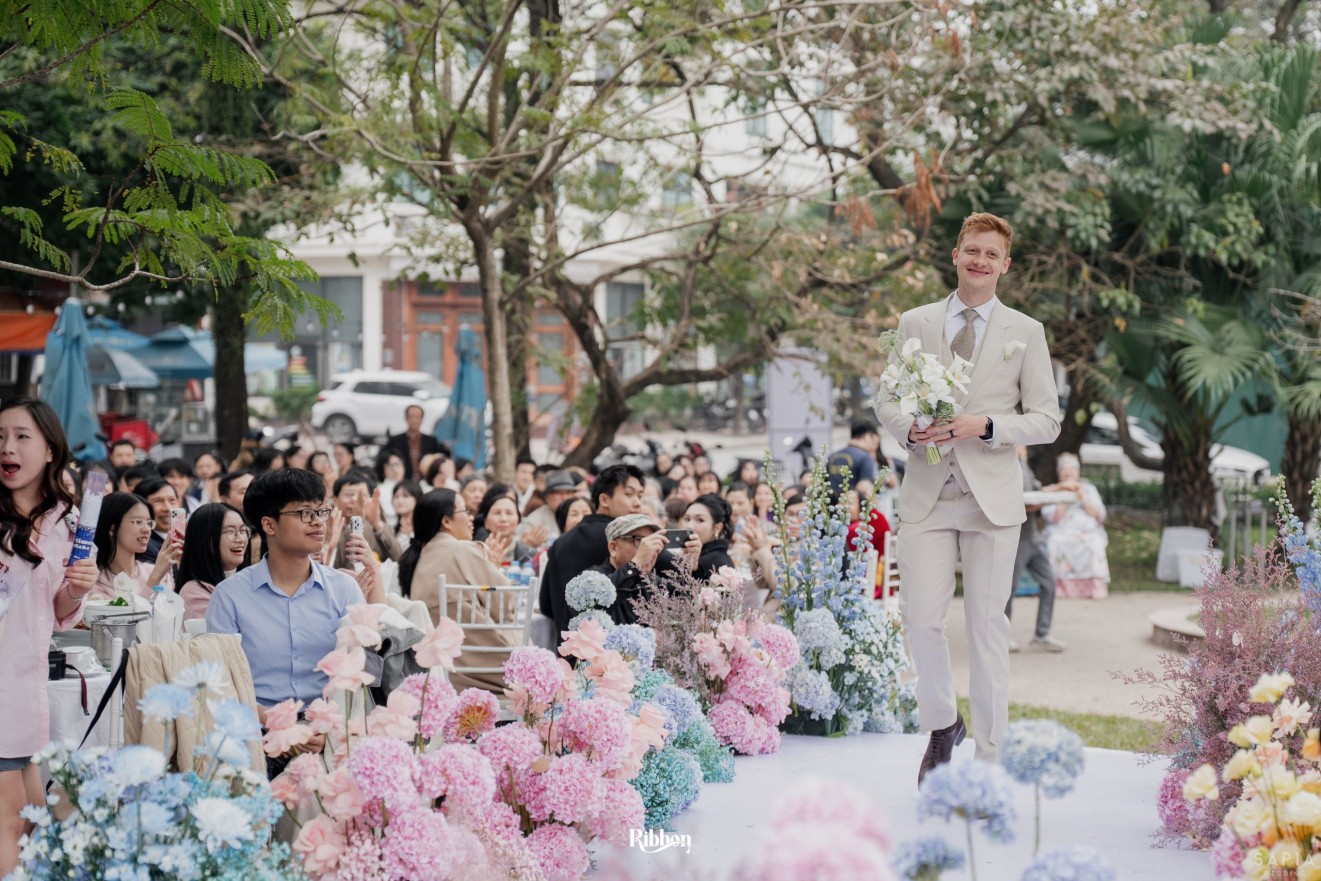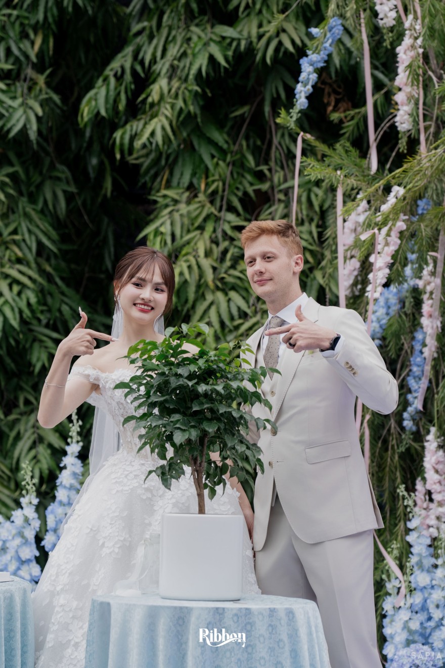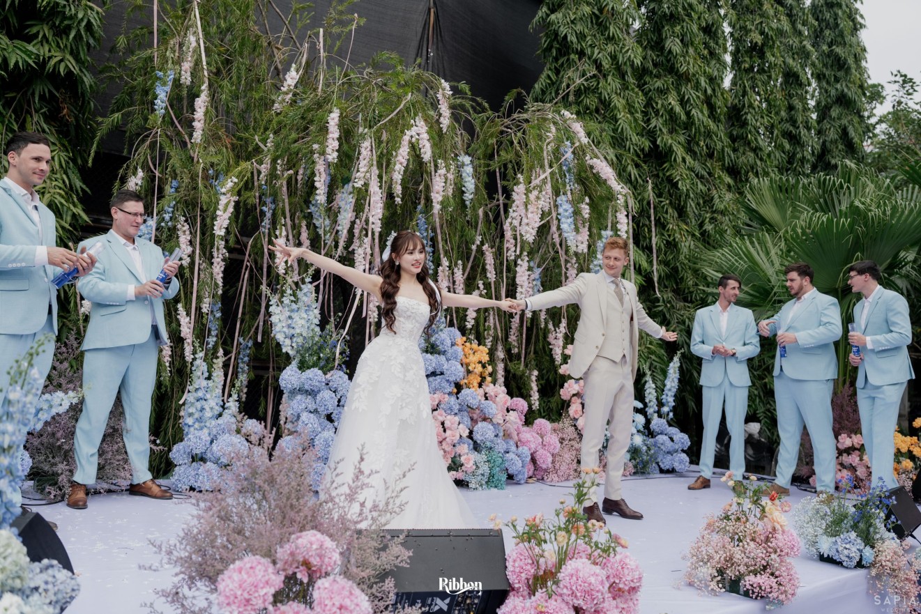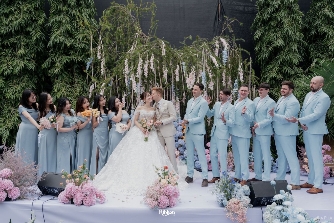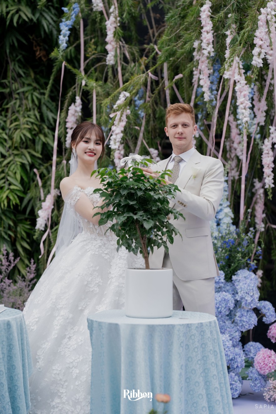 - Love story: Ánh xanh dịu không phải là màu xanh rực rỡ, mà là sắc xanh của sự tin tưởng, của bình yên, của một tình yêu đã đủ trưởng thành để không cần nói quá nhiều. Loài hoa chủ đạo của concept Delphinium xuất hiện một cách đầy dụng ý. Trong ngôn ngữ hoa, delphinium tượng trưng cho sự chân thành, bảo hộ và một tình yêu được chúc phúc. Những nhành hoa vươn cao, mảnh mai nhưng kiêu hãnh, như chính cách Linh & Mathew bước vào hành trình hôn nhân, dịu dàng, tin tưởng và luôn hướng về phía nhau.