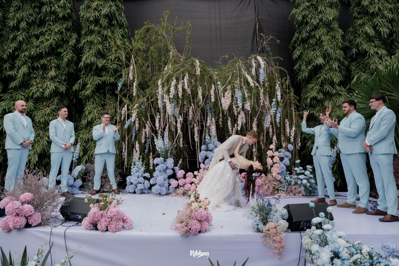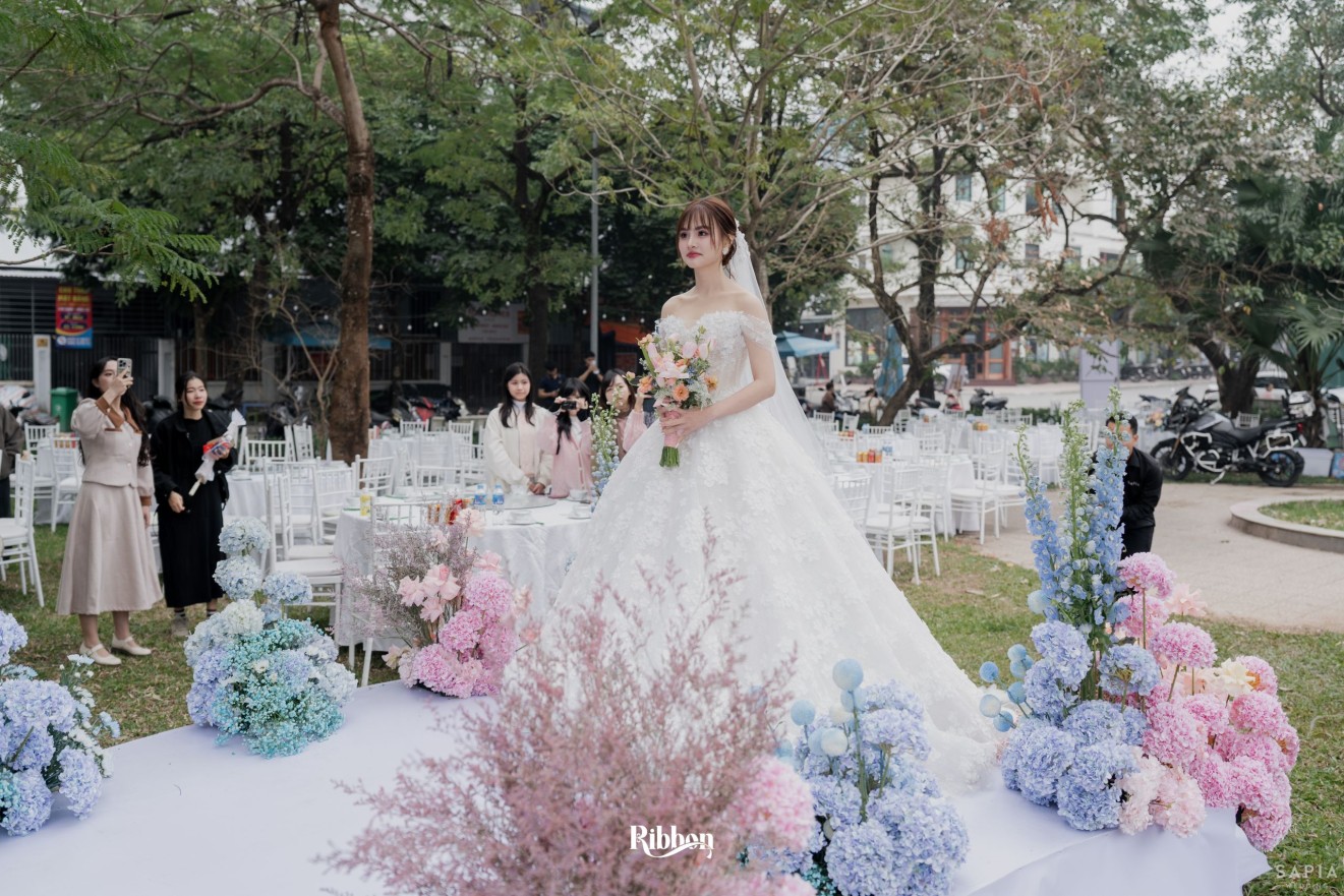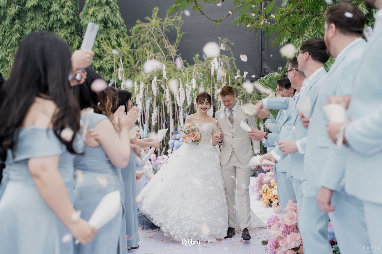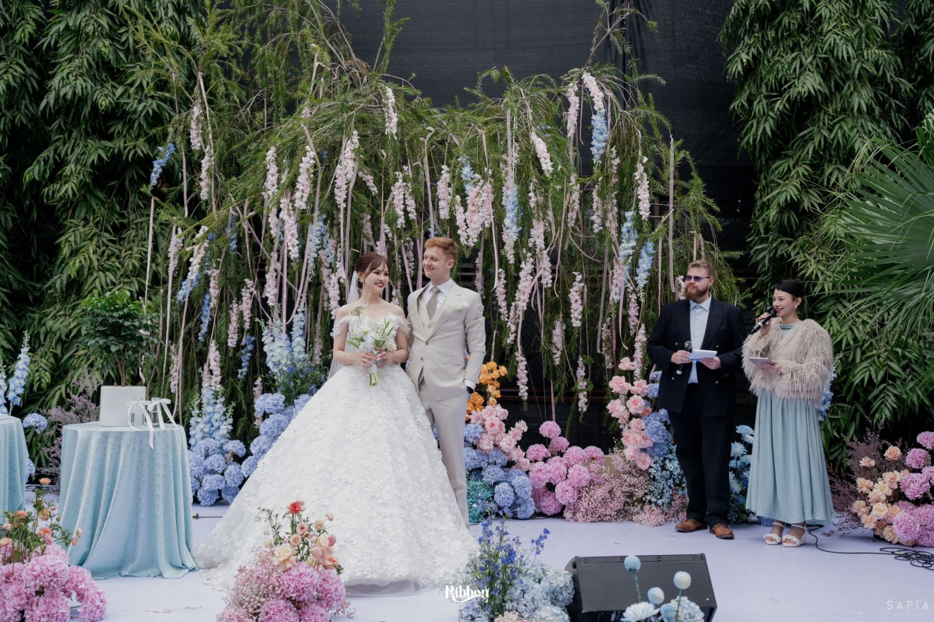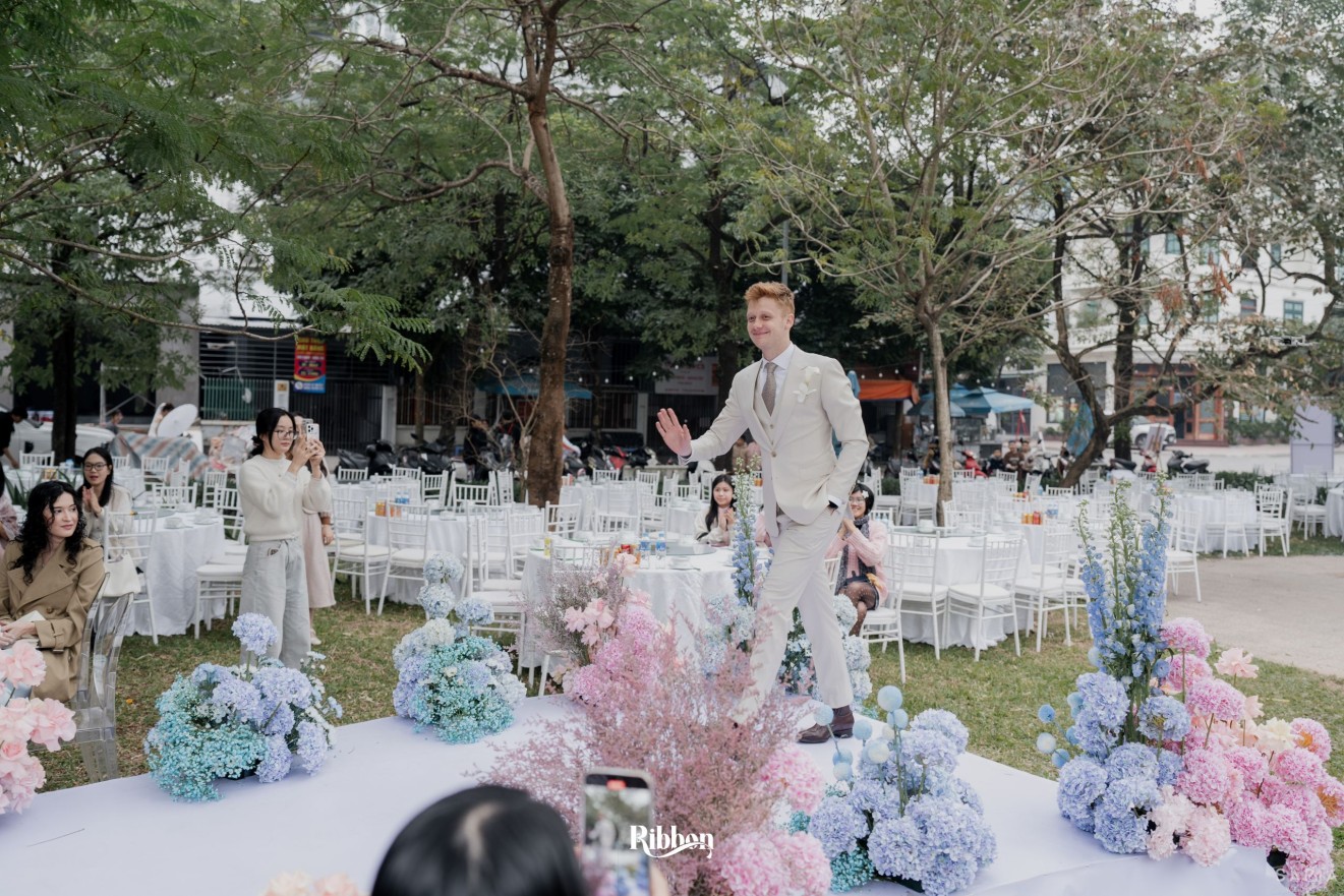 - Love story: Ánh xanh dịu không phải là màu xanh rực rỡ, mà là sắc xanh của sự tin tưởng, của bình yên, của một tình yêu đã đủ trưởng thành để không cần nói quá nhiều. Loài hoa chủ đạo của concept Delphinium xuất hiện một cách đầy dụng ý. Trong ngôn ngữ hoa, delphinium tượng trưng cho sự chân thành, bảo hộ và một tình yêu được chúc phúc. Những nhành hoa vươn cao, mảnh mai nhưng kiêu hãnh, như chính cách Linh & Mathew bước vào hành trình hôn nhân, dịu dàng, tin tưởng và luôn hướng về phía nhau.
