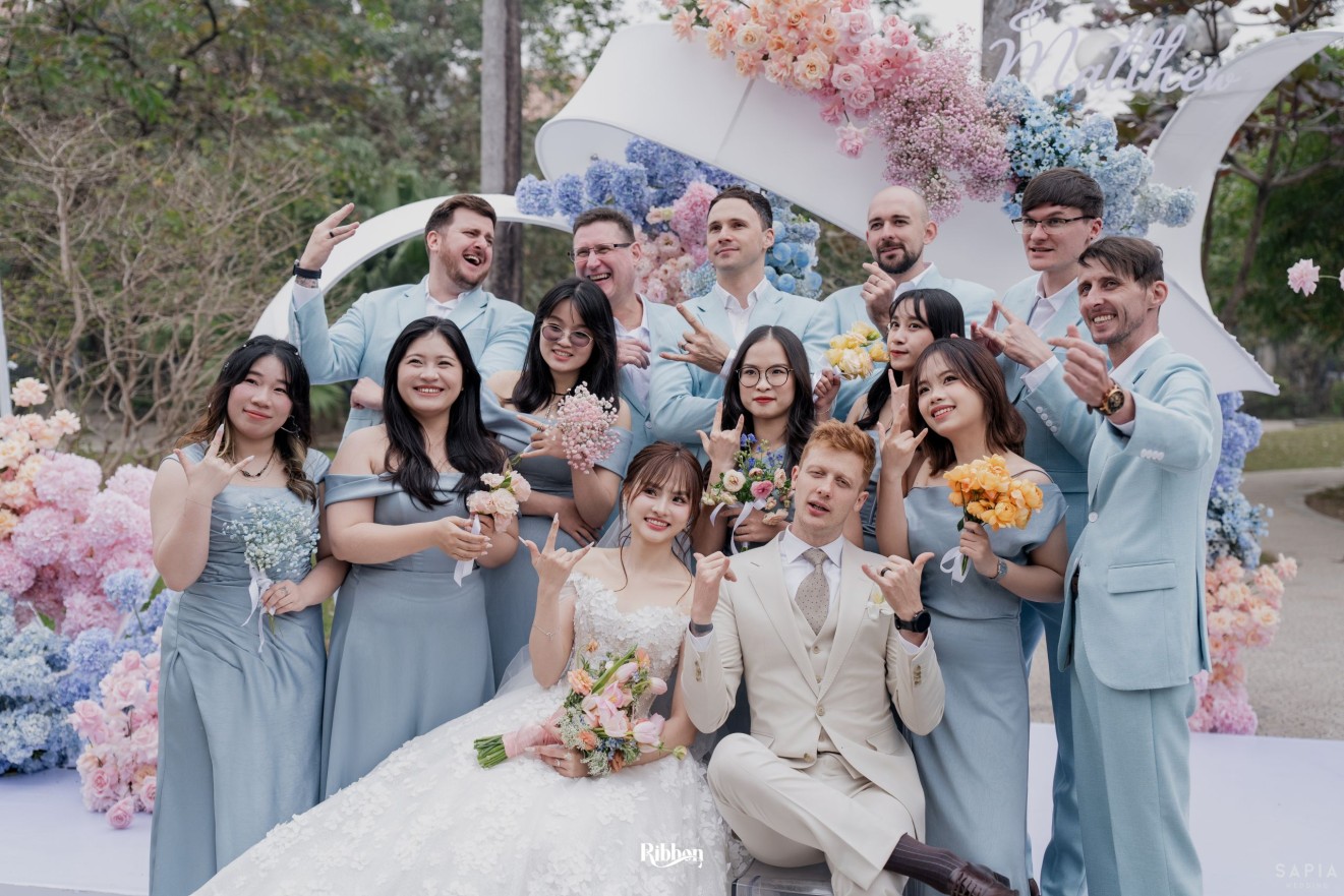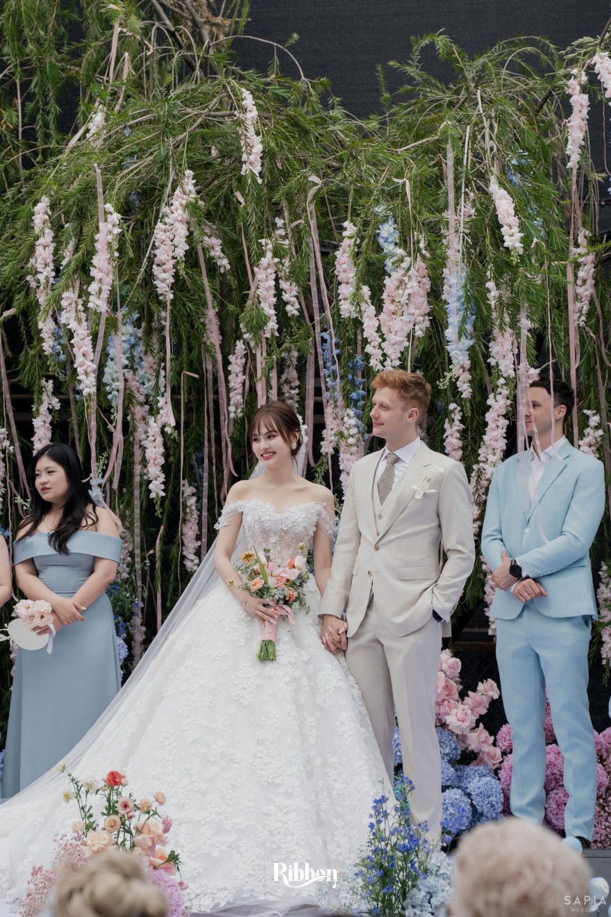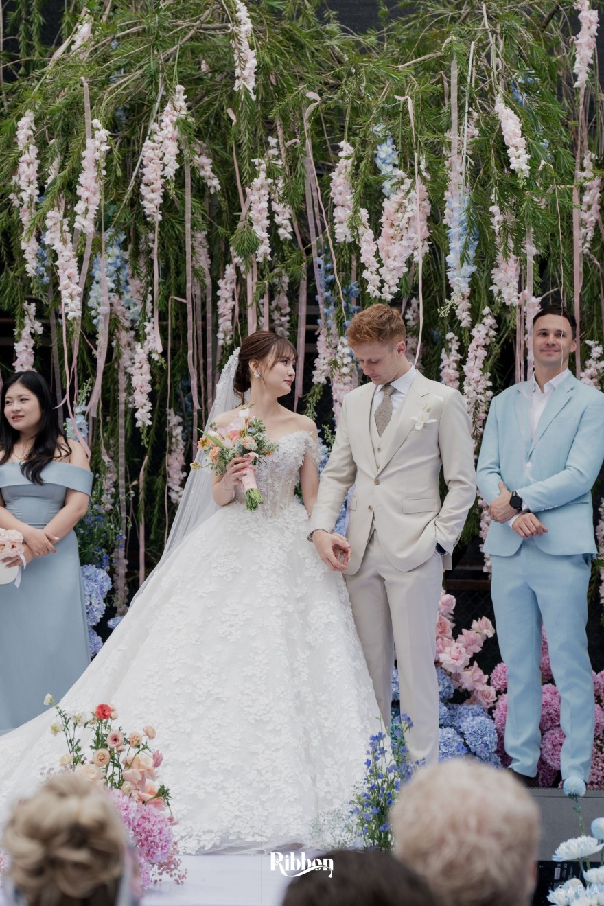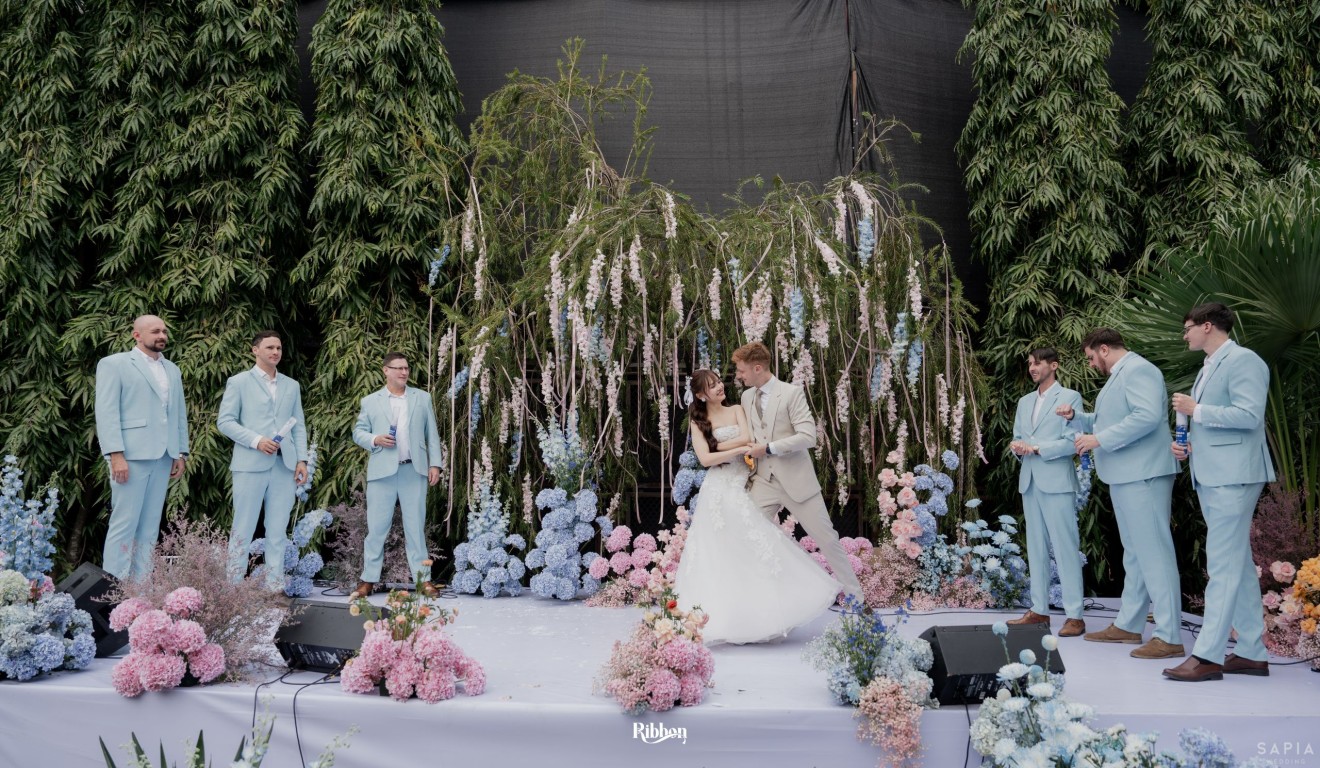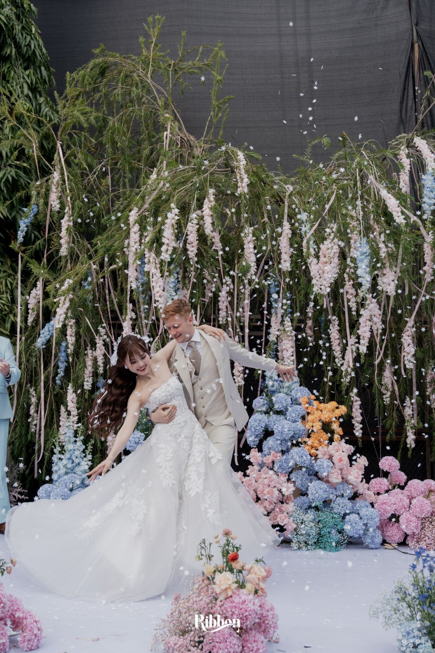 - Love story: Ánh xanh dịu không phải là màu xanh rực rỡ, mà là sắc xanh của sự tin tưởng, của bình yên, của một tình yêu đã đủ trưởng thành để không cần nói quá nhiều. Loài hoa chủ đạo của concept Delphinium xuất hiện một cách đầy dụng ý. Trong ngôn ngữ hoa, delphinium tượng trưng cho sự chân thành, bảo hộ và một tình yêu được chúc phúc. Những nhành hoa vươn cao, mảnh mai nhưng kiêu hãnh, như chính cách Linh & Mathew bước vào hành trình hôn nhân, dịu dàng, tin tưởng và luôn hướng về phía nhau.