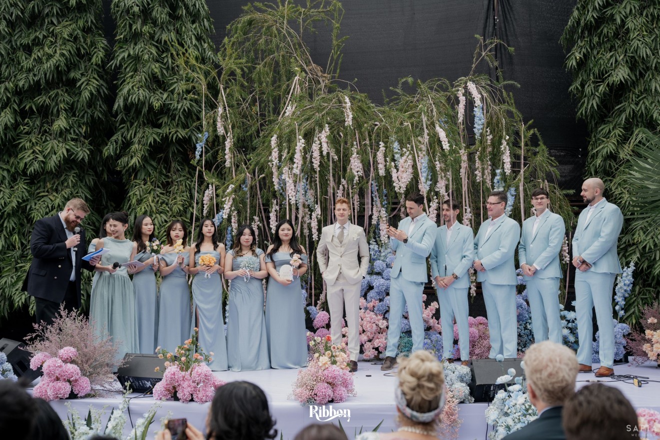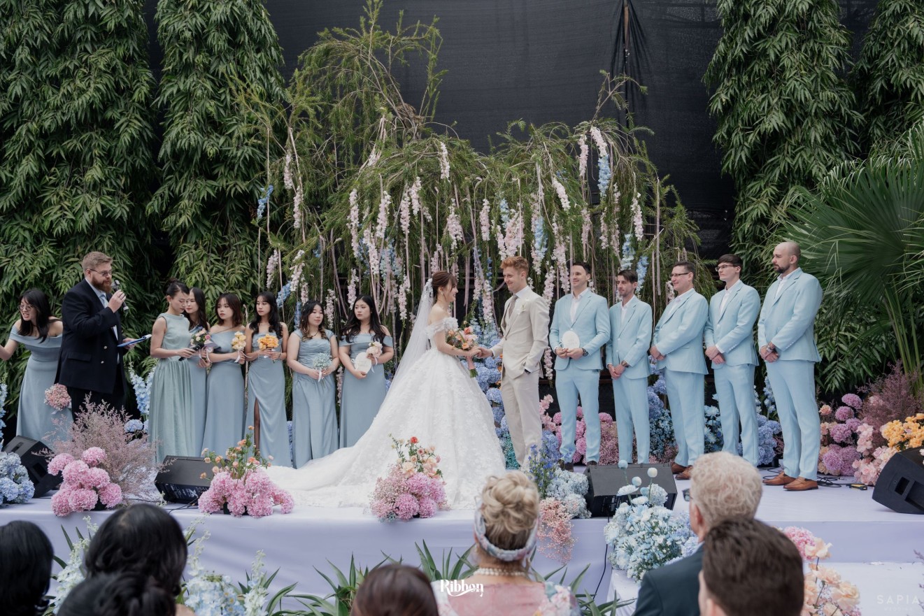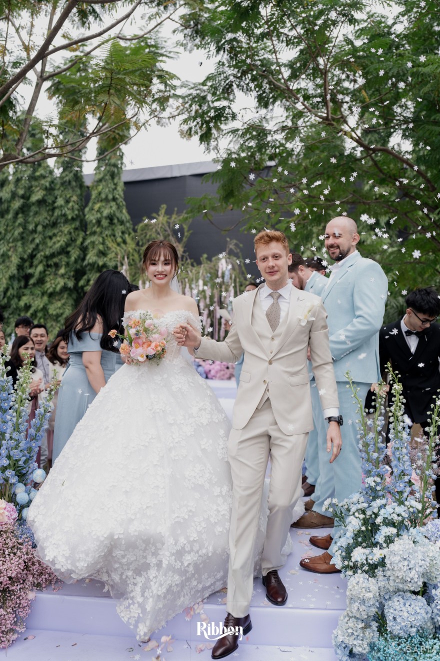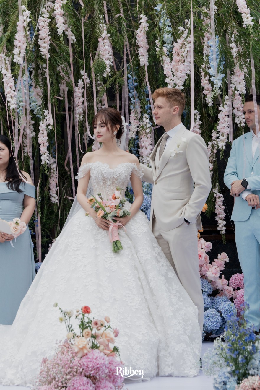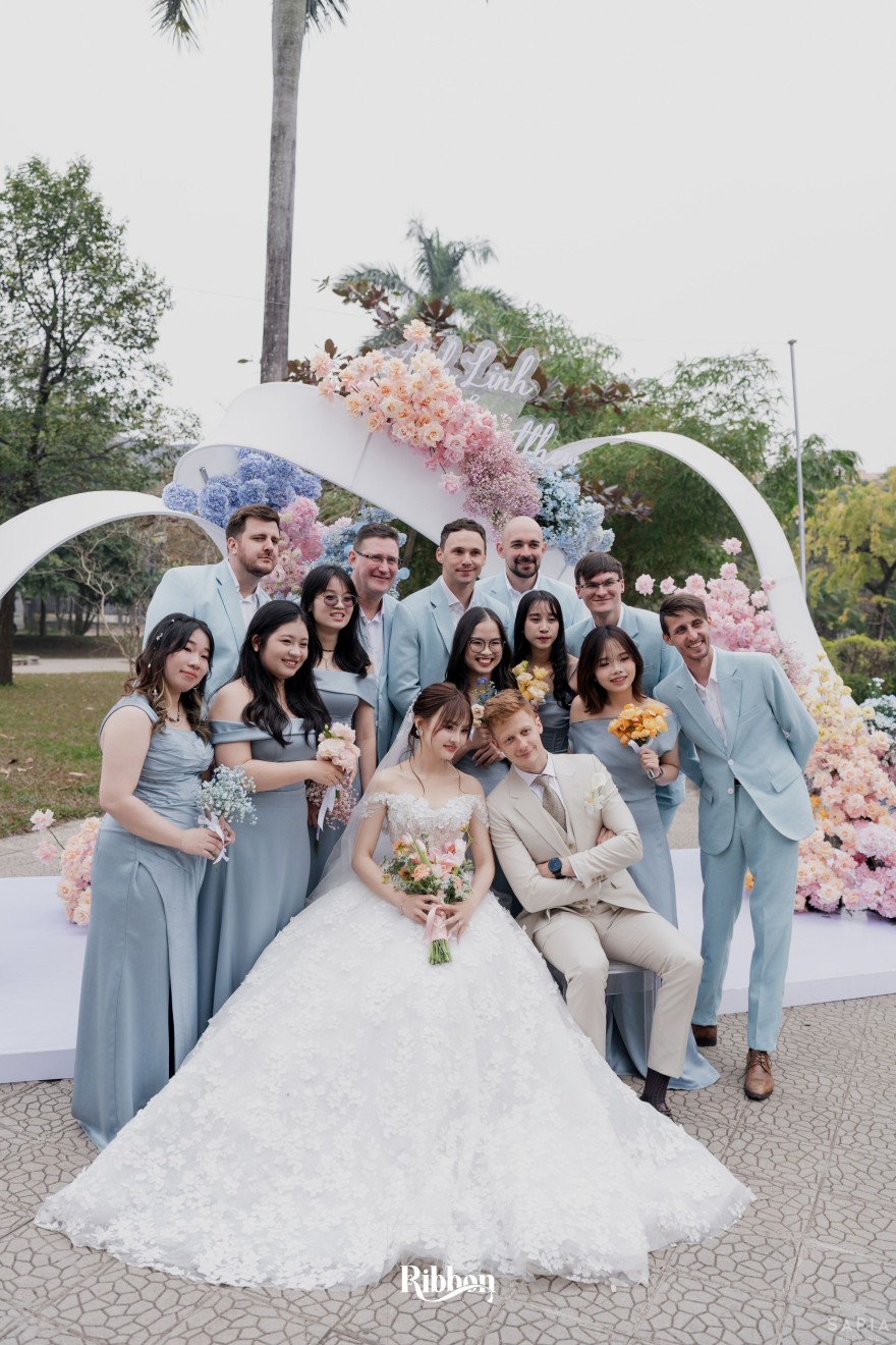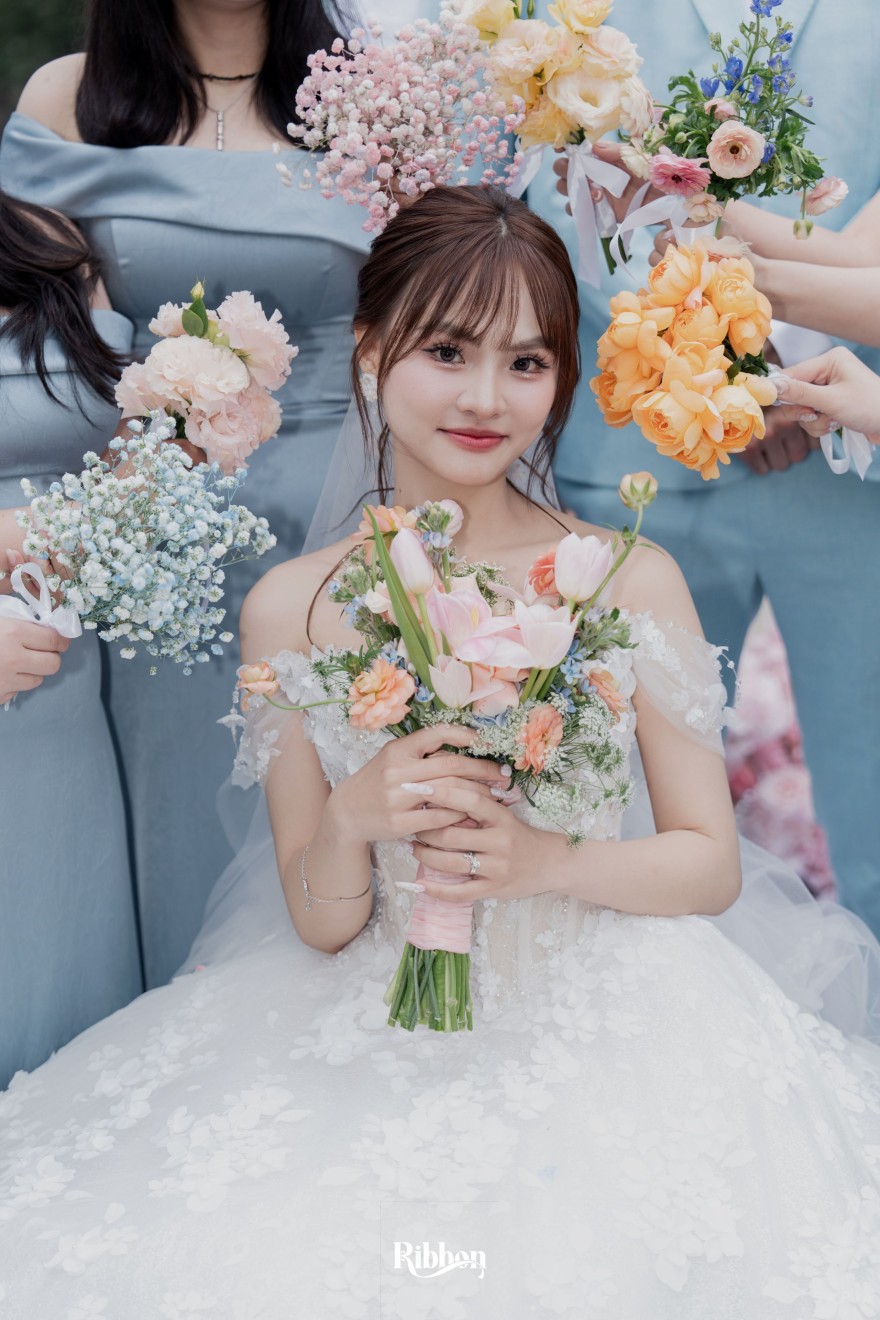 - Love story: Ánh xanh dịu không phải là màu xanh rực rỡ, mà là sắc xanh của sự tin tưởng, của bình yên, của một tình yêu đã đủ trưởng thành để không cần nói quá nhiều. Loài hoa chủ đạo của concept Delphinium xuất hiện một cách đầy dụng ý. Trong ngôn ngữ hoa, delphinium tượng trưng cho sự chân thành, bảo hộ và một tình yêu được chúc phúc. Những nhành hoa vươn cao, mảnh mai nhưng kiêu hãnh, như chính cách Linh & Mathew bước vào hành trình hôn nhân, dịu dàng, tin tưởng và luôn hướng về phía nhau.