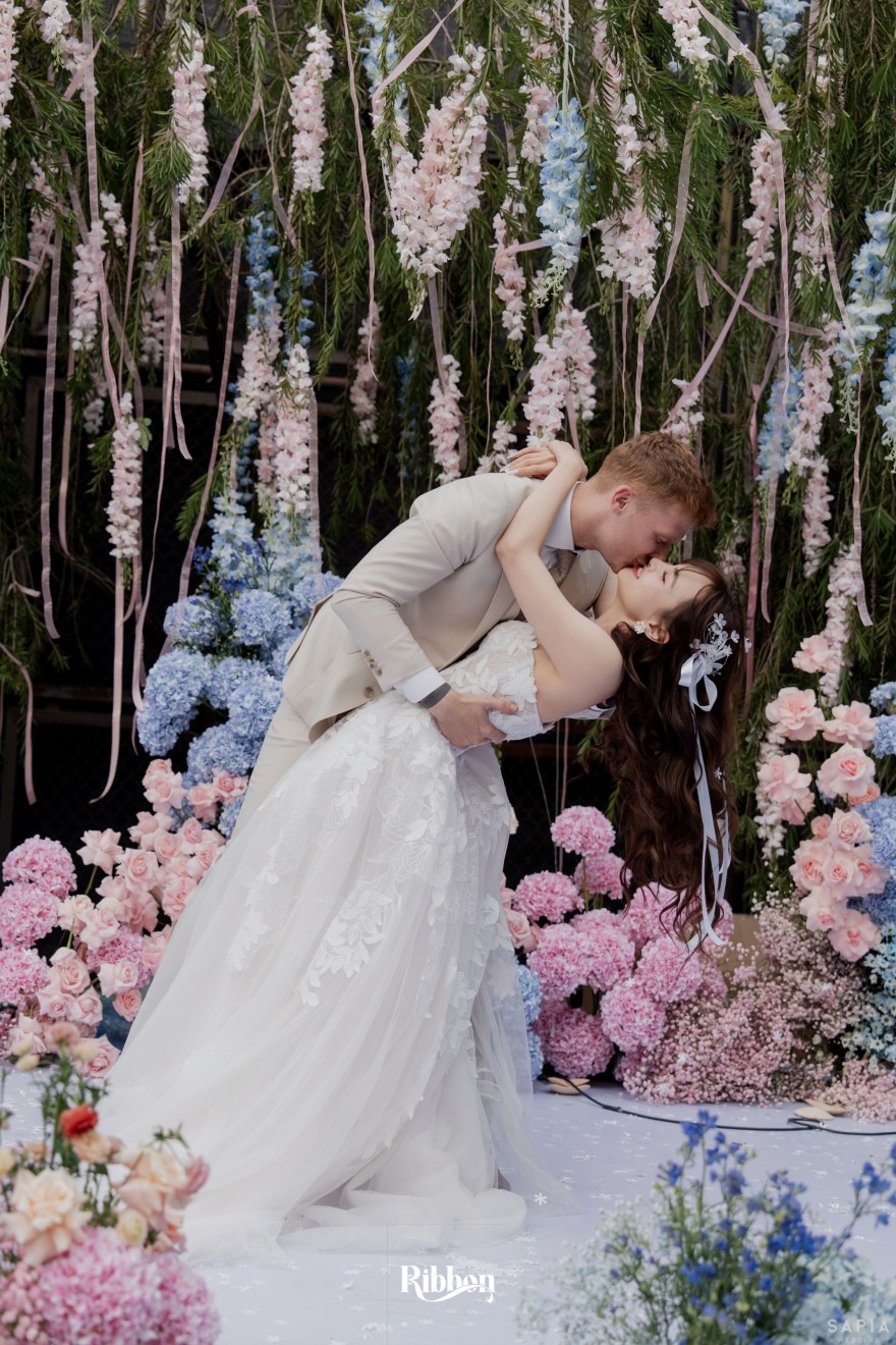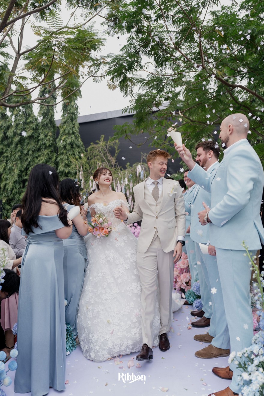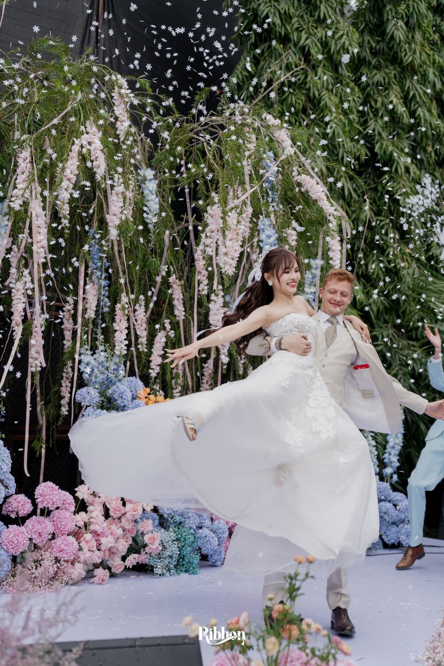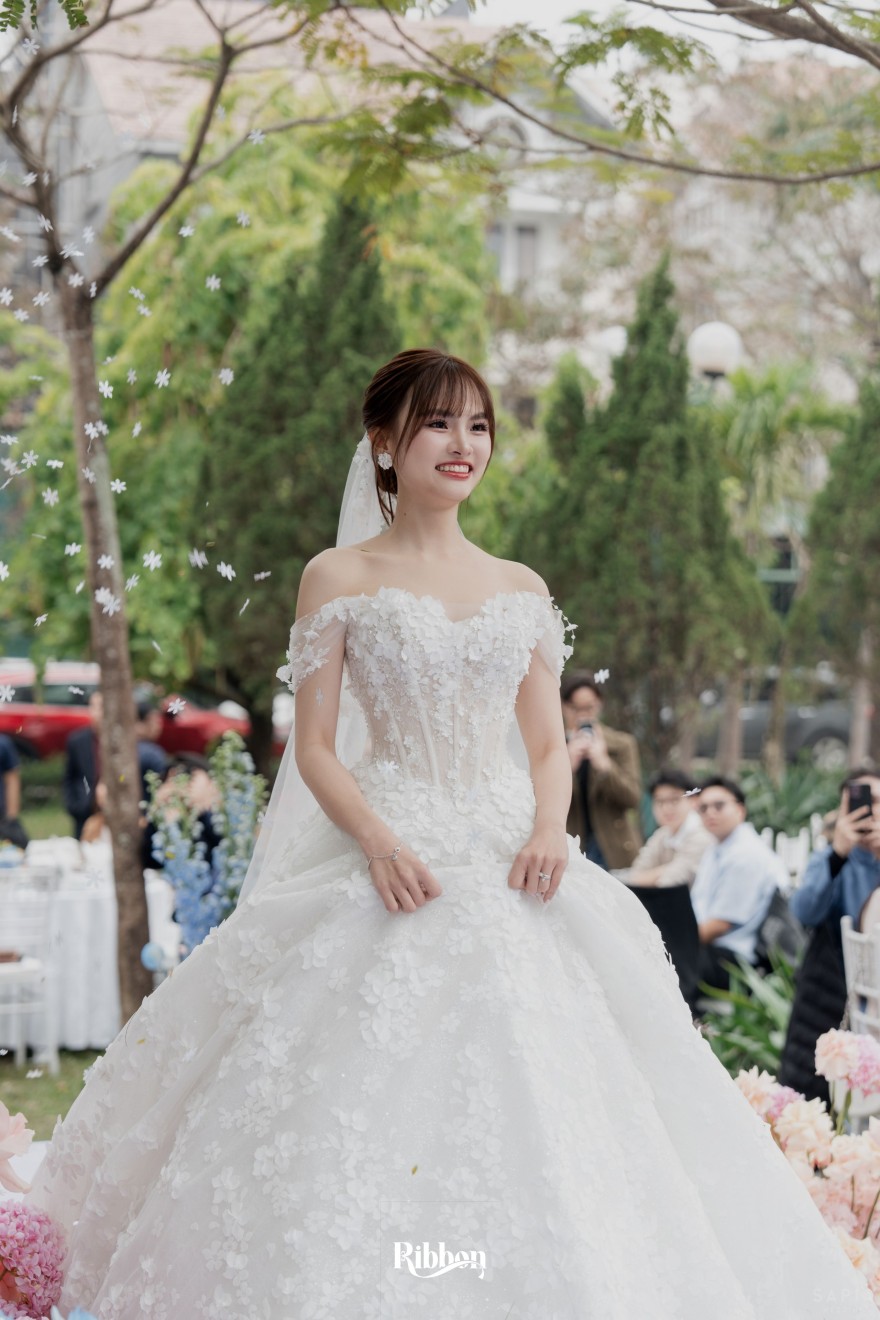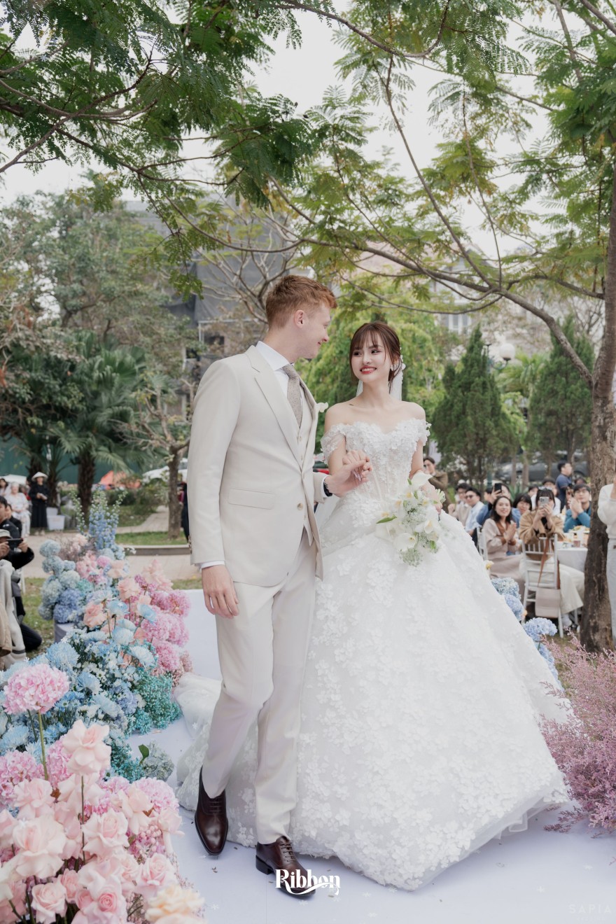 - Love story: Ánh xanh dịu không phải là màu xanh rực rỡ, mà là sắc xanh của sự tin tưởng, của bình yên, của một tình yêu đã đủ trưởng thành để không cần nói quá nhiều. Loài hoa chủ đạo của concept Delphinium xuất hiện một cách đầy dụng ý. Trong ngôn ngữ hoa, delphinium tượng trưng cho sự chân thành, bảo hộ và một tình yêu được chúc phúc. Những nhành hoa vươn cao, mảnh mai nhưng kiêu hãnh, như chính cách Linh & Mathew bước vào hành trình hôn nhân, dịu dàng, tin tưởng và luôn hướng về phía nhau.