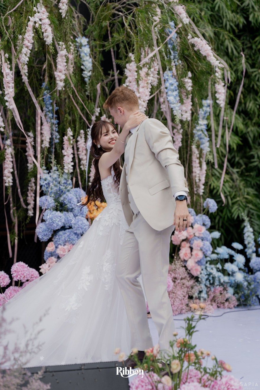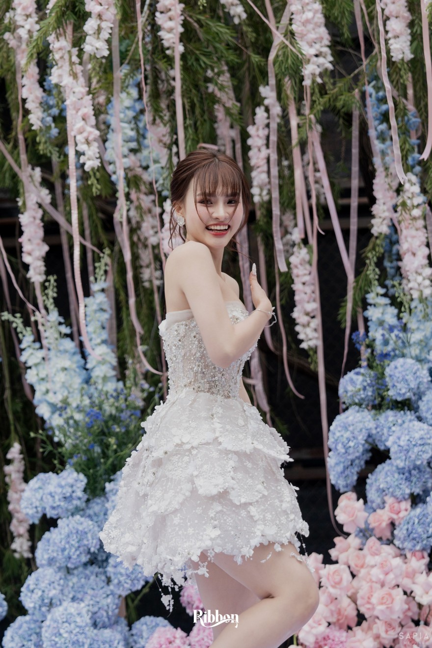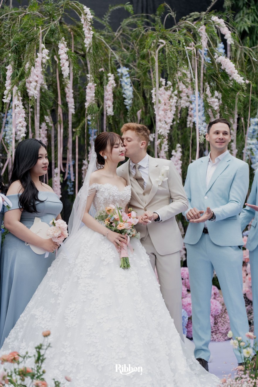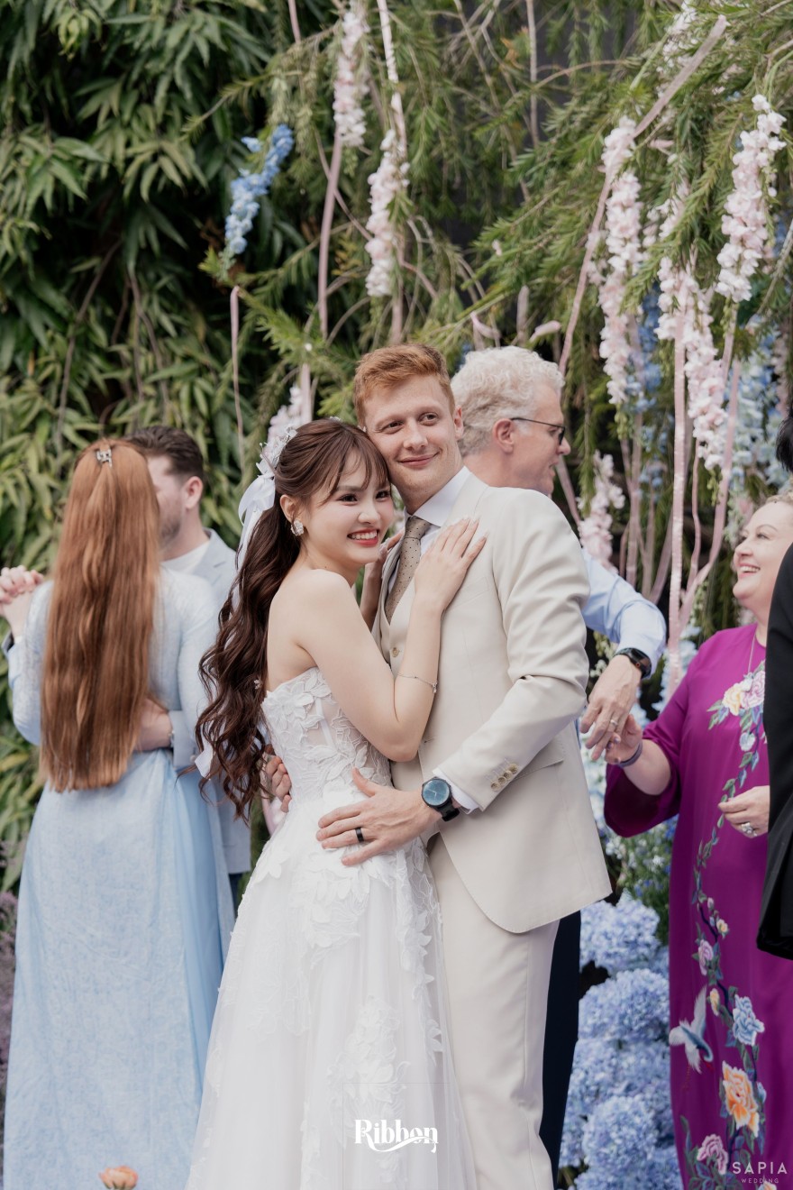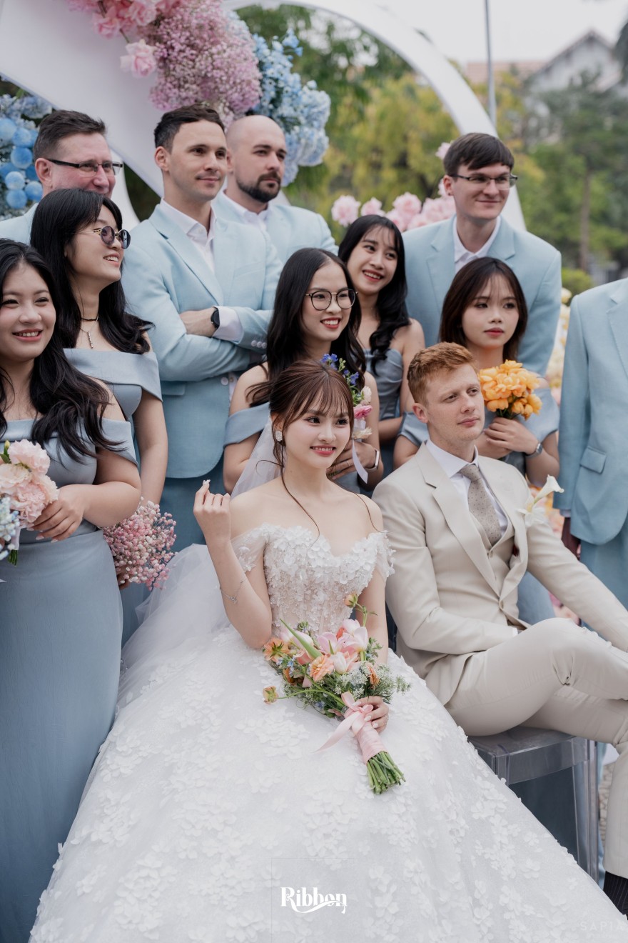- Love story: Ánh xanh dịu không phải là màu xanh rực rỡ, mà là sắc xanh của sự tin tưởng, của bình yên, của một tình yêu đã đủ trưởng thành để không cần nói quá nhiều. Loài hoa chủ đạo của concept Delphinium xuất hiện một cách đầy dụng ý. Trong ngôn ngữ hoa, delphinium tượng trưng cho sự chân thành, bảo hộ và một tình yêu được chúc phúc. Những nhành hoa vươn cao, mảnh mai nhưng kiêu hãnh, như chính cách Linh & Mathew bước vào hành trình hôn nhân, dịu dàng, tin tưởng và luôn hướng về phía nhau.