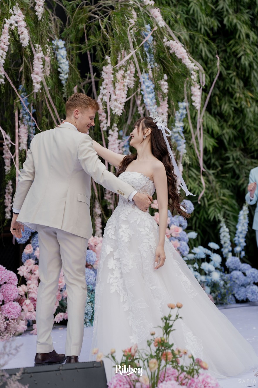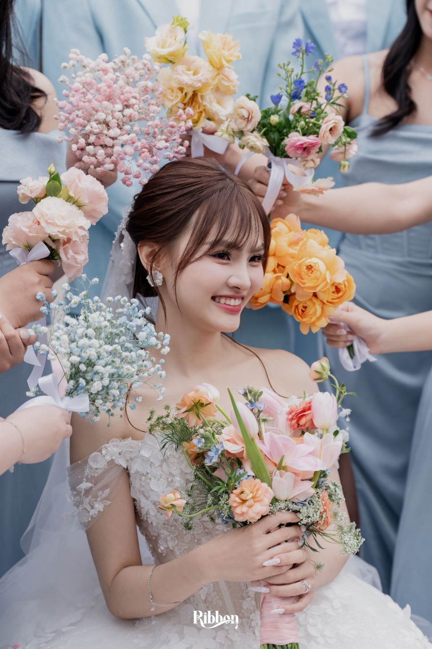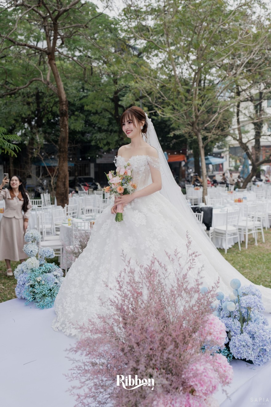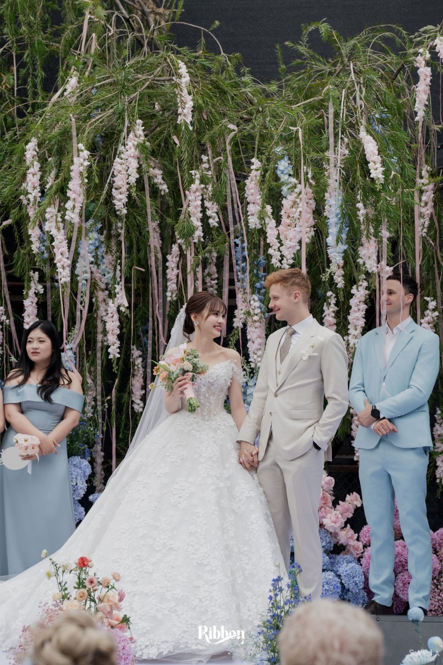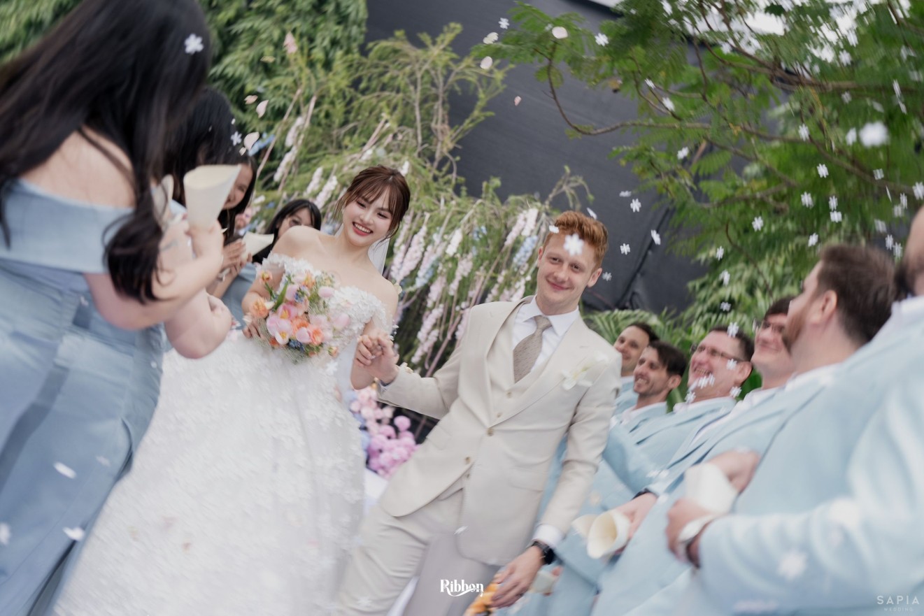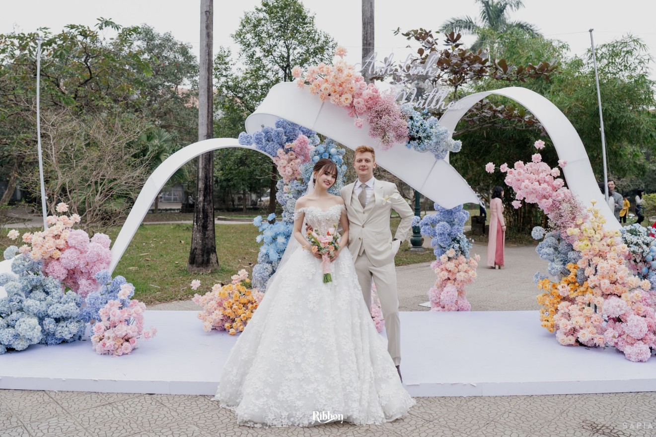- Love story: Ánh xanh dịu không phải là màu xanh rực rỡ, mà là sắc xanh của sự tin tưởng, của bình yên, của một tình yêu đã đủ trưởng thành để không cần nói quá nhiều. Loài hoa chủ đạo của concept Delphinium xuất hiện một cách đầy dụng ý. Trong ngôn ngữ hoa, delphinium tượng trưng cho sự chân thành, bảo hộ và một tình yêu được chúc phúc. Những nhành hoa vươn cao, mảnh mai nhưng kiêu hãnh, như chính cách Linh & Mathew bước vào hành trình hôn nhân, dịu dàng, tin tưởng và luôn hướng về phía nhau.