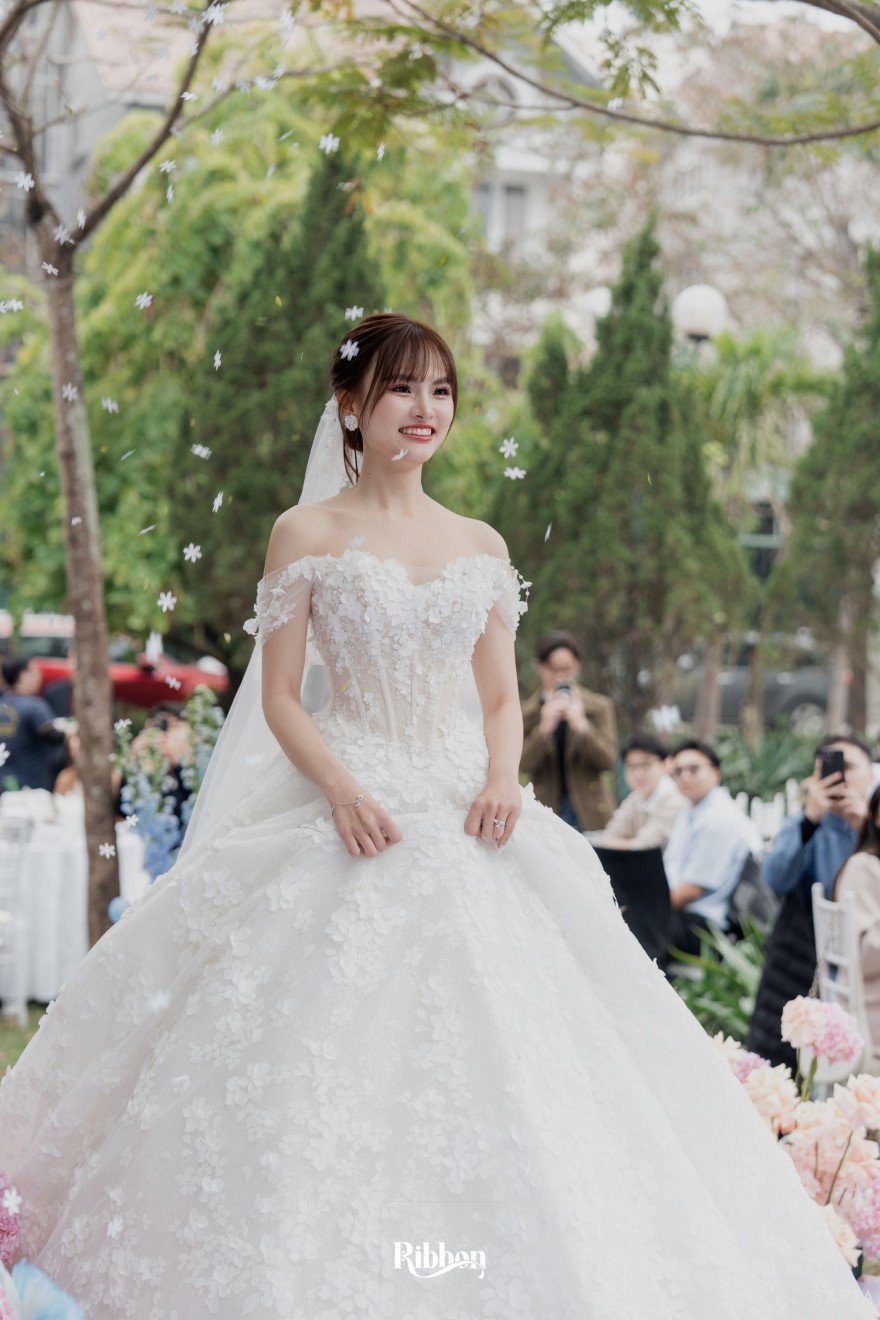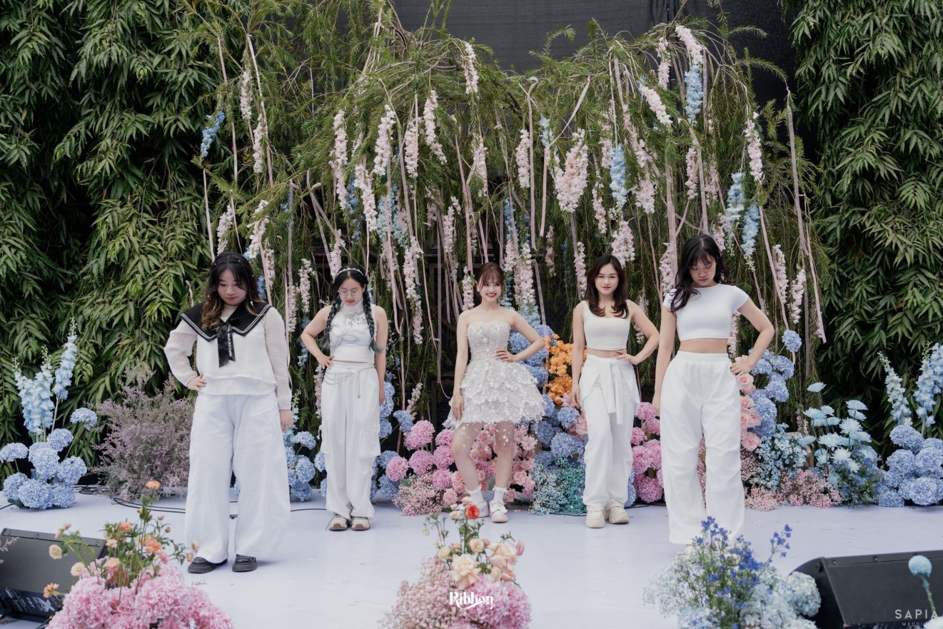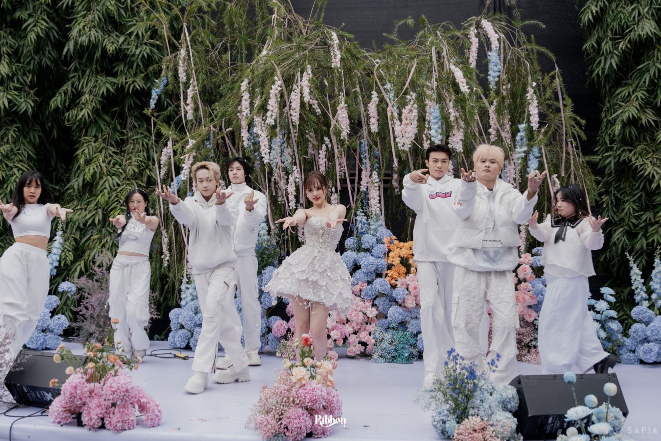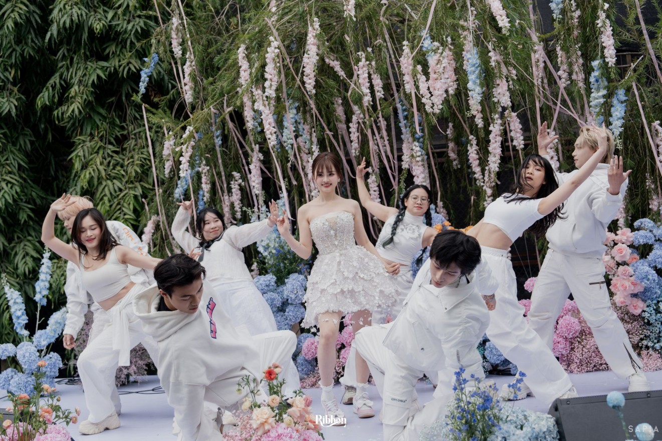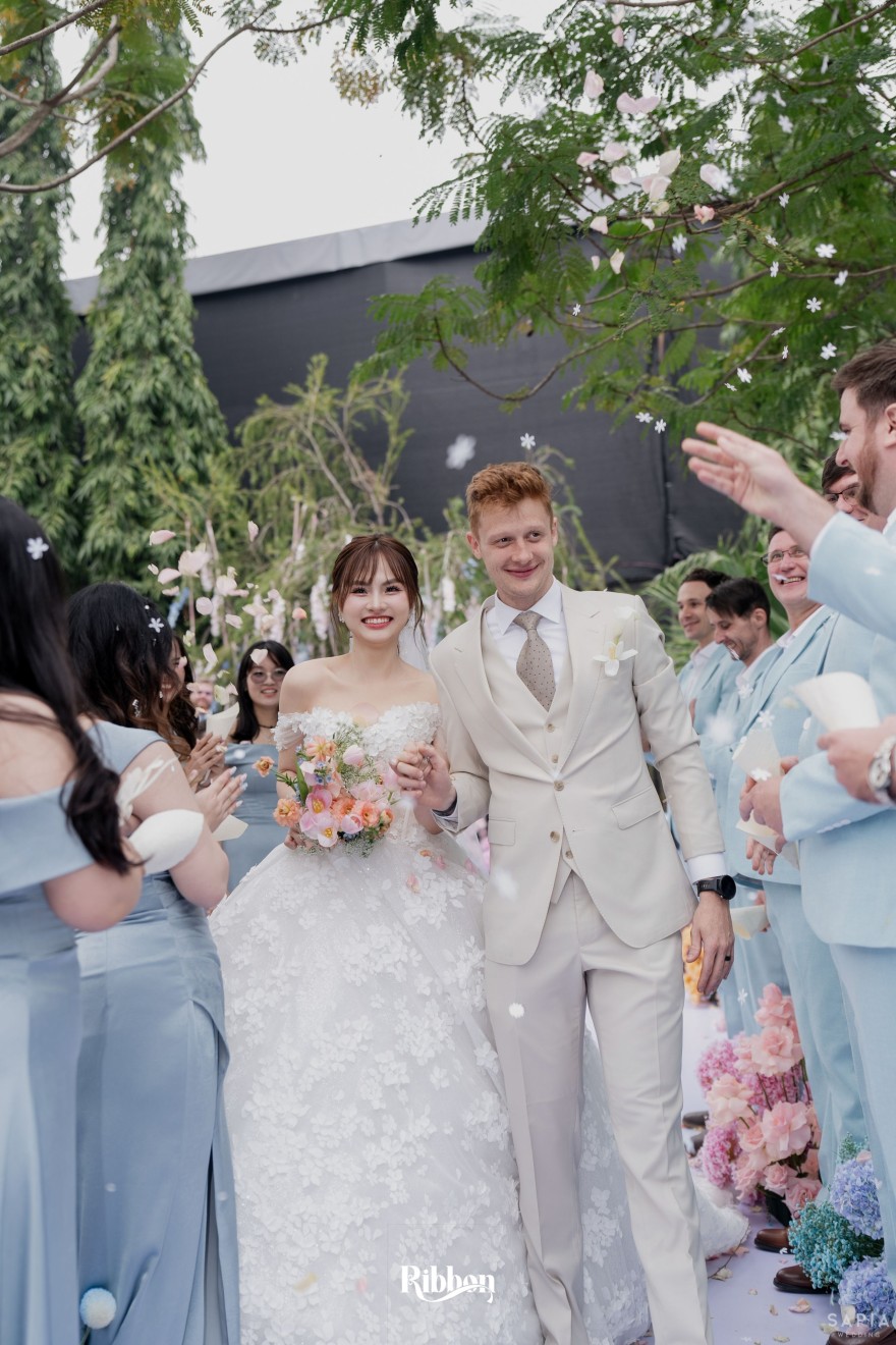 - Love story: Ánh xanh dịu không phải là màu xanh rực rỡ, mà là sắc xanh của sự tin tưởng, của bình yên, của một tình yêu đã đủ trưởng thành để không cần nói quá nhiều. Loài hoa chủ đạo của concept Delphinium xuất hiện một cách đầy dụng ý. Trong ngôn ngữ hoa, delphinium tượng trưng cho sự chân thành, bảo hộ và một tình yêu được chúc phúc. Những nhành hoa vươn cao, mảnh mai nhưng kiêu hãnh, như chính cách Linh & Mathew bước vào hành trình hôn nhân, dịu dàng, tin tưởng và luôn hướng về phía nhau.