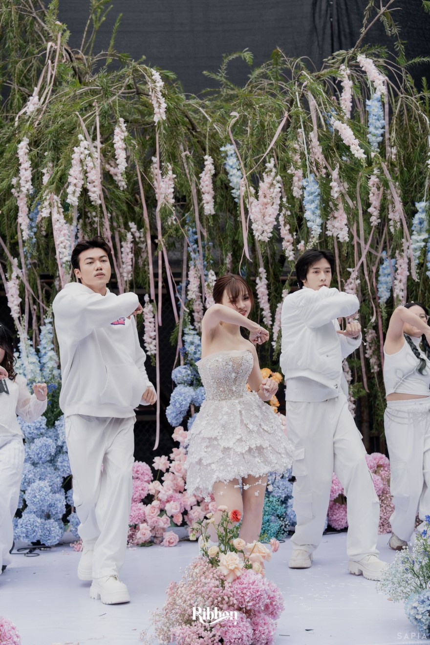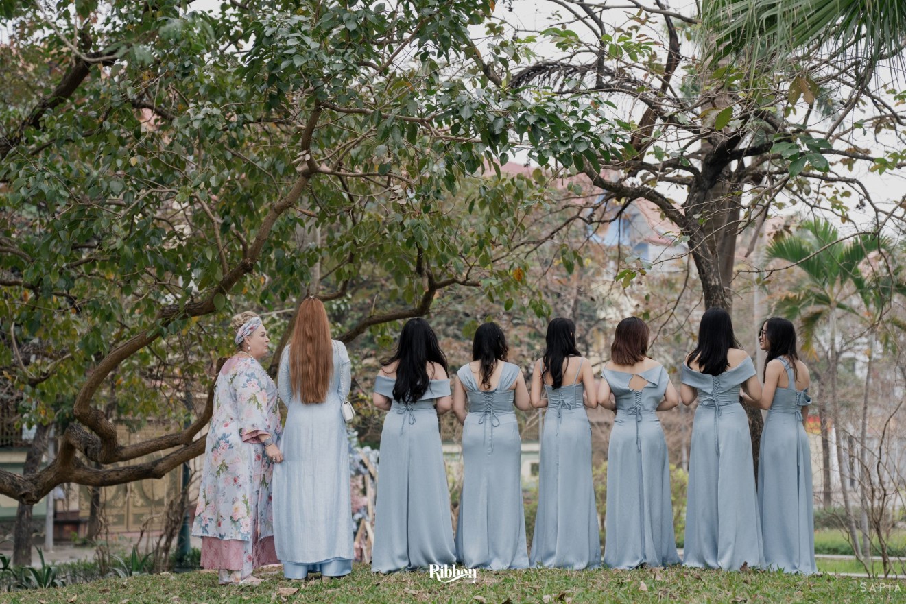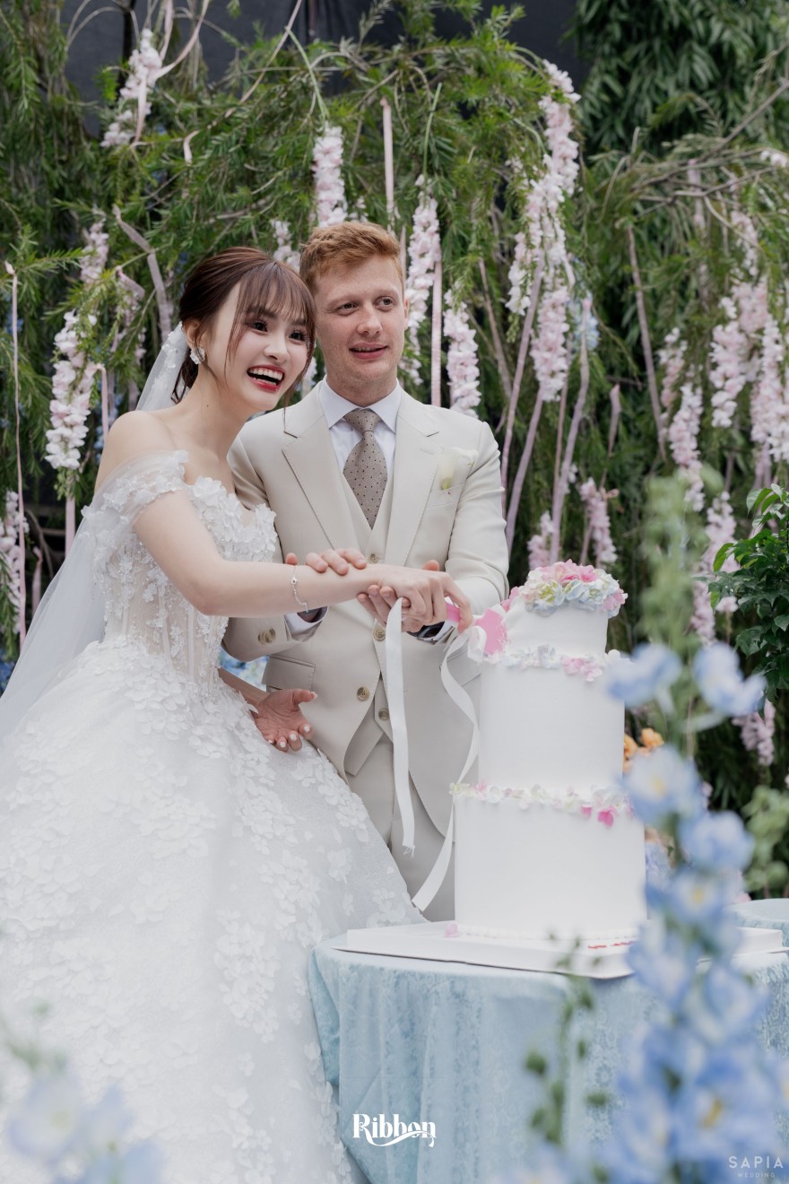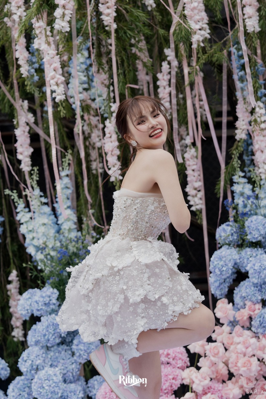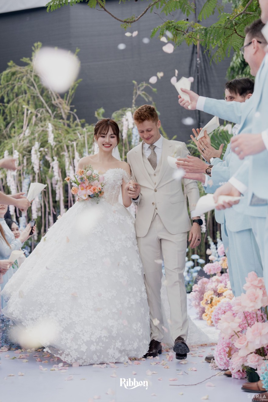 - Love story: Ánh xanh dịu không phải là màu xanh rực rỡ, mà là sắc xanh của sự tin tưởng, của bình yên, của một tình yêu đã đủ trưởng thành để không cần nói quá nhiều. Loài hoa chủ đạo của concept Delphinium xuất hiện một cách đầy dụng ý. Trong ngôn ngữ hoa, delphinium tượng trưng cho sự chân thành, bảo hộ và một tình yêu được chúc phúc. Những nhành hoa vươn cao, mảnh mai nhưng kiêu hãnh, như chính cách Linh & Mathew bước vào hành trình hôn nhân, dịu dàng, tin tưởng và luôn hướng về phía nhau.