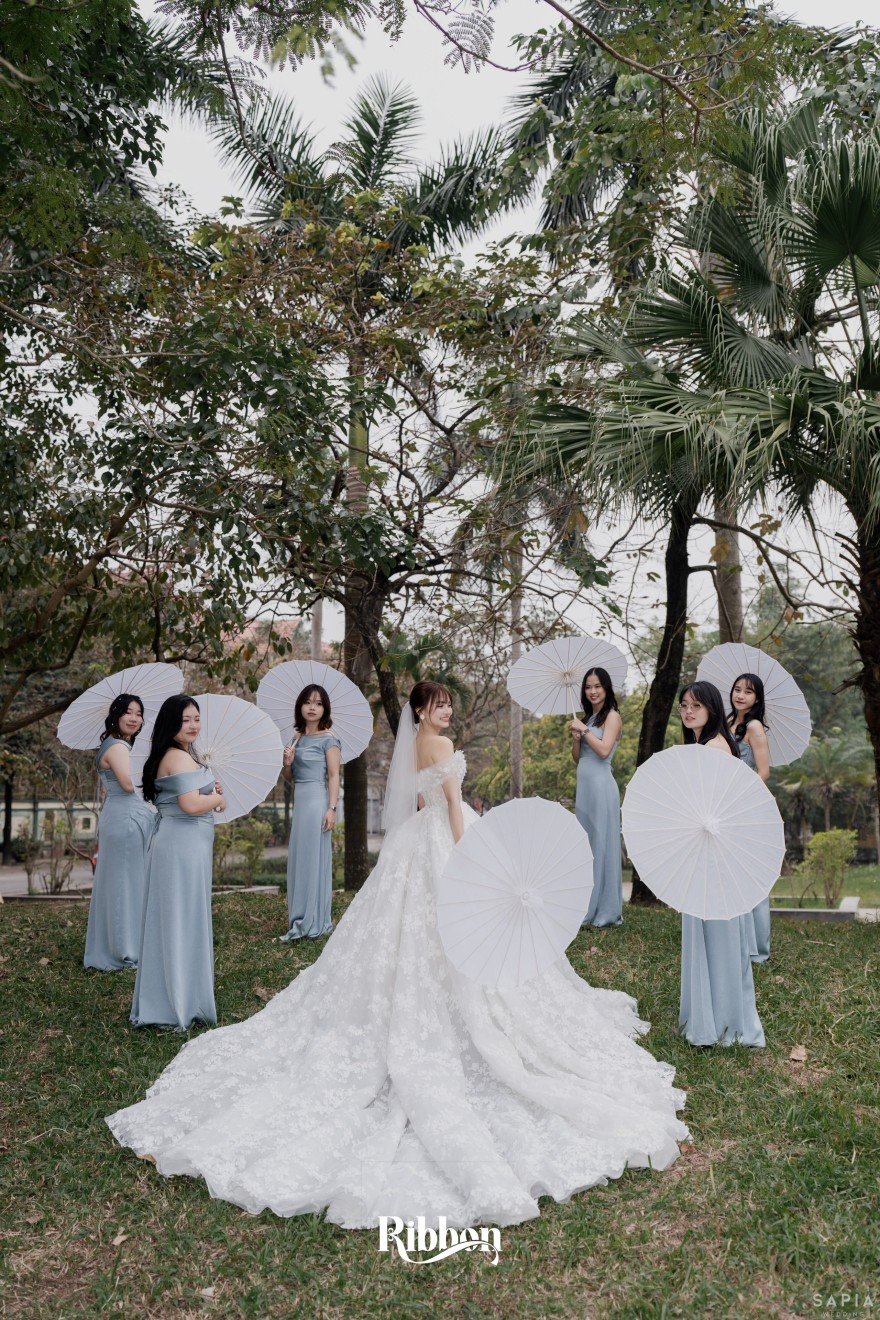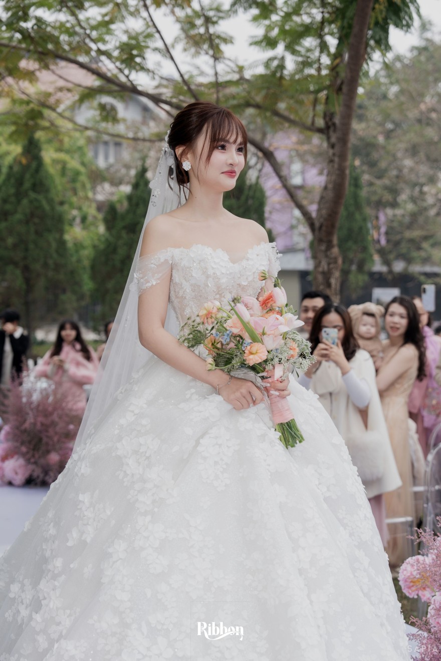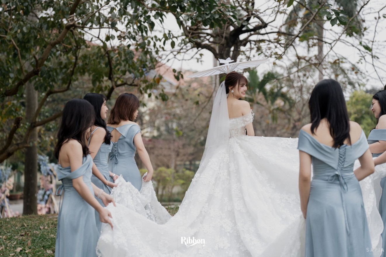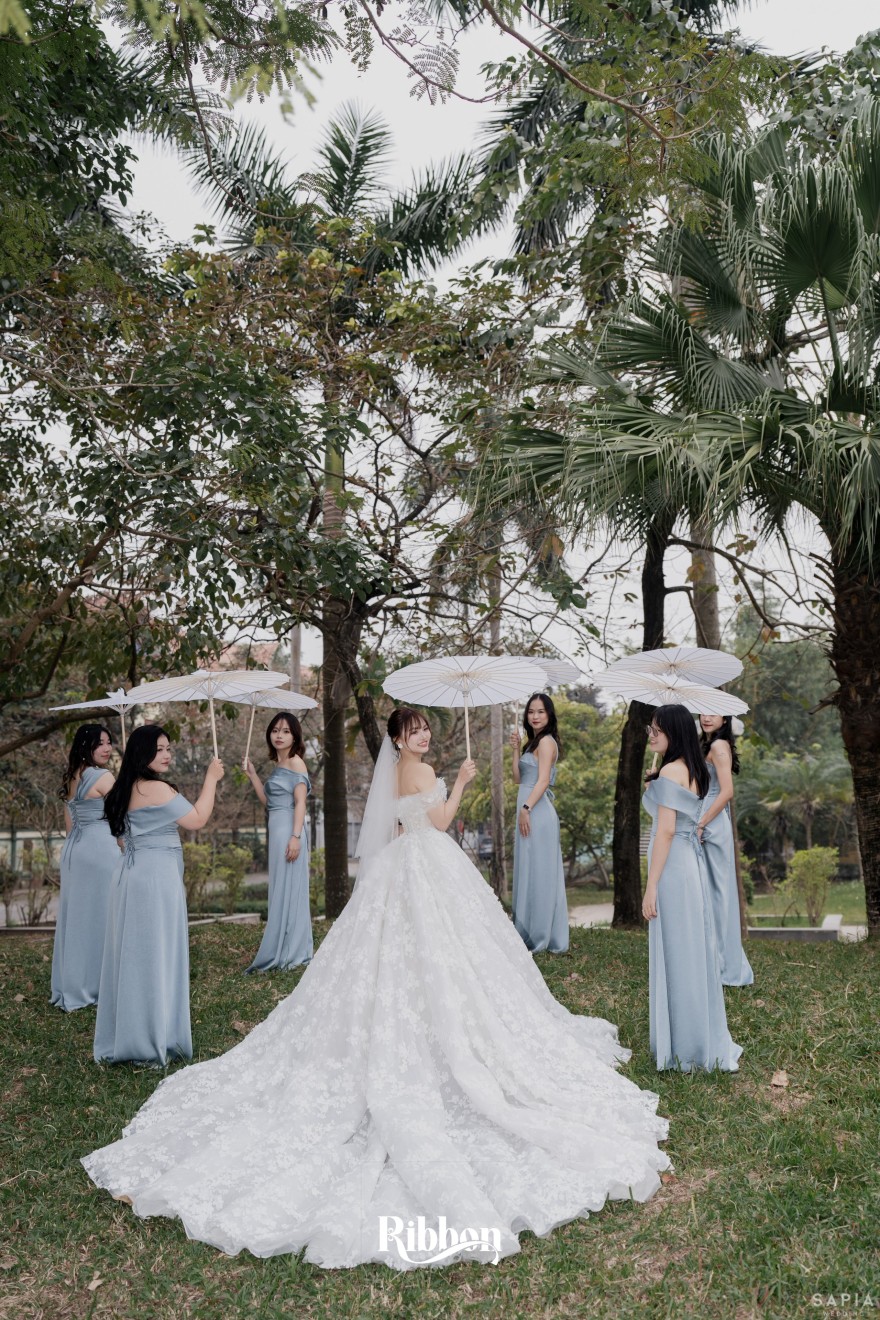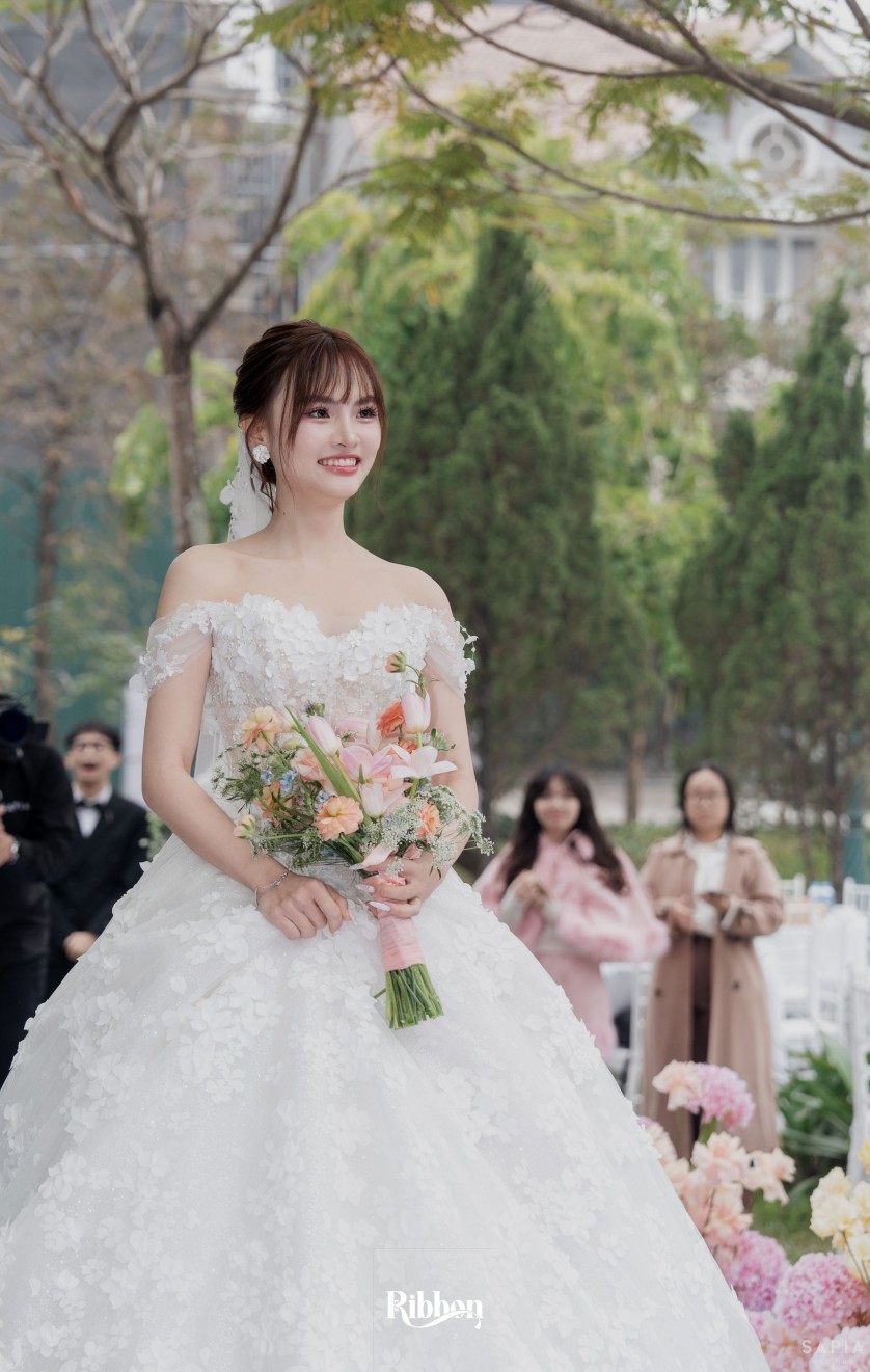 - Love story: Ánh xanh dịu không phải là màu xanh rực rỡ, mà là sắc xanh của sự tin tưởng, của bình yên, của một tình yêu đã đủ trưởng thành để không cần nói quá nhiều. Loài hoa chủ đạo của concept Delphinium xuất hiện một cách đầy dụng ý. Trong ngôn ngữ hoa, delphinium tượng trưng cho sự chân thành, bảo hộ và một tình yêu được chúc phúc. Những nhành hoa vươn cao, mảnh mai nhưng kiêu hãnh, như chính cách Linh & Mathew bước vào hành trình hôn nhân, dịu dàng, tin tưởng và luôn hướng về phía nhau.