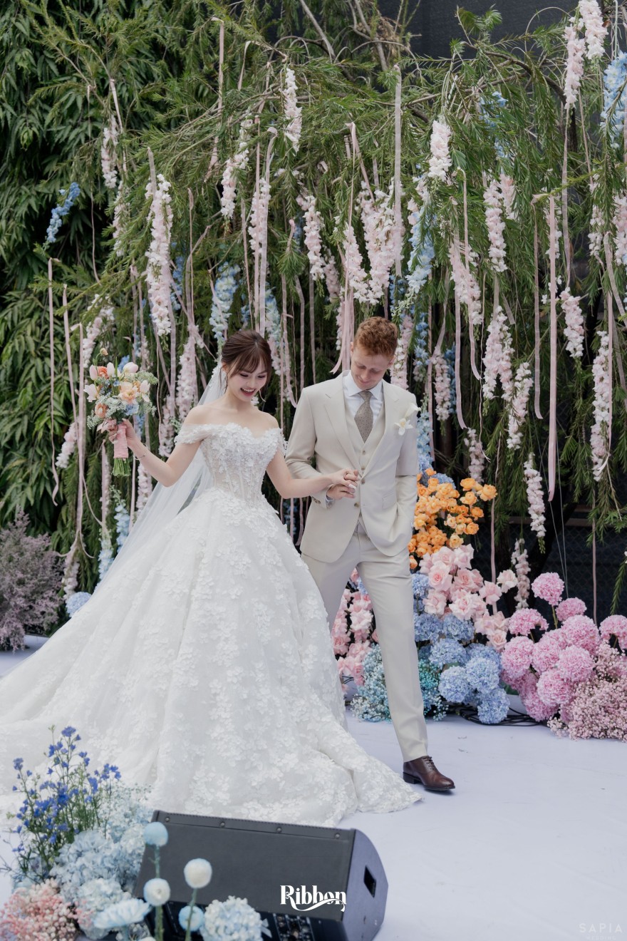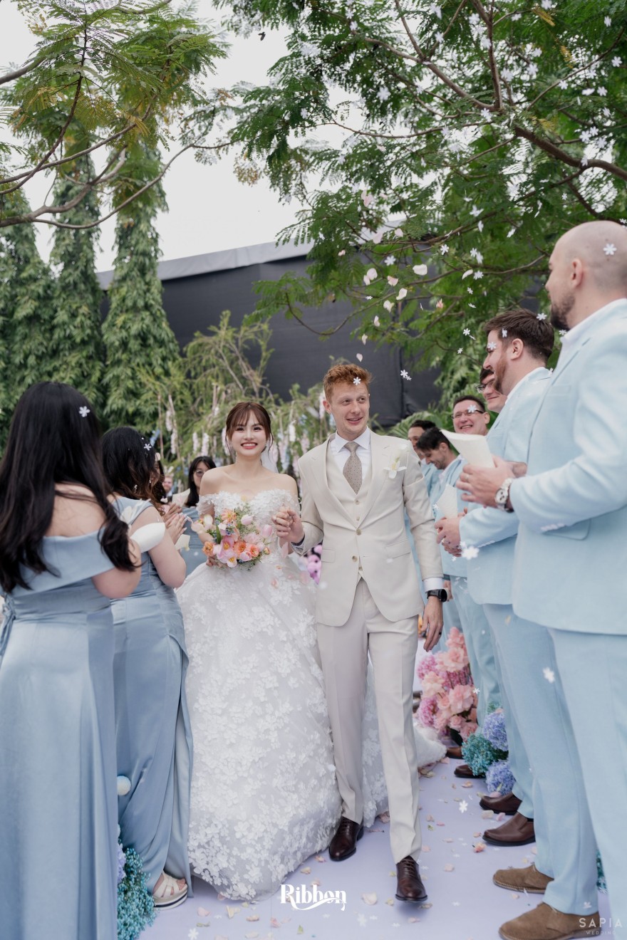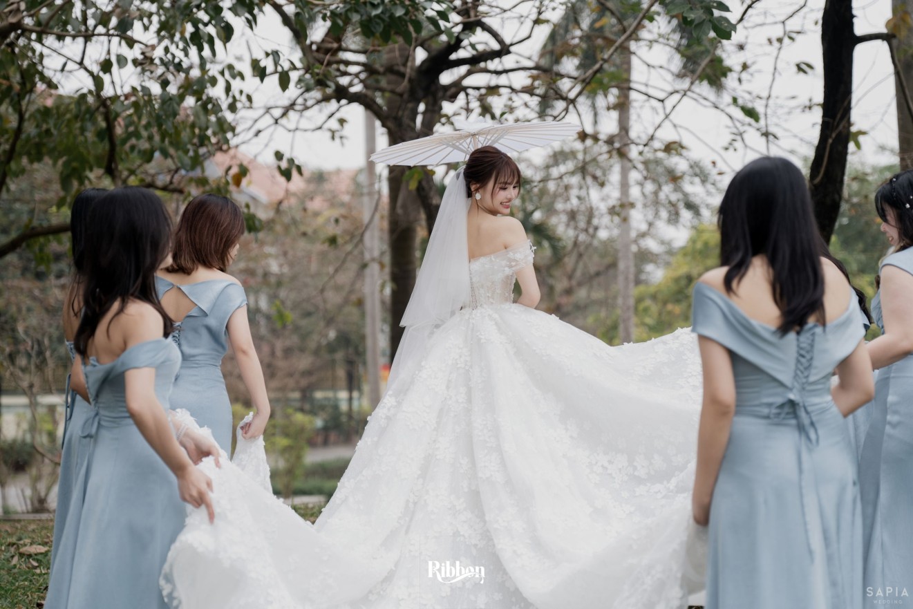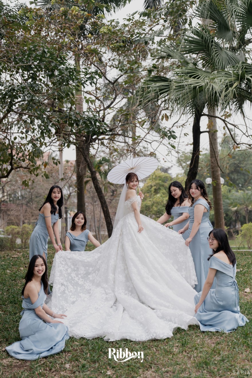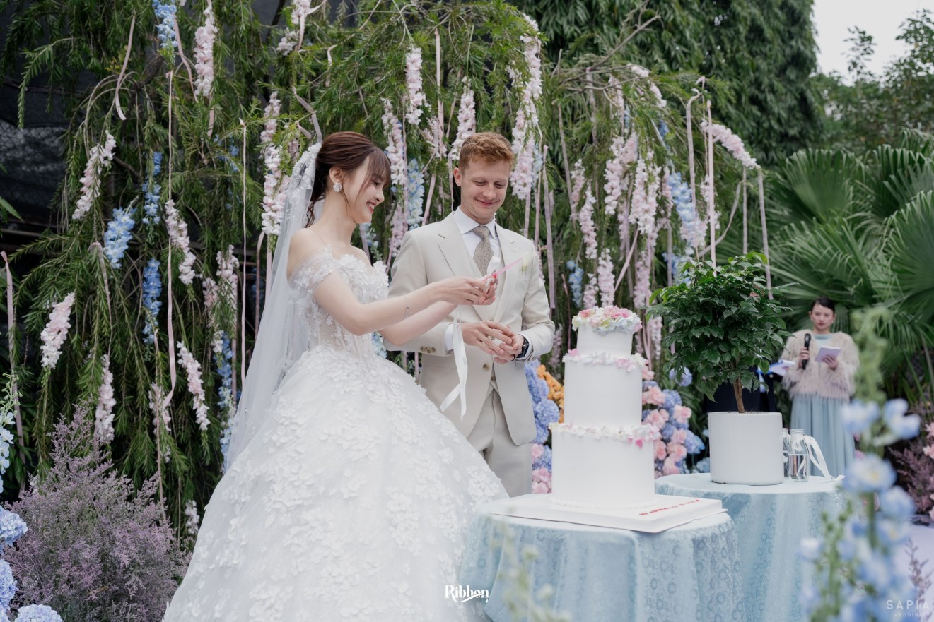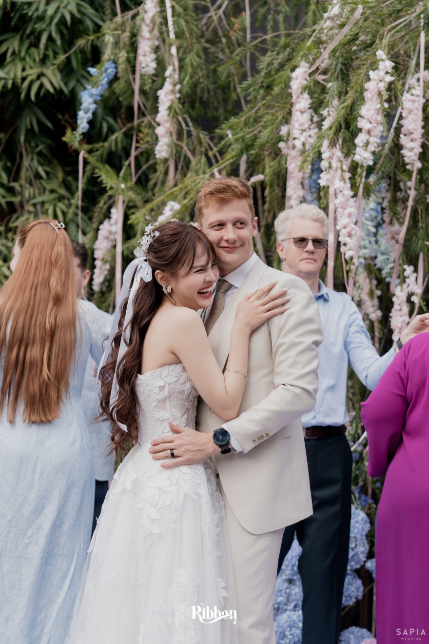 - Love story: Ánh xanh dịu không phải là màu xanh rực rỡ, mà là sắc xanh của sự tin tưởng, của bình yên, của một tình yêu đã đủ trưởng thành để không cần nói quá nhiều. Loài hoa chủ đạo của concept Delphinium xuất hiện một cách đầy dụng ý. Trong ngôn ngữ hoa, delphinium tượng trưng cho sự chân thành, bảo hộ và một tình yêu được chúc phúc. Những nhành hoa vươn cao, mảnh mai nhưng kiêu hãnh, như chính cách Linh & Mathew bước vào hành trình hôn nhân, dịu dàng, tin tưởng và luôn hướng về phía nhau.