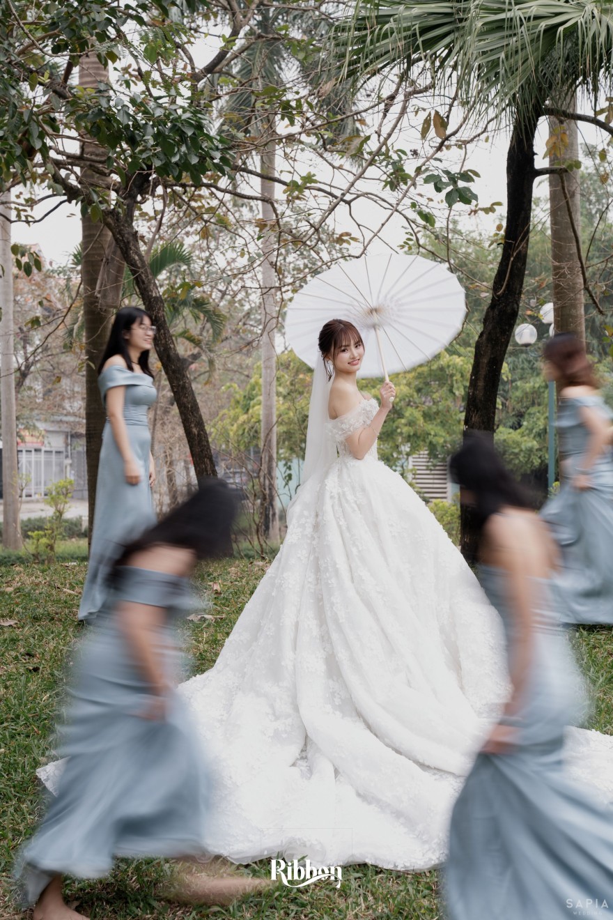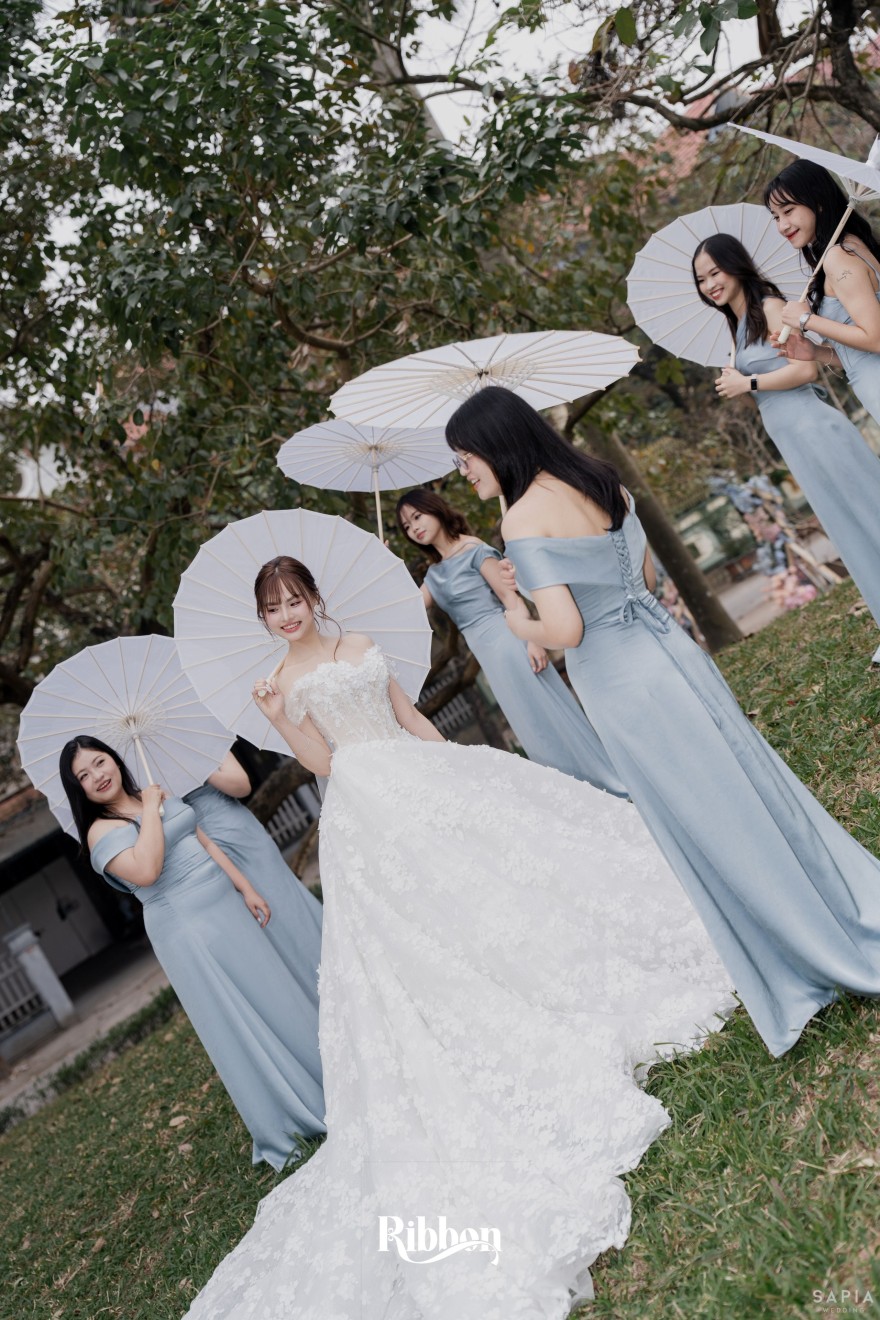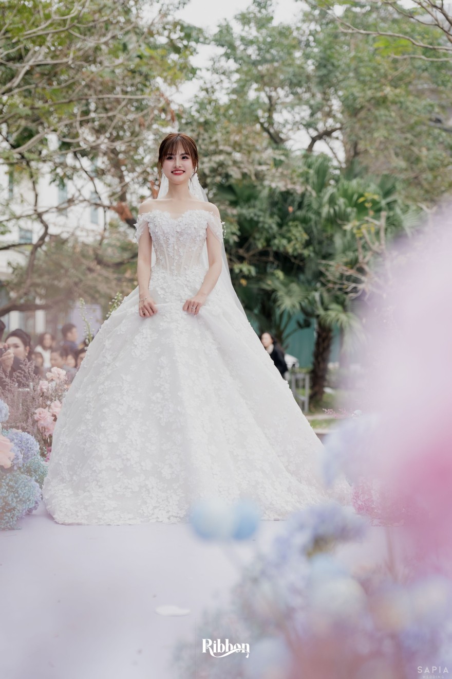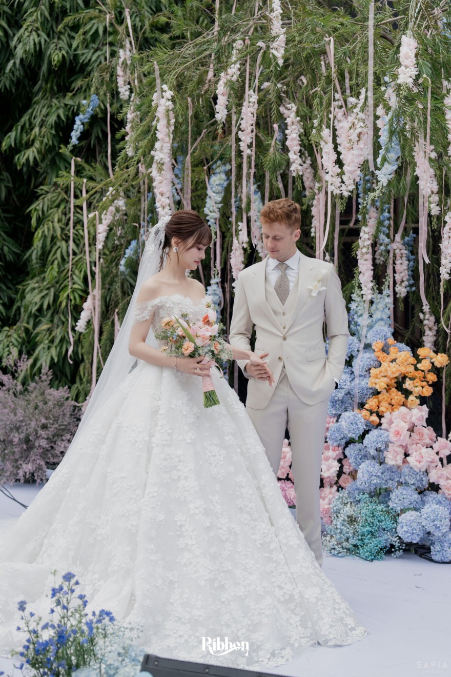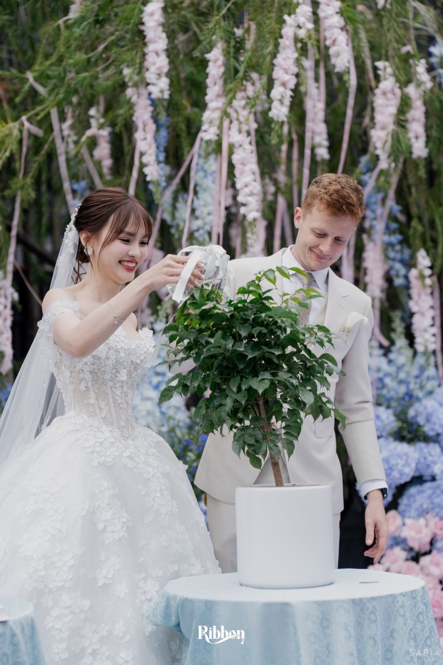 - Love story: Ánh xanh dịu không phải là màu xanh rực rỡ, mà là sắc xanh của sự tin tưởng, của bình yên, của một tình yêu đã đủ trưởng thành để không cần nói quá nhiều. Loài hoa chủ đạo của concept Delphinium xuất hiện một cách đầy dụng ý. Trong ngôn ngữ hoa, delphinium tượng trưng cho sự chân thành, bảo hộ và một tình yêu được chúc phúc. Những nhành hoa vươn cao, mảnh mai nhưng kiêu hãnh, như chính cách Linh & Mathew bước vào hành trình hôn nhân, dịu dàng, tin tưởng và luôn hướng về phía nhau.