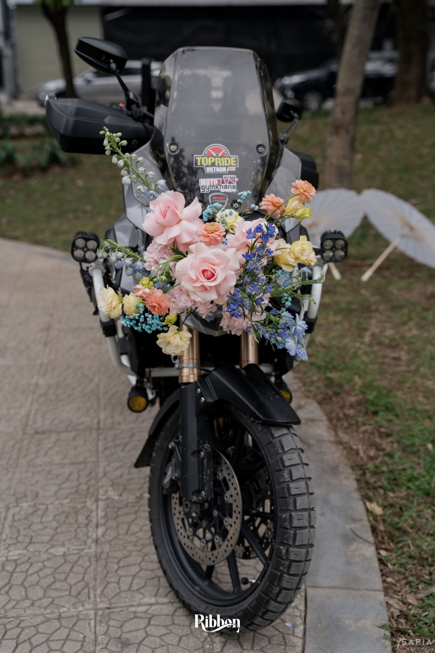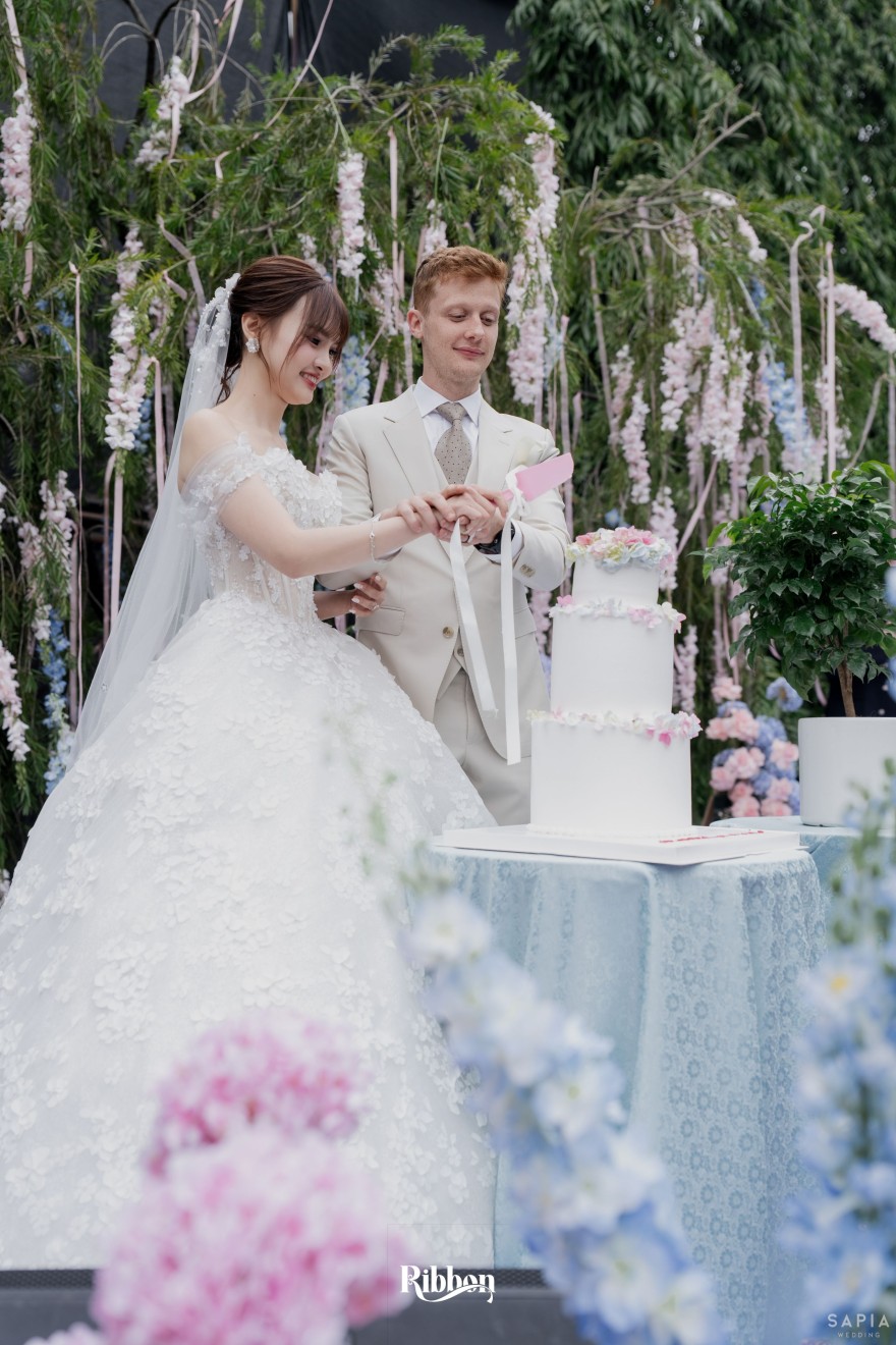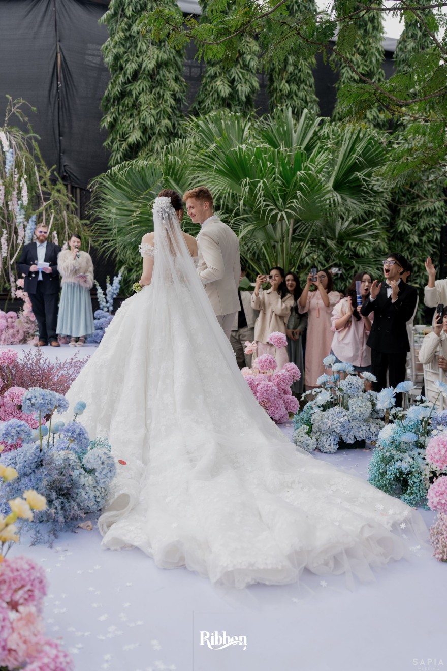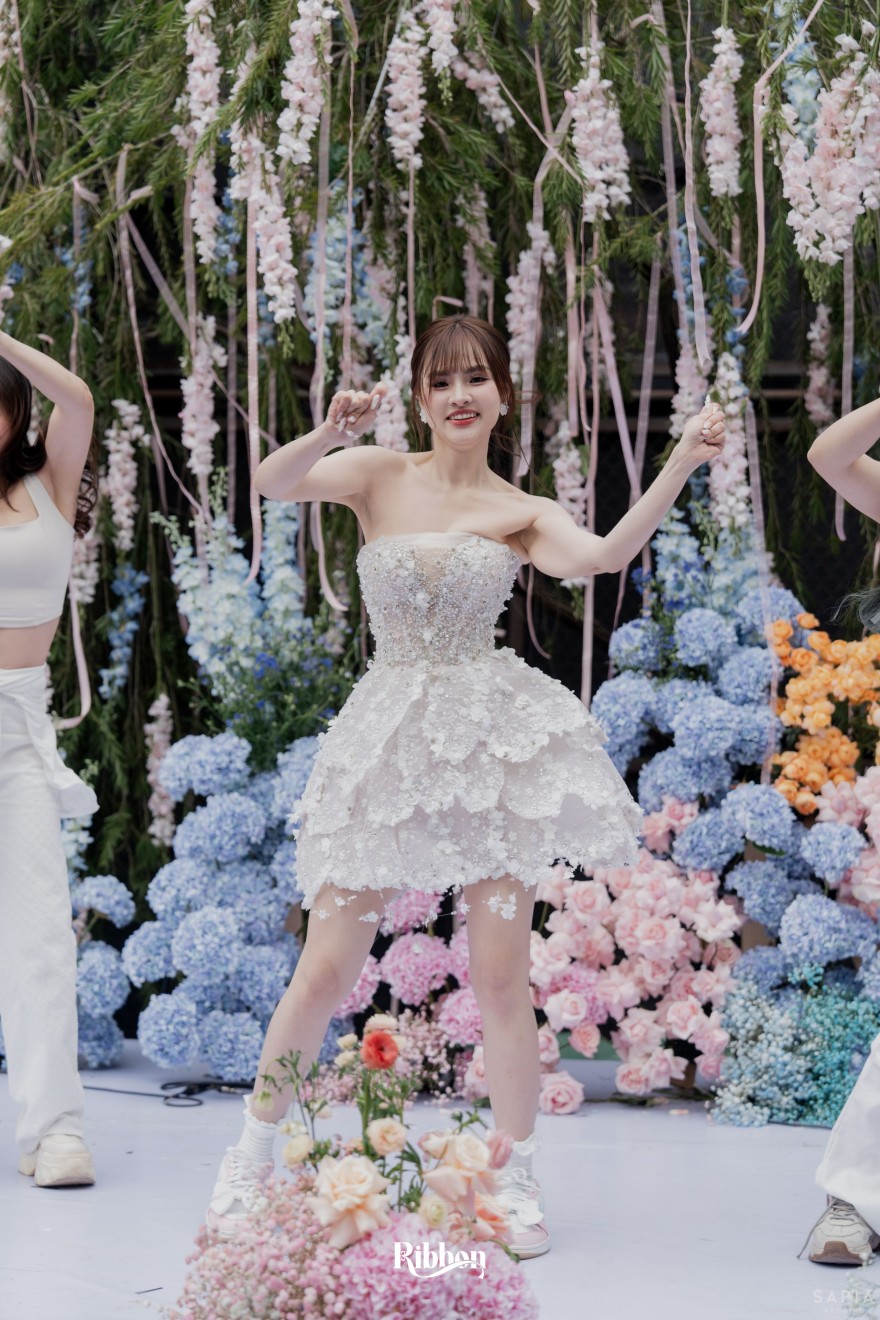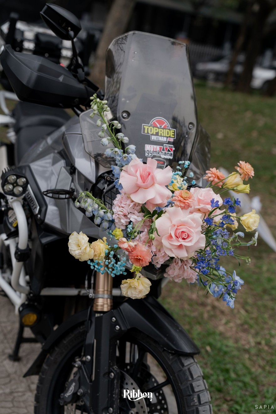 - Love story: Ánh xanh dịu không phải là màu xanh rực rỡ, mà là sắc xanh của sự tin tưởng, của bình yên, của một tình yêu đã đủ trưởng thành để không cần nói quá nhiều. Loài hoa chủ đạo của concept Delphinium xuất hiện một cách đầy dụng ý. Trong ngôn ngữ hoa, delphinium tượng trưng cho sự chân thành, bảo hộ và một tình yêu được chúc phúc. Những nhành hoa vươn cao, mảnh mai nhưng kiêu hãnh, như chính cách Linh & Mathew bước vào hành trình hôn nhân, dịu dàng, tin tưởng và luôn hướng về phía nhau.