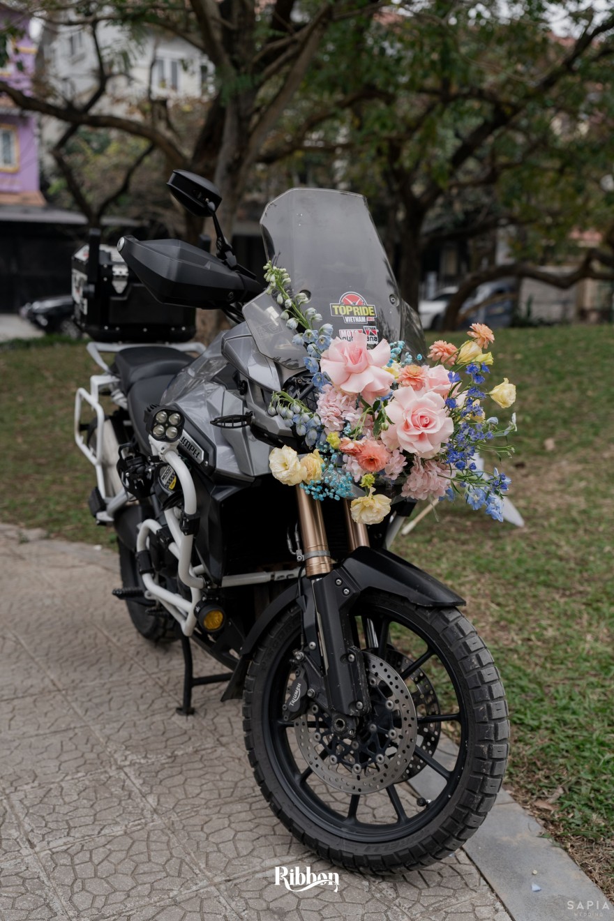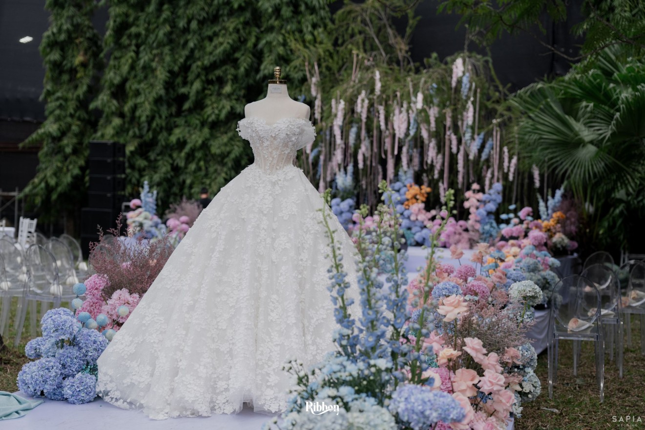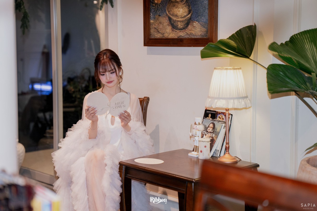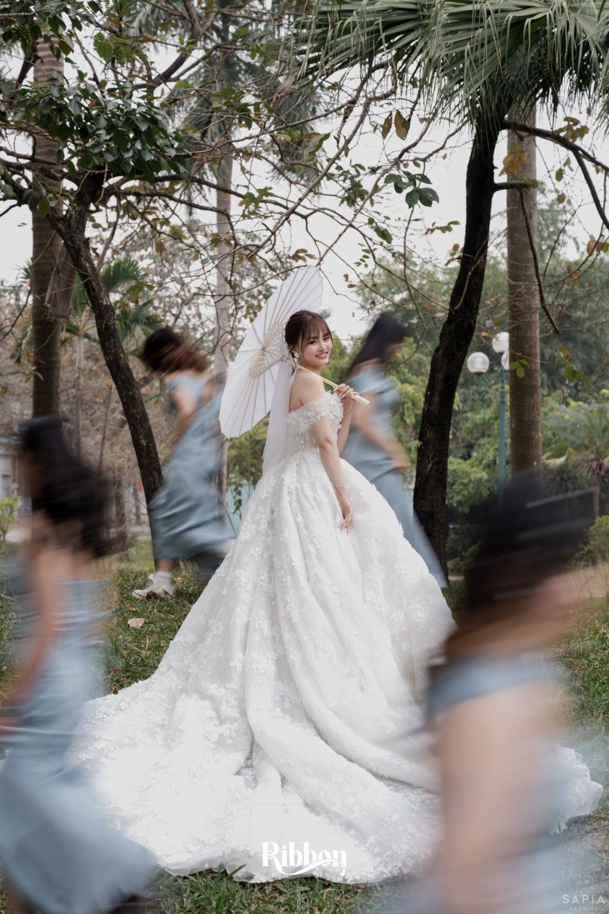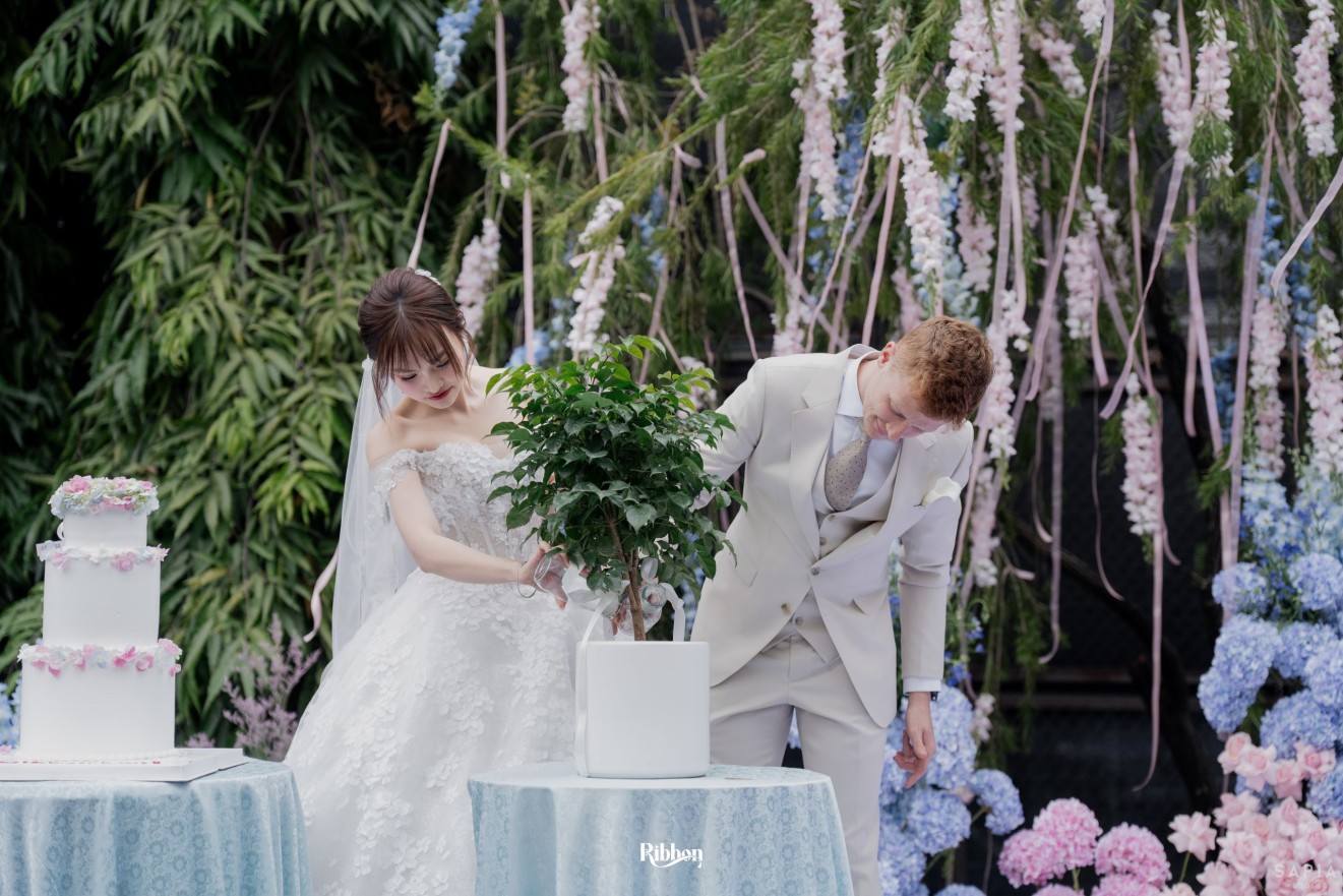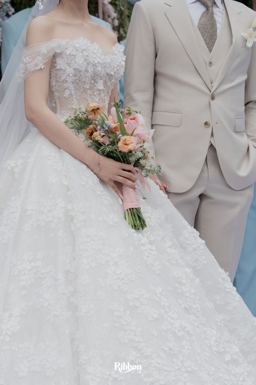 - Love story: Ánh xanh dịu không phải là màu xanh rực rỡ, mà là sắc xanh của sự tin tưởng, của bình yên, của một tình yêu đã đủ trưởng thành để không cần nói quá nhiều. Loài hoa chủ đạo của concept Delphinium xuất hiện một cách đầy dụng ý. Trong ngôn ngữ hoa, delphinium tượng trưng cho sự chân thành, bảo hộ và một tình yêu được chúc phúc. Những nhành hoa vươn cao, mảnh mai nhưng kiêu hãnh, như chính cách Linh & Mathew bước vào hành trình hôn nhân, dịu dàng, tin tưởng và luôn hướng về phía nhau.