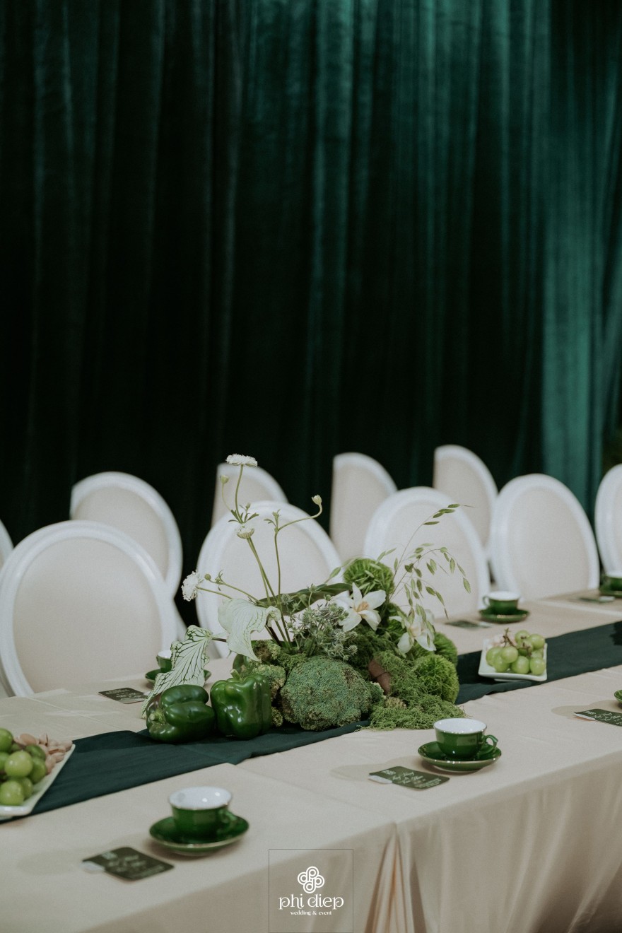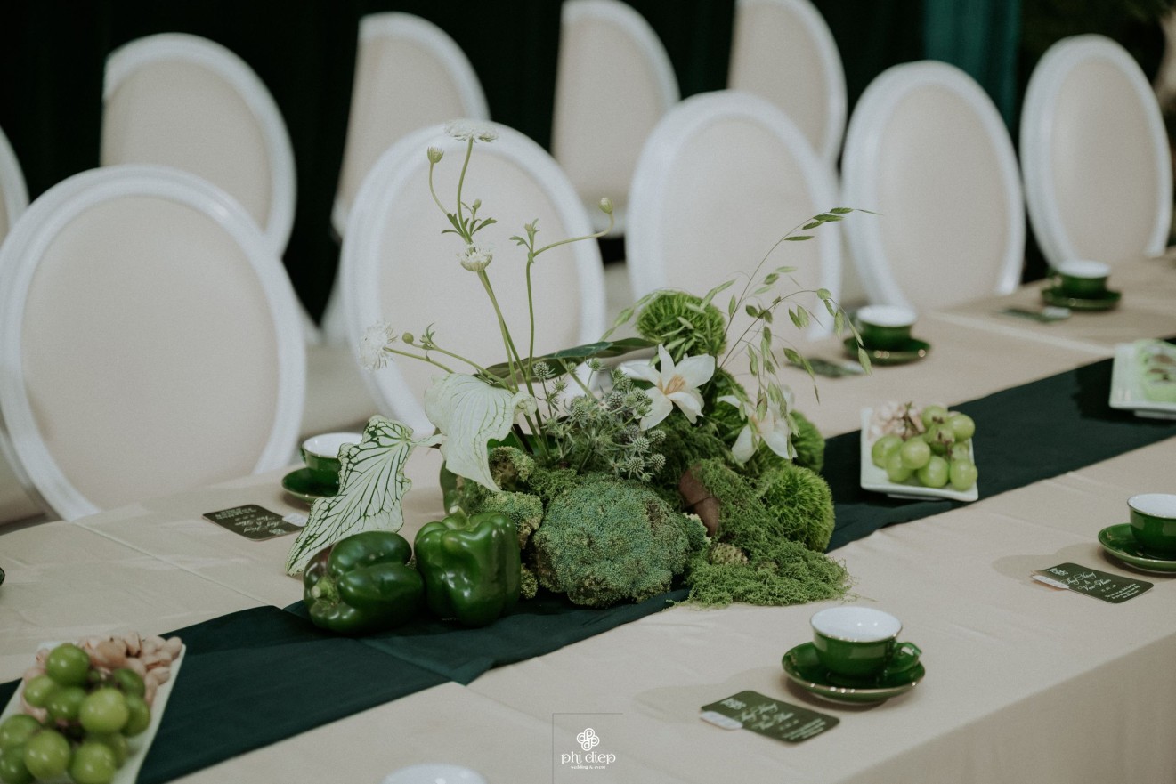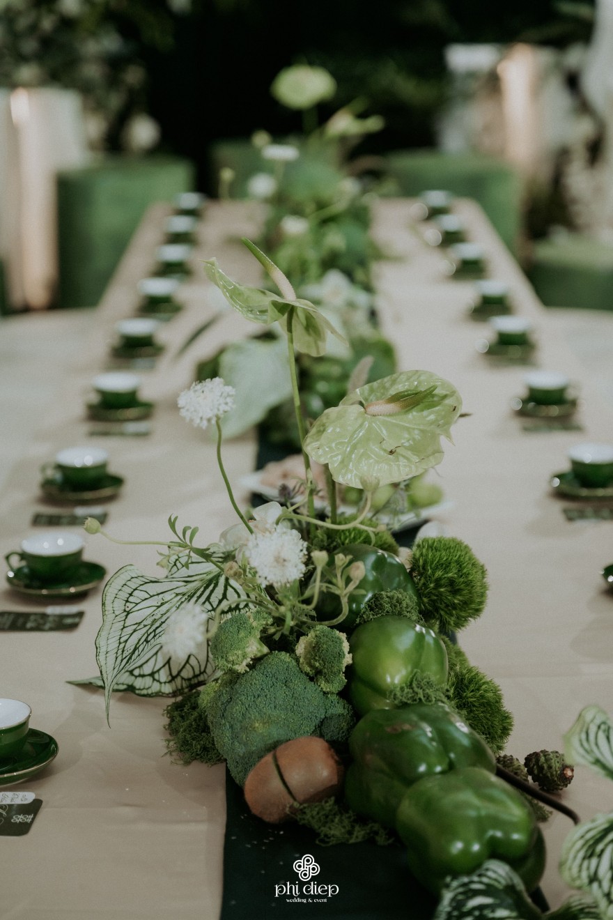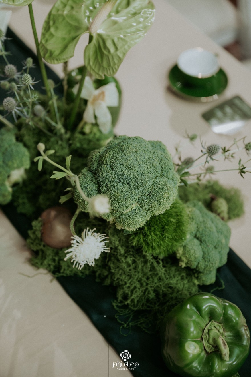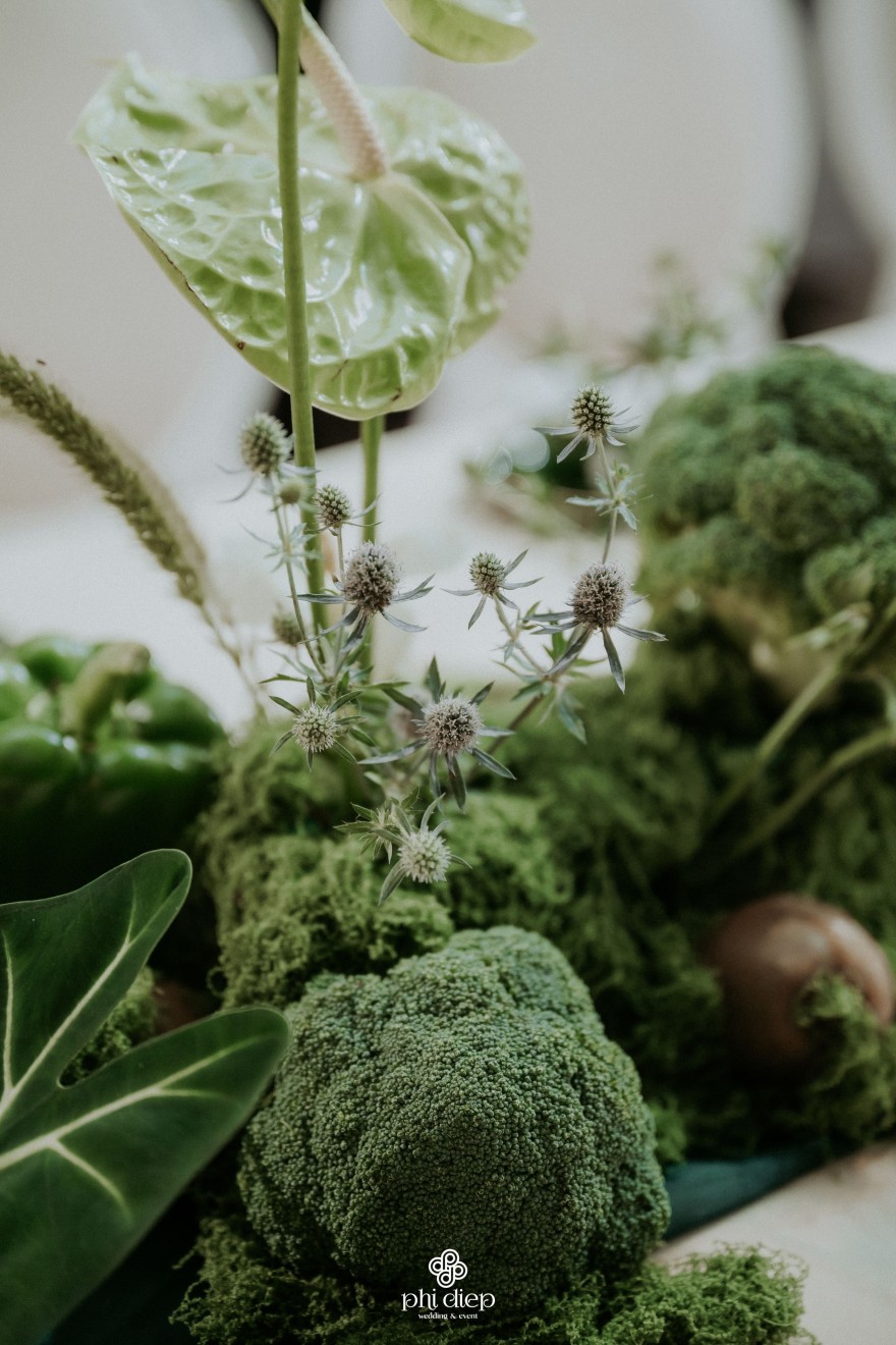 - Love story: Lấy cảm hứng từ triết lý “tịnh – lộc – xanh”, bàn gia tiên lần này là một tác phẩm nghệ thuật ứng dụng với điểm nhấn là những loại trái cây và rau củ xanh tươi được lựa chọn kỹ lưỡng. Mỗi loại đều mang một câu chuyện riêng: Bông cải xanh biểu tượng của sức khỏe, trường thọ và sự che chở. Ớt chuông xanh với tạo hình độc đáo khi được kết thành trụ trang trí, ớt chuông như một cây cầu nối giữa hiện tại và tương lai, nâng đỡ cho từng ước mơ vững bền của đôi trẻ. Tán lá Alocasia & Caladium không chỉ là lớp nền tươi mát cho bàn tiệc mà còn đại diện cho sự bảo hộ, sinh sôi. Sự xuất hiện nhẹ nhàng nhưng đầy chiều sâu của chúng khiến tổng thể như một khu vườn thiền, nơi lòng người trở nên lắng dịu.