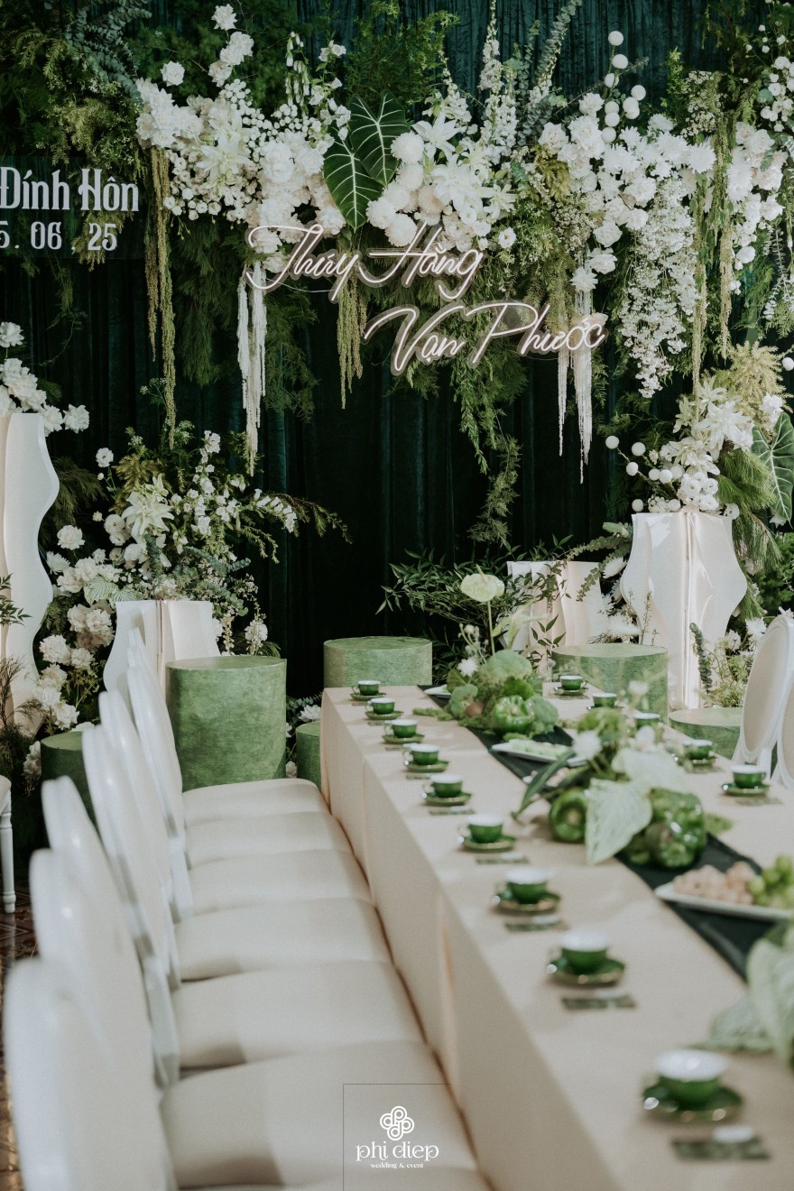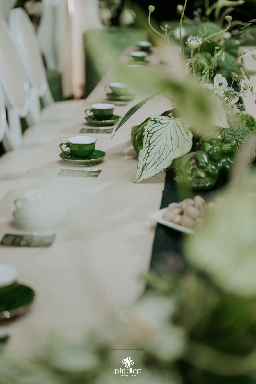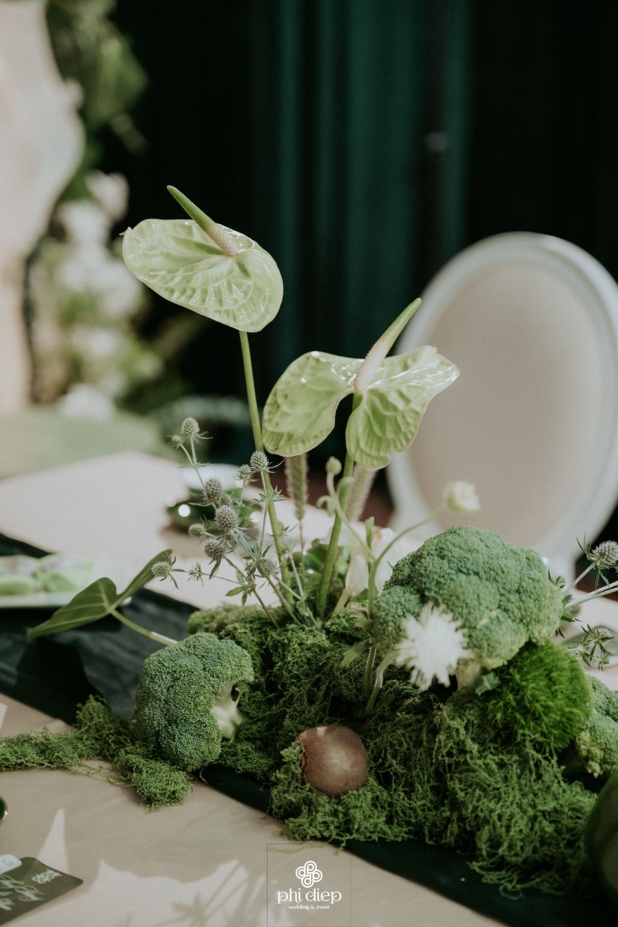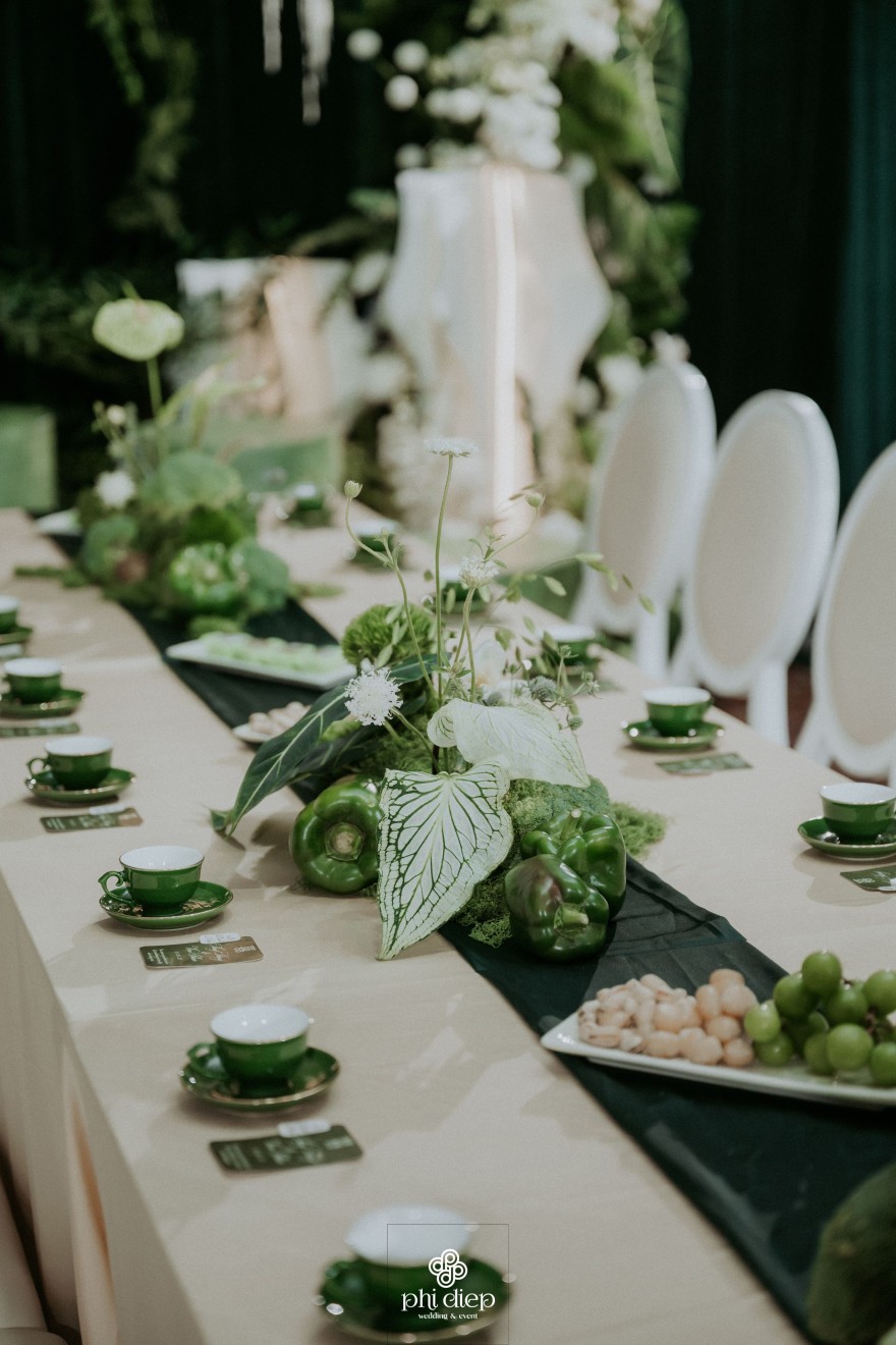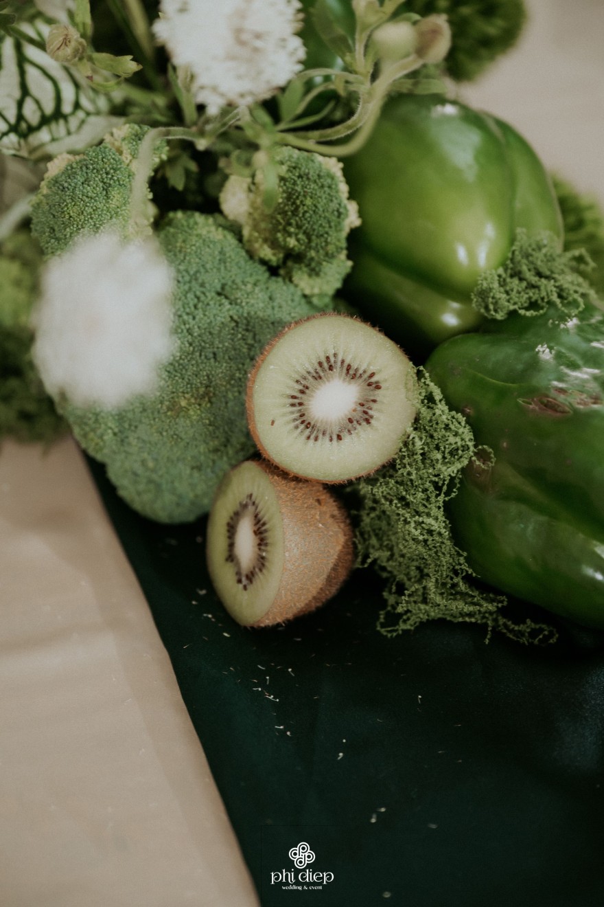 - Love story: Lấy cảm hứng từ triết lý “tịnh – lộc – xanh”, bàn gia tiên lần này là một tác phẩm nghệ thuật ứng dụng với điểm nhấn là những loại trái cây và rau củ xanh tươi được lựa chọn kỹ lưỡng. Mỗi loại đều mang một câu chuyện riêng: Bông cải xanh biểu tượng của sức khỏe, trường thọ và sự che chở. Ớt chuông xanh với tạo hình độc đáo khi được kết thành trụ trang trí, ớt chuông như một cây cầu nối giữa hiện tại và tương lai, nâng đỡ cho từng ước mơ vững bền của đôi trẻ. Tán lá Alocasia & Caladium không chỉ là lớp nền tươi mát cho bàn tiệc mà còn đại diện cho sự bảo hộ, sinh sôi. Sự xuất hiện nhẹ nhàng nhưng đầy chiều sâu của chúng khiến tổng thể như một khu vườn thiền, nơi lòng người trở nên lắng dịu.