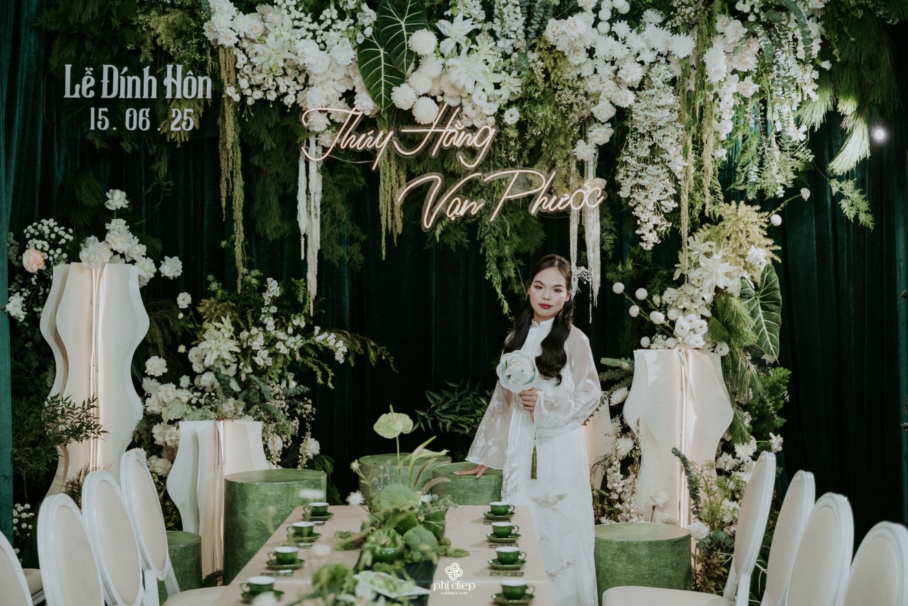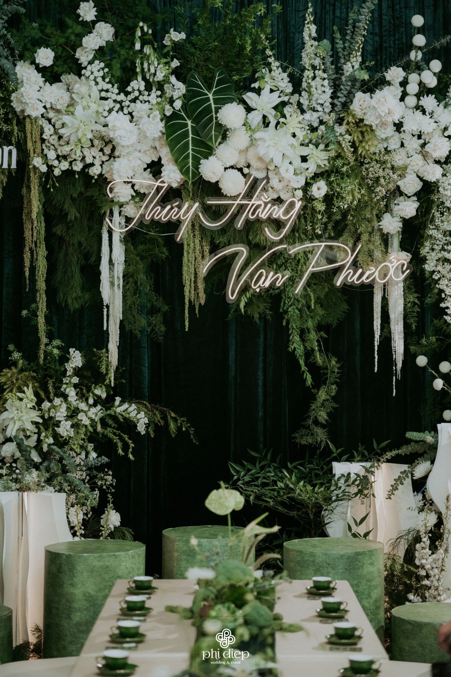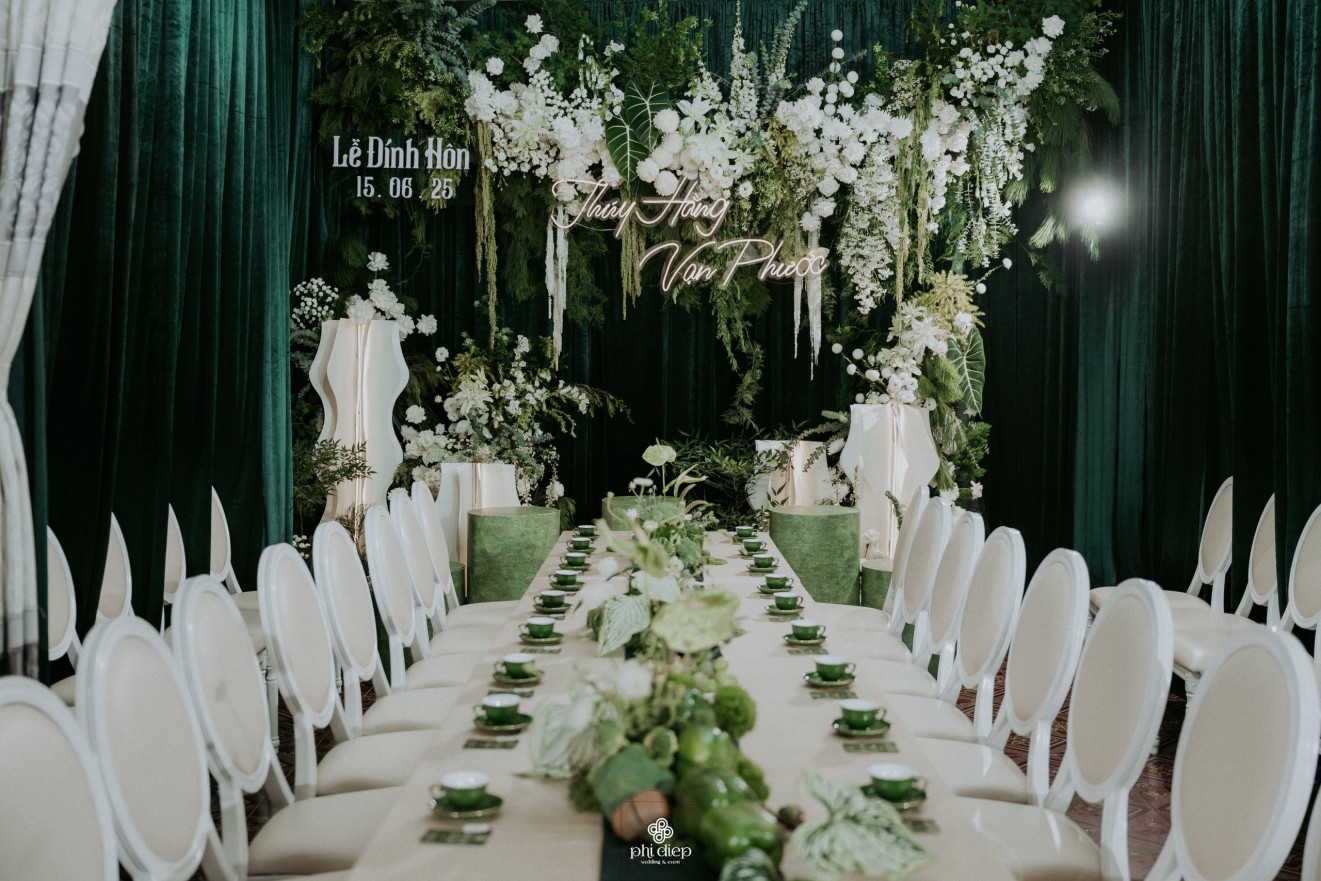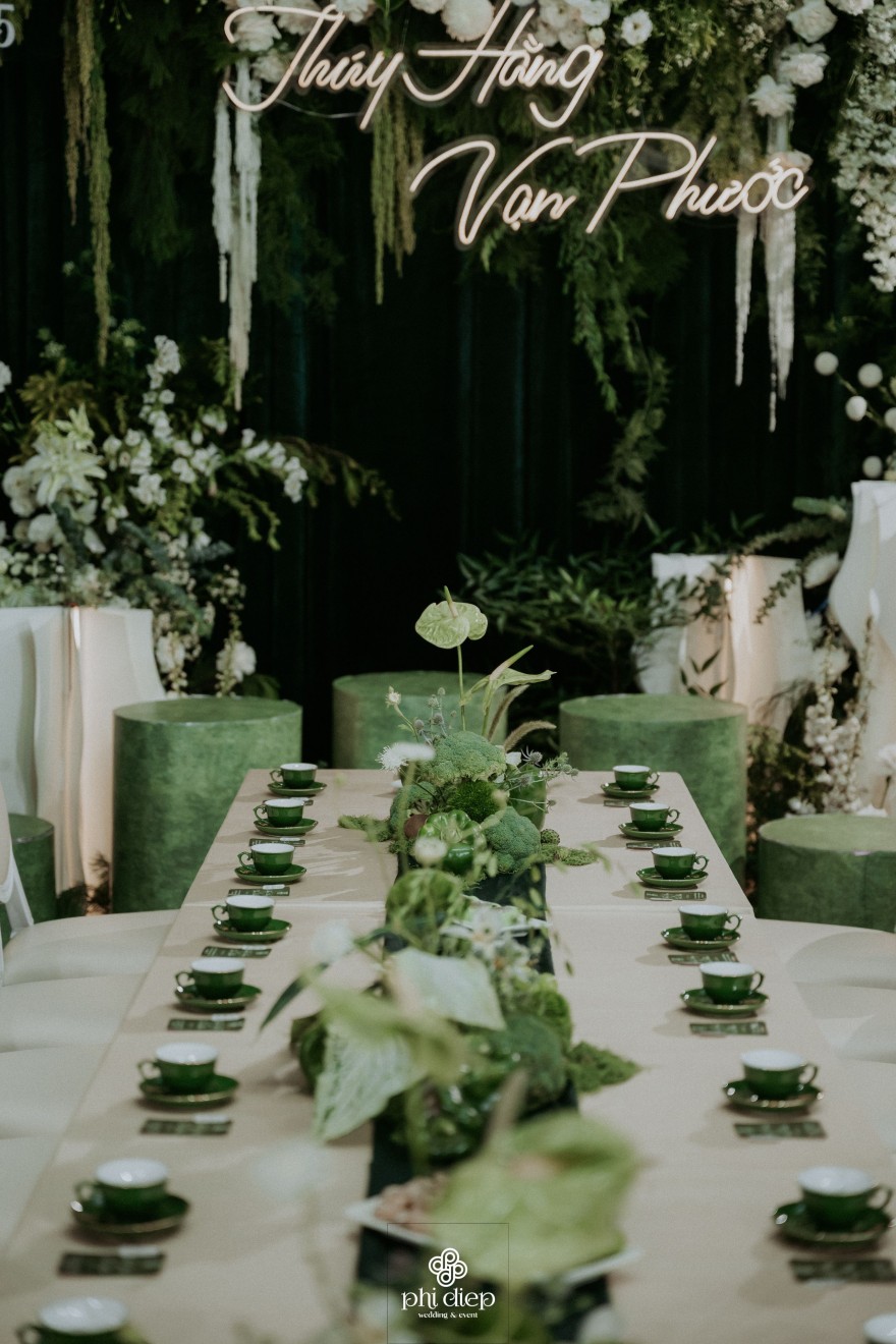- Love story: Lấy cảm hứng từ triết lý “tịnh – lộc – xanh”, bàn gia tiên lần này là một tác phẩm nghệ thuật ứng dụng với điểm nhấn là những loại trái cây và rau củ xanh tươi được lựa chọn kỹ lưỡng. Mỗi loại đều mang một câu chuyện riêng: Bông cải xanh biểu tượng của sức khỏe, trường thọ và sự che chở. Ớt chuông xanh với tạo hình độc đáo khi được kết thành trụ trang trí, ớt chuông như một cây cầu nối giữa hiện tại và tương lai, nâng đỡ cho từng ước mơ vững bền của đôi trẻ. Tán lá Alocasia & Caladium không chỉ là lớp nền tươi mát cho bàn tiệc mà còn đại diện cho sự bảo hộ, sinh sôi. Sự xuất hiện nhẹ nhàng nhưng đầy chiều sâu của chúng khiến tổng thể như một khu vườn thiền, nơi lòng người trở nên lắng dịu.