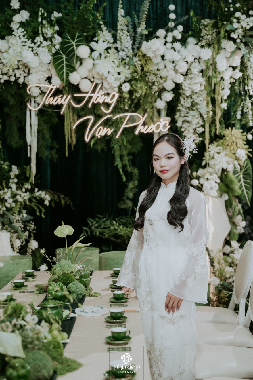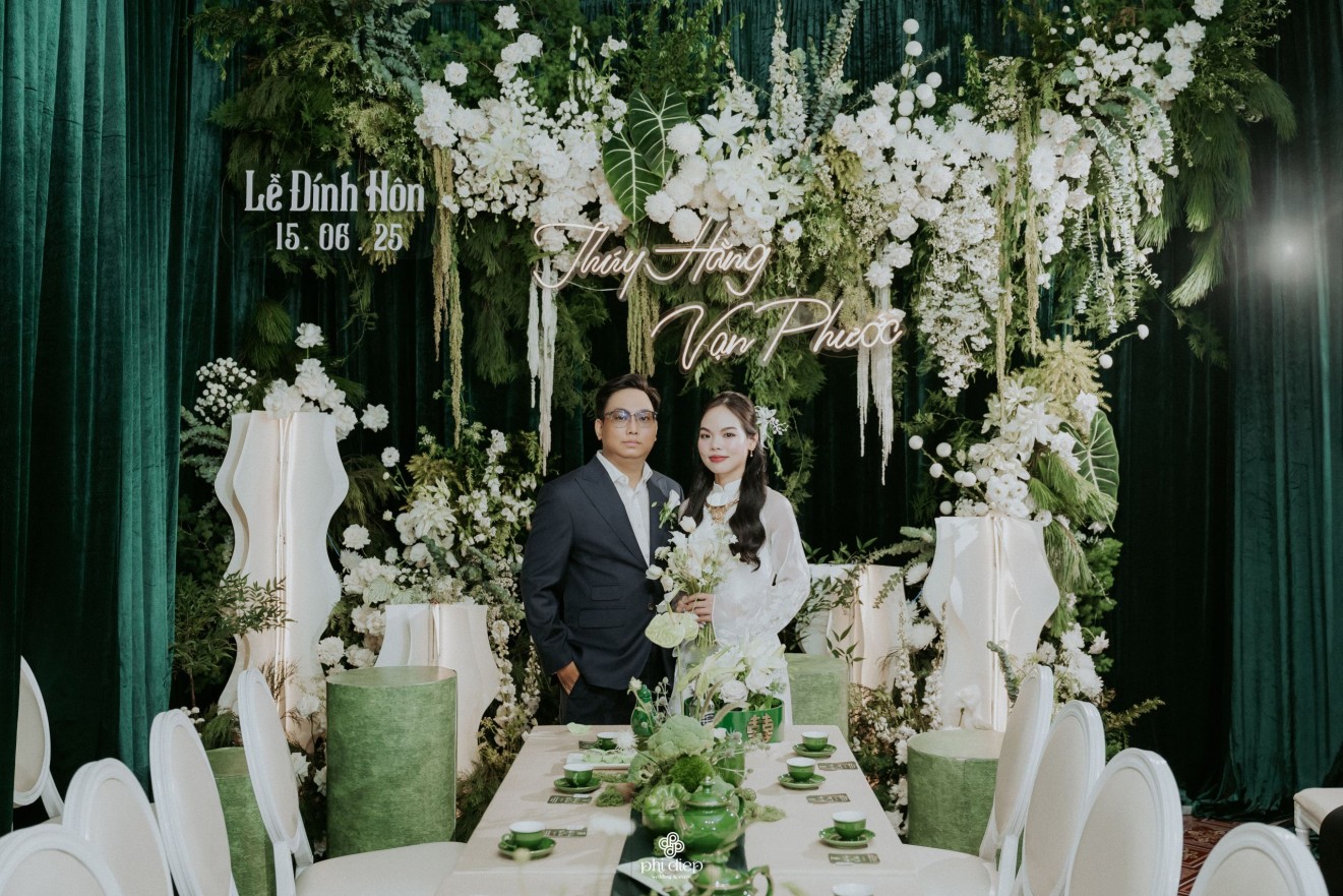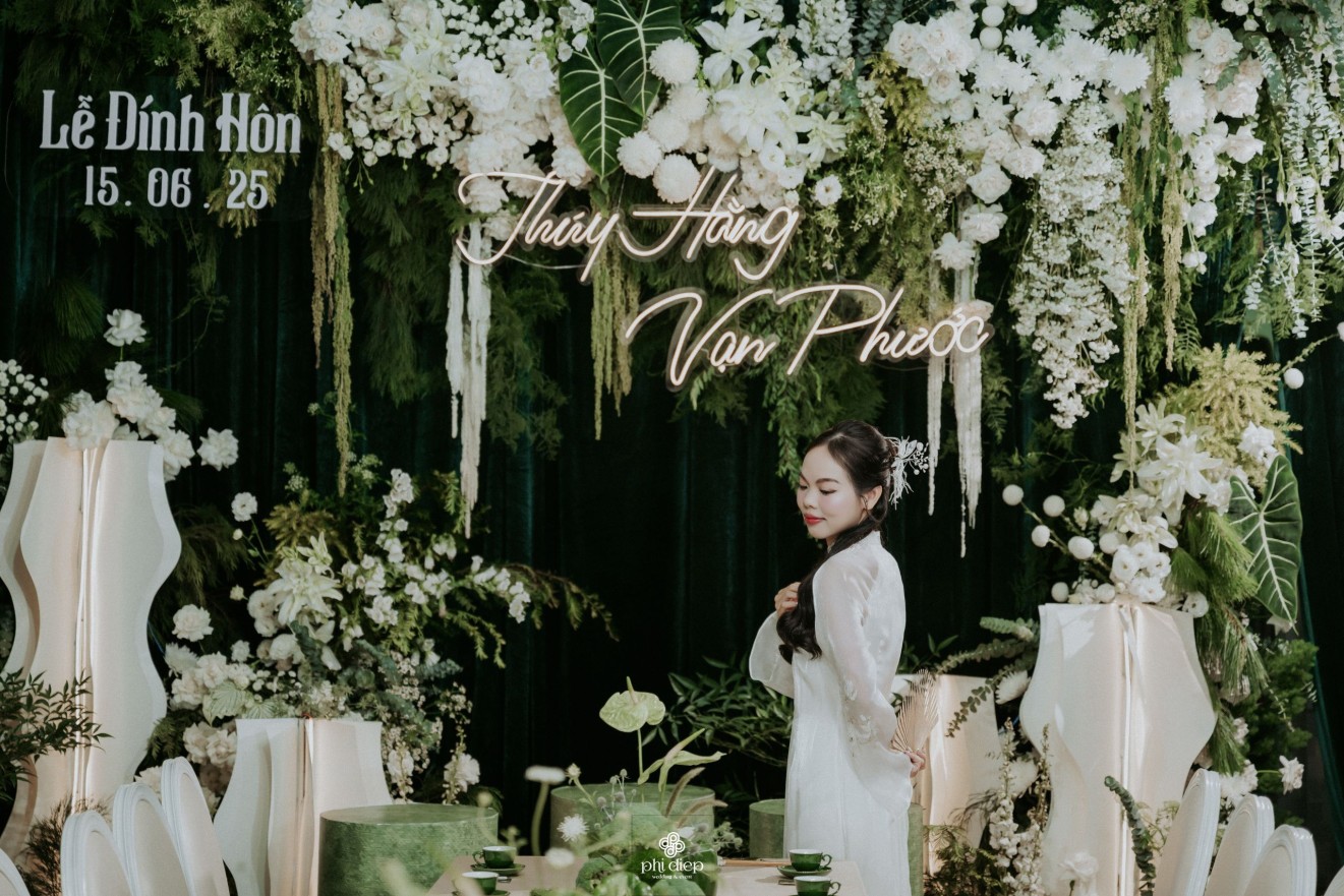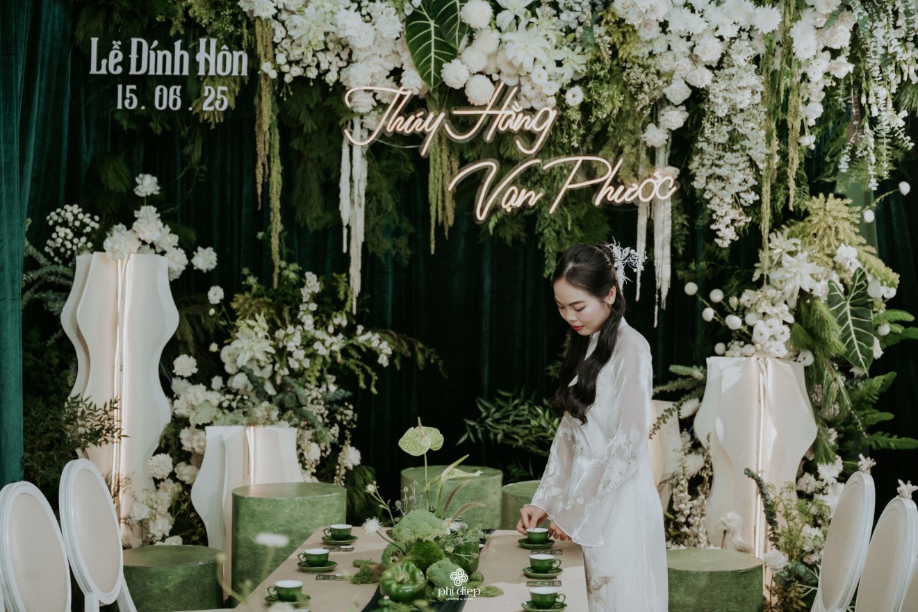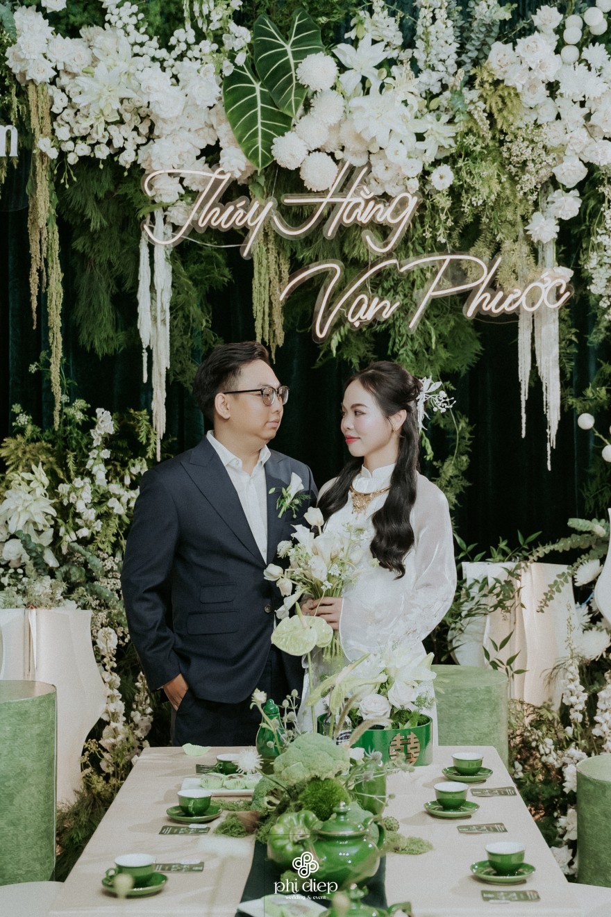- Love story: Lấy cảm hứng từ triết lý “tịnh – lộc – xanh”, bàn gia tiên lần này là một tác phẩm nghệ thuật ứng dụng với điểm nhấn là những loại trái cây và rau củ xanh tươi được lựa chọn kỹ lưỡng. Mỗi loại đều mang một câu chuyện riêng: Bông cải xanh biểu tượng của sức khỏe, trường thọ và sự che chở. Ớt chuông xanh với tạo hình độc đáo khi được kết thành trụ trang trí, ớt chuông như một cây cầu nối giữa hiện tại và tương lai, nâng đỡ cho từng ước mơ vững bền của đôi trẻ. Tán lá Alocasia & Caladium không chỉ là lớp nền tươi mát cho bàn tiệc mà còn đại diện cho sự bảo hộ, sinh sôi. Sự xuất hiện nhẹ nhàng nhưng đầy chiều sâu của chúng khiến tổng thể như một khu vườn thiền, nơi lòng người trở nên lắng dịu.