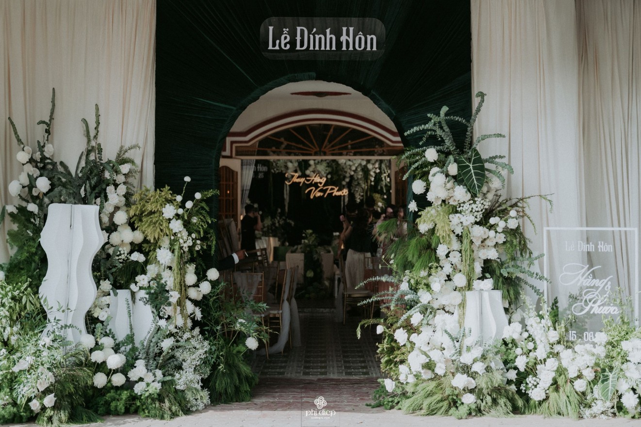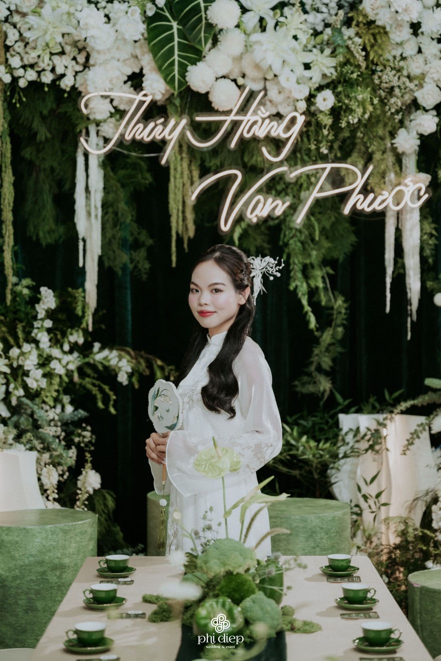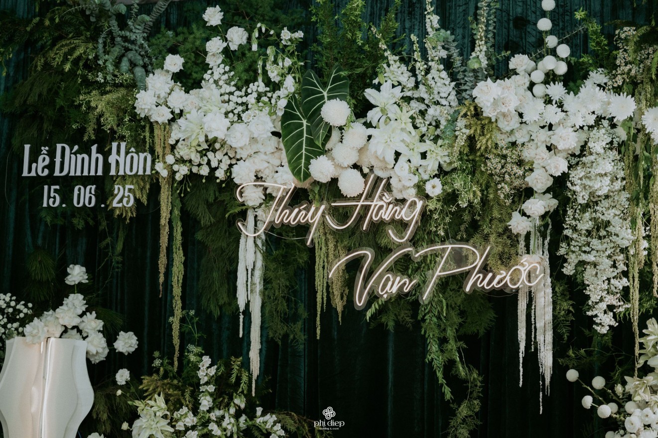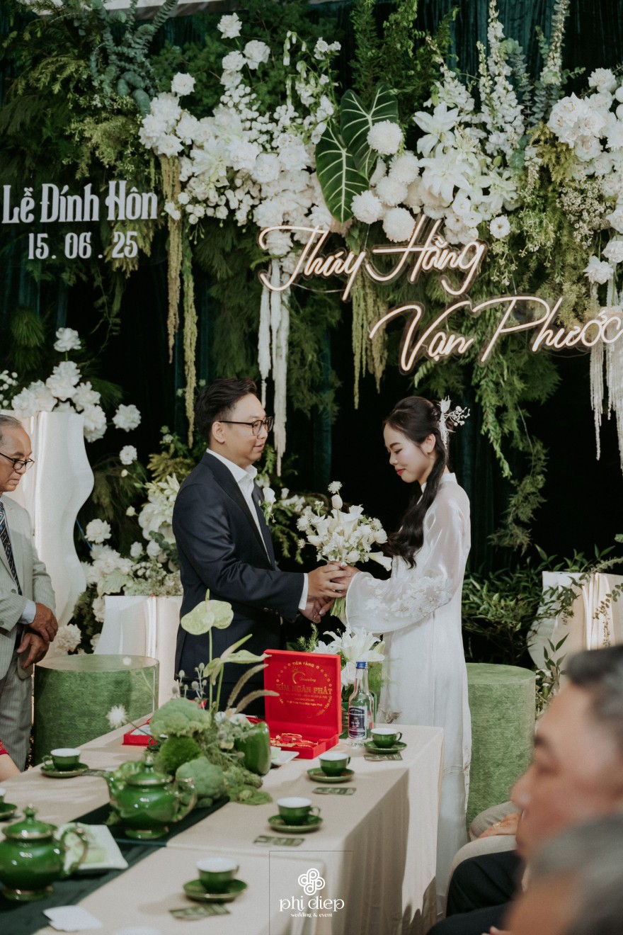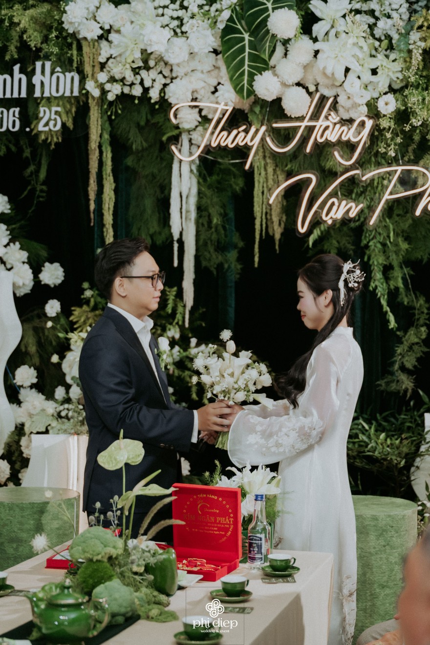 - Love story: Lấy cảm hứng từ triết lý “tịnh – lộc – xanh”, bàn gia tiên lần này là một tác phẩm nghệ thuật ứng dụng với điểm nhấn là những loại trái cây và rau củ xanh tươi được lựa chọn kỹ lưỡng. Mỗi loại đều mang một câu chuyện riêng: Bông cải xanh biểu tượng của sức khỏe, trường thọ và sự che chở. Ớt chuông xanh với tạo hình độc đáo khi được kết thành trụ trang trí, ớt chuông như một cây cầu nối giữa hiện tại và tương lai, nâng đỡ cho từng ước mơ vững bền của đôi trẻ. Tán lá Alocasia & Caladium không chỉ là lớp nền tươi mát cho bàn tiệc mà còn đại diện cho sự bảo hộ, sinh sôi. Sự xuất hiện nhẹ nhàng nhưng đầy chiều sâu của chúng khiến tổng thể như một khu vườn thiền, nơi lòng người trở nên lắng dịu.