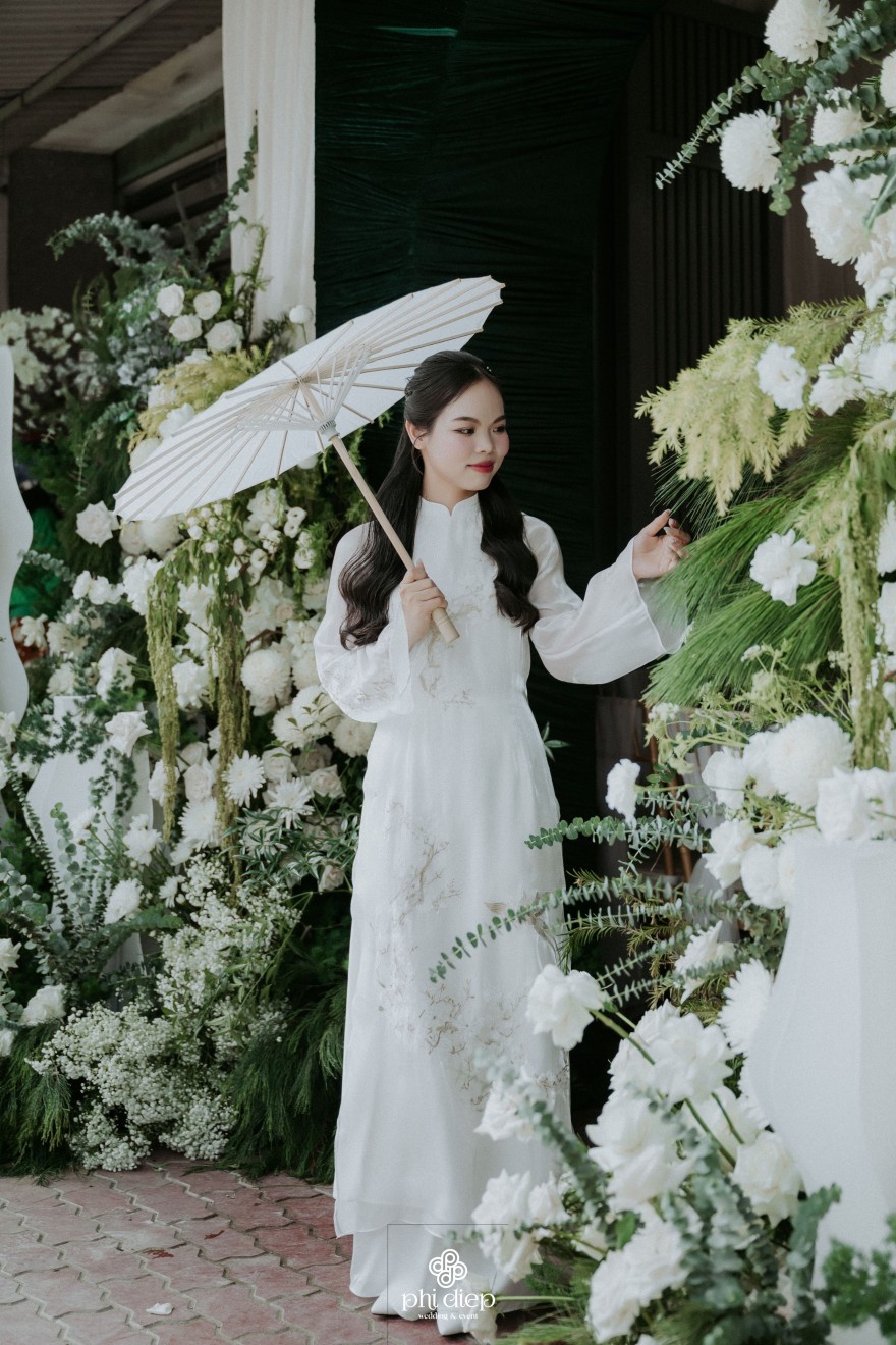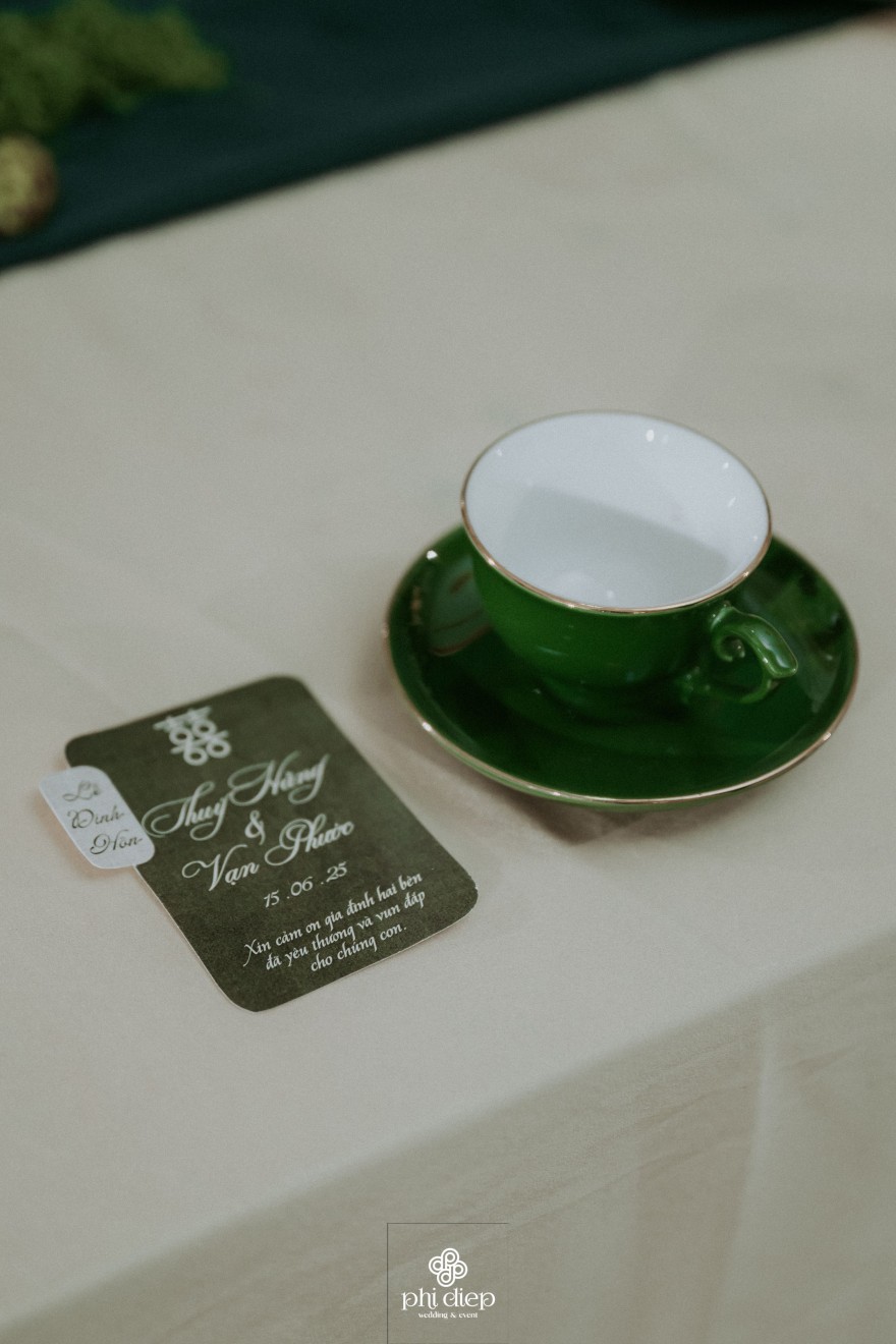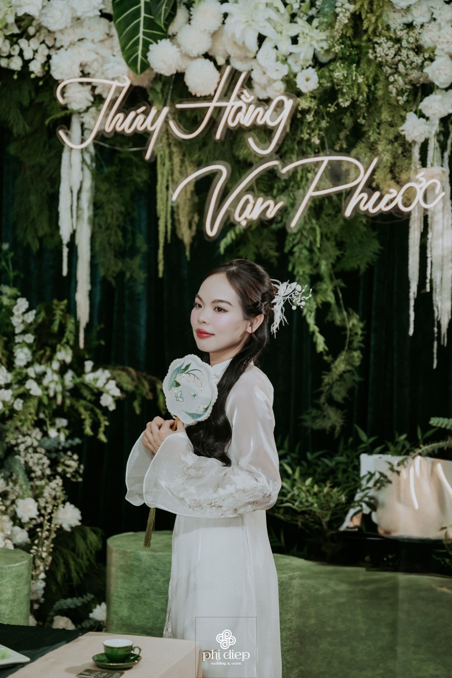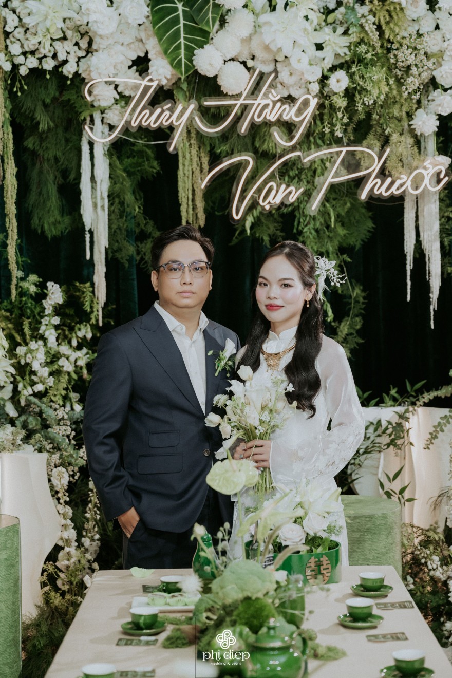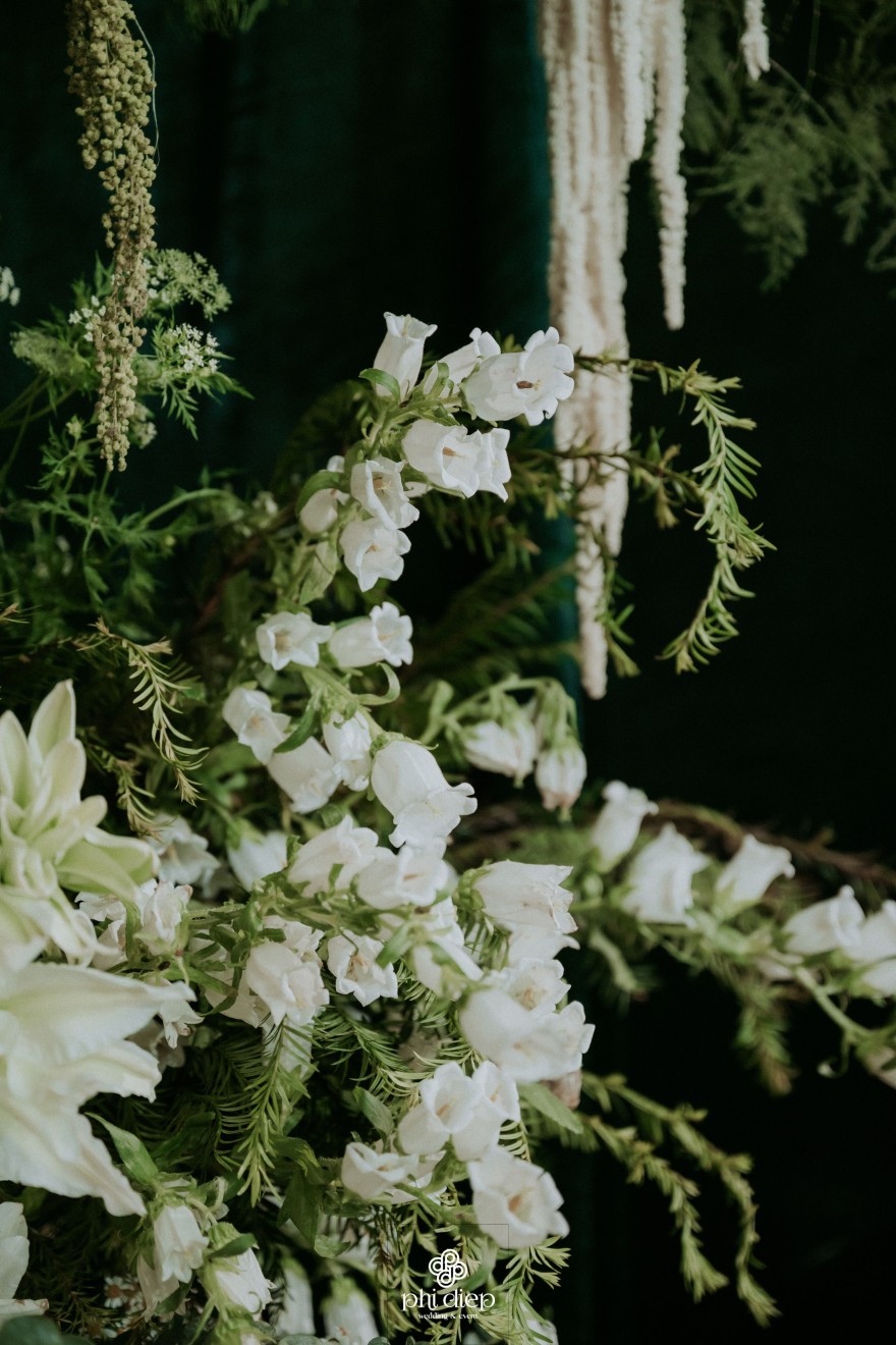 - Love story: Lấy cảm hứng từ triết lý “tịnh – lộc – xanh”, bàn gia tiên lần này là một tác phẩm nghệ thuật ứng dụng với điểm nhấn là những loại trái cây và rau củ xanh tươi được lựa chọn kỹ lưỡng. Mỗi loại đều mang một câu chuyện riêng: Bông cải xanh biểu tượng của sức khỏe, trường thọ và sự che chở. Ớt chuông xanh với tạo hình độc đáo khi được kết thành trụ trang trí, ớt chuông như một cây cầu nối giữa hiện tại và tương lai, nâng đỡ cho từng ước mơ vững bền của đôi trẻ. Tán lá Alocasia & Caladium không chỉ là lớp nền tươi mát cho bàn tiệc mà còn đại diện cho sự bảo hộ, sinh sôi. Sự xuất hiện nhẹ nhàng nhưng đầy chiều sâu của chúng khiến tổng thể như một khu vườn thiền, nơi lòng người trở nên lắng dịu.