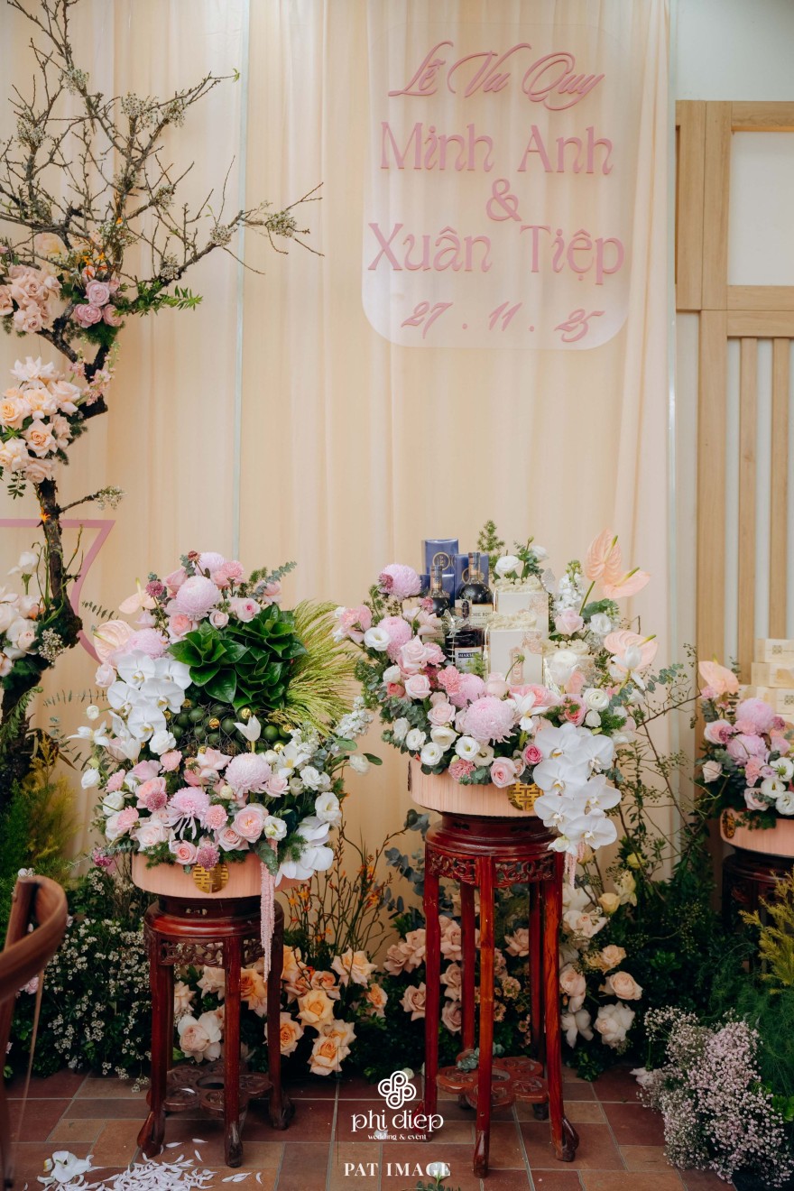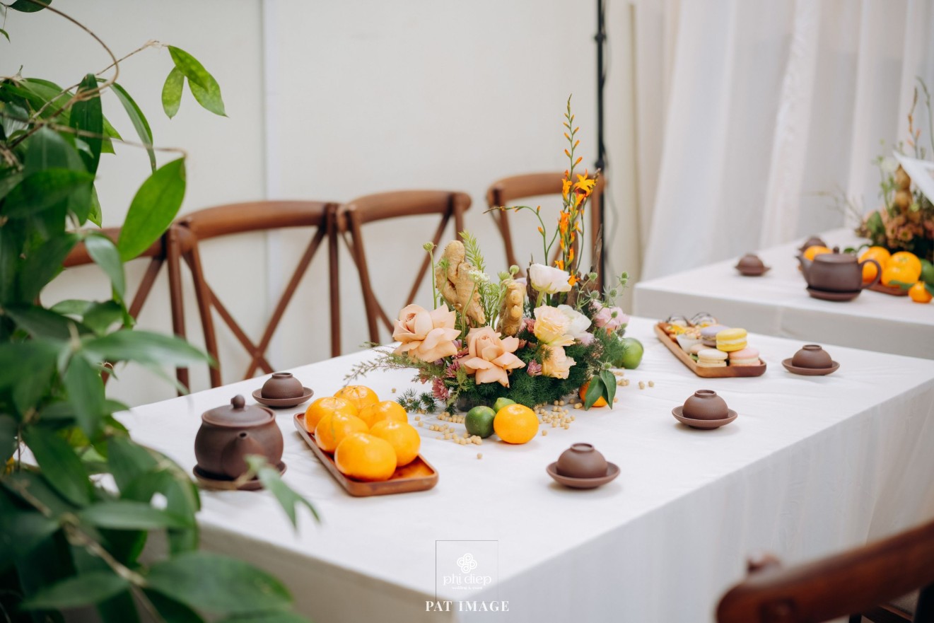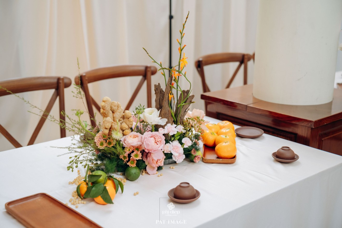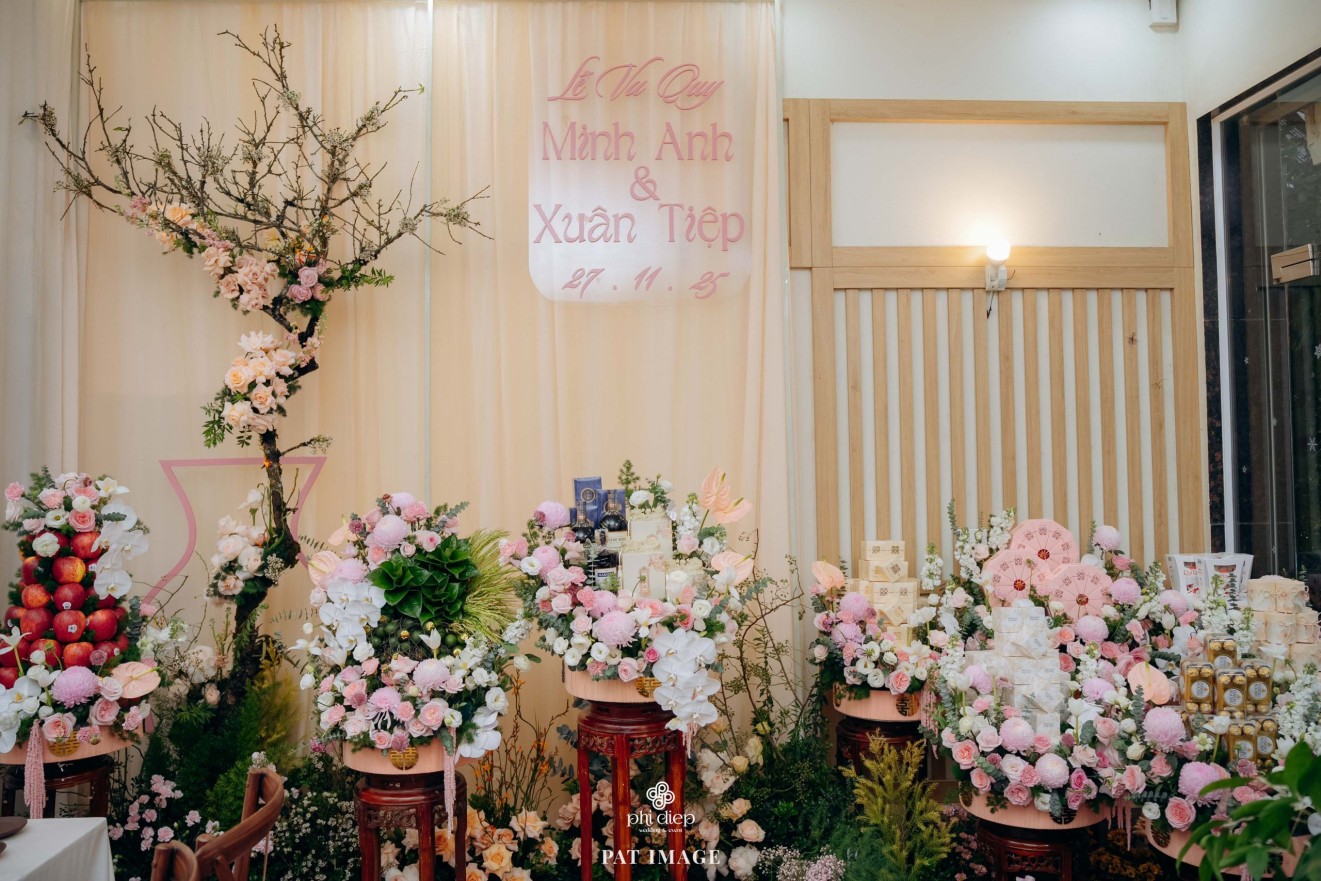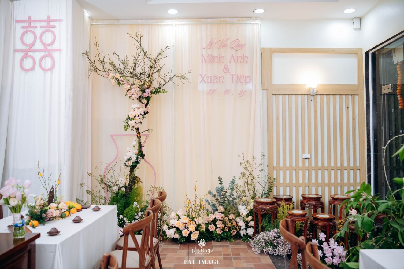 - Love story: “Mộc Thổ Tinh Hương" - cái tên nghe giản dị mà đủ đầy, gợi lên hơi thở của gỗ, của đất và của hương hoa thanh nhã. Những yếu tố tạo nên nét đẹp truyền thống Bắc Bộ nhưng vẫn giữ tinh thần tối giản, trang trọng và hiện đại. Mộc là nét mộc mạc của gỗ thô, của những đường vân không mài giũa, tượng trưng cho sự chân thành của tình yêu và nếp nhà. Thổ là màu của đất, nơi thanh sạch và bền vững, nơi mọi cội nguồn đều bắt đầu, cũng như nền tảng mà hai gia đình đã vun đắp để đôi trẻ được đứng bên nhau ngày hôm nay. Còn Tinh Hương là hương sắc trong trẻo lan nhẹ trong không gian, là vẻ đẹp thanh tân của lễ nghi, là lời chúc cho cuộc sống chung sẽ luôn êm đềm như buổi sáng đầu xuân.