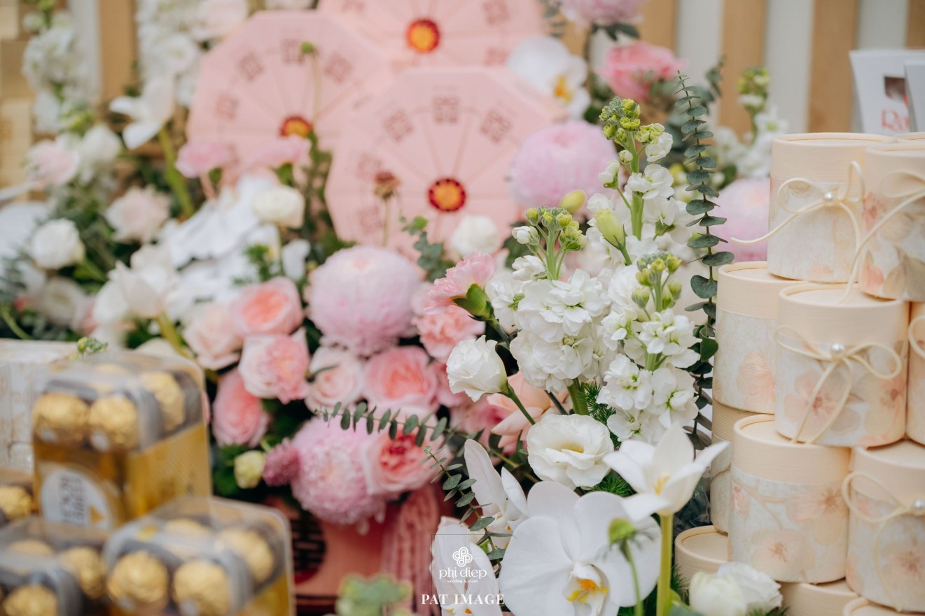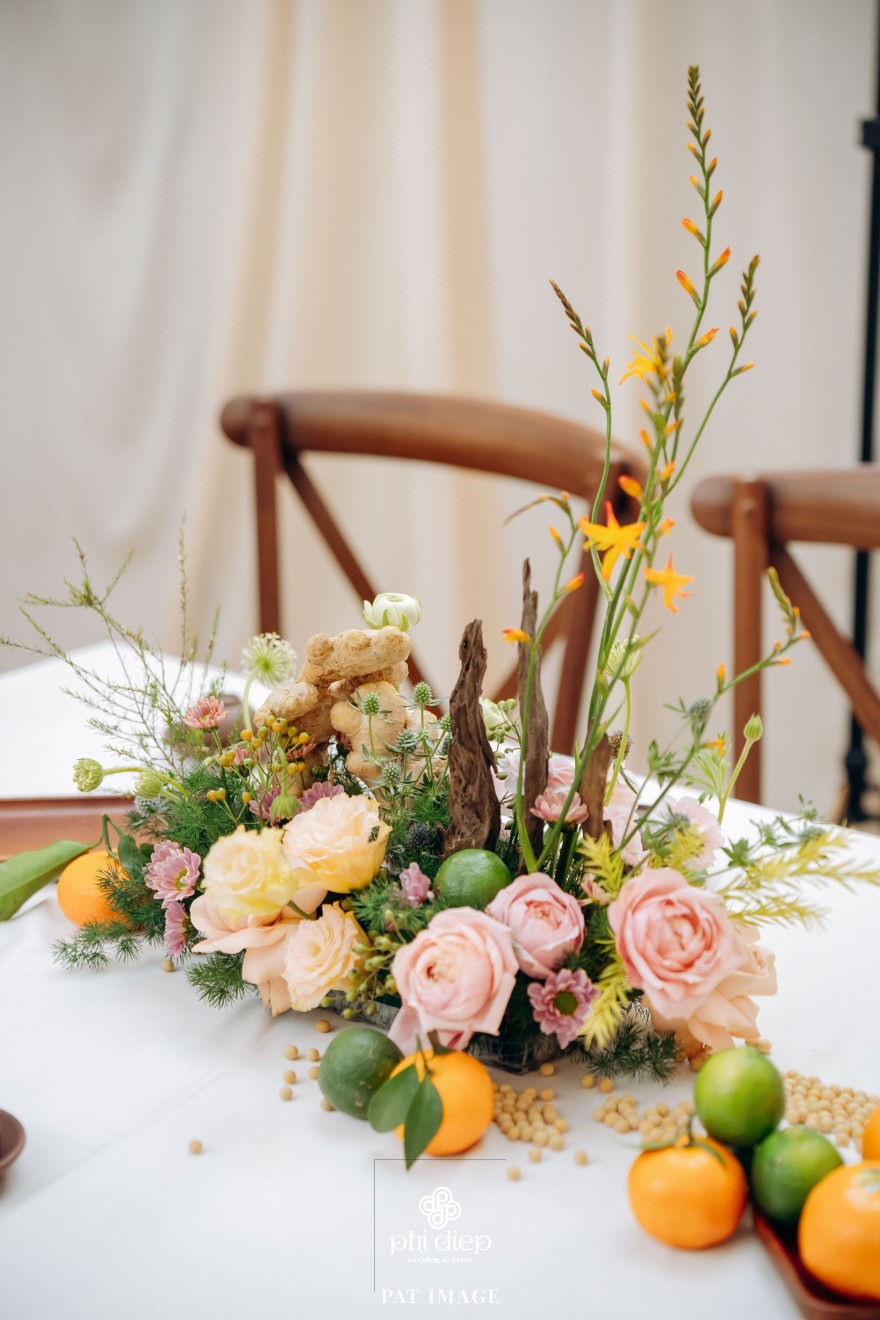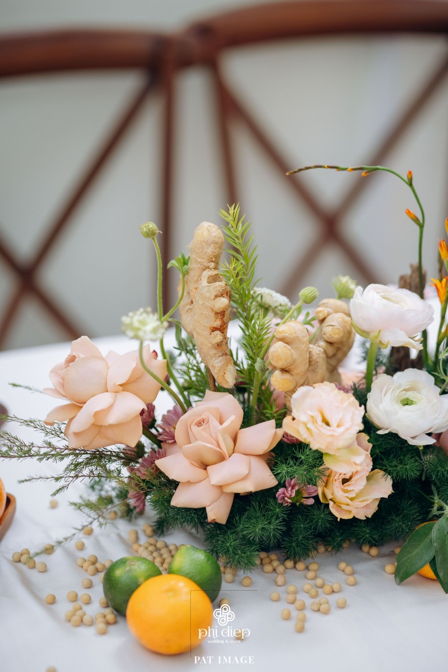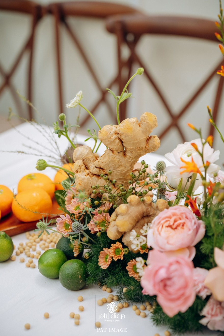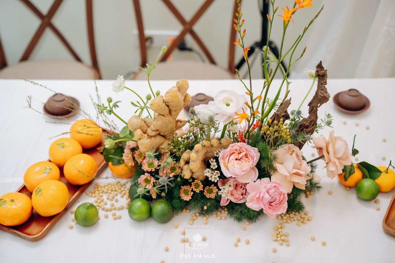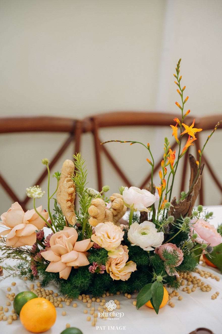 - Love story: “Mộc Thổ Tinh Hương" - cái tên nghe giản dị mà đủ đầy, gợi lên hơi thở của gỗ, của đất và của hương hoa thanh nhã. Những yếu tố tạo nên nét đẹp truyền thống Bắc Bộ nhưng vẫn giữ tinh thần tối giản, trang trọng và hiện đại. Mộc là nét mộc mạc của gỗ thô, của những đường vân không mài giũa, tượng trưng cho sự chân thành của tình yêu và nếp nhà. Thổ là màu của đất, nơi thanh sạch và bền vững, nơi mọi cội nguồn đều bắt đầu, cũng như nền tảng mà hai gia đình đã vun đắp để đôi trẻ được đứng bên nhau ngày hôm nay. Còn Tinh Hương là hương sắc trong trẻo lan nhẹ trong không gian, là vẻ đẹp thanh tân của lễ nghi, là lời chúc cho cuộc sống chung sẽ luôn êm đềm như buổi sáng đầu xuân.