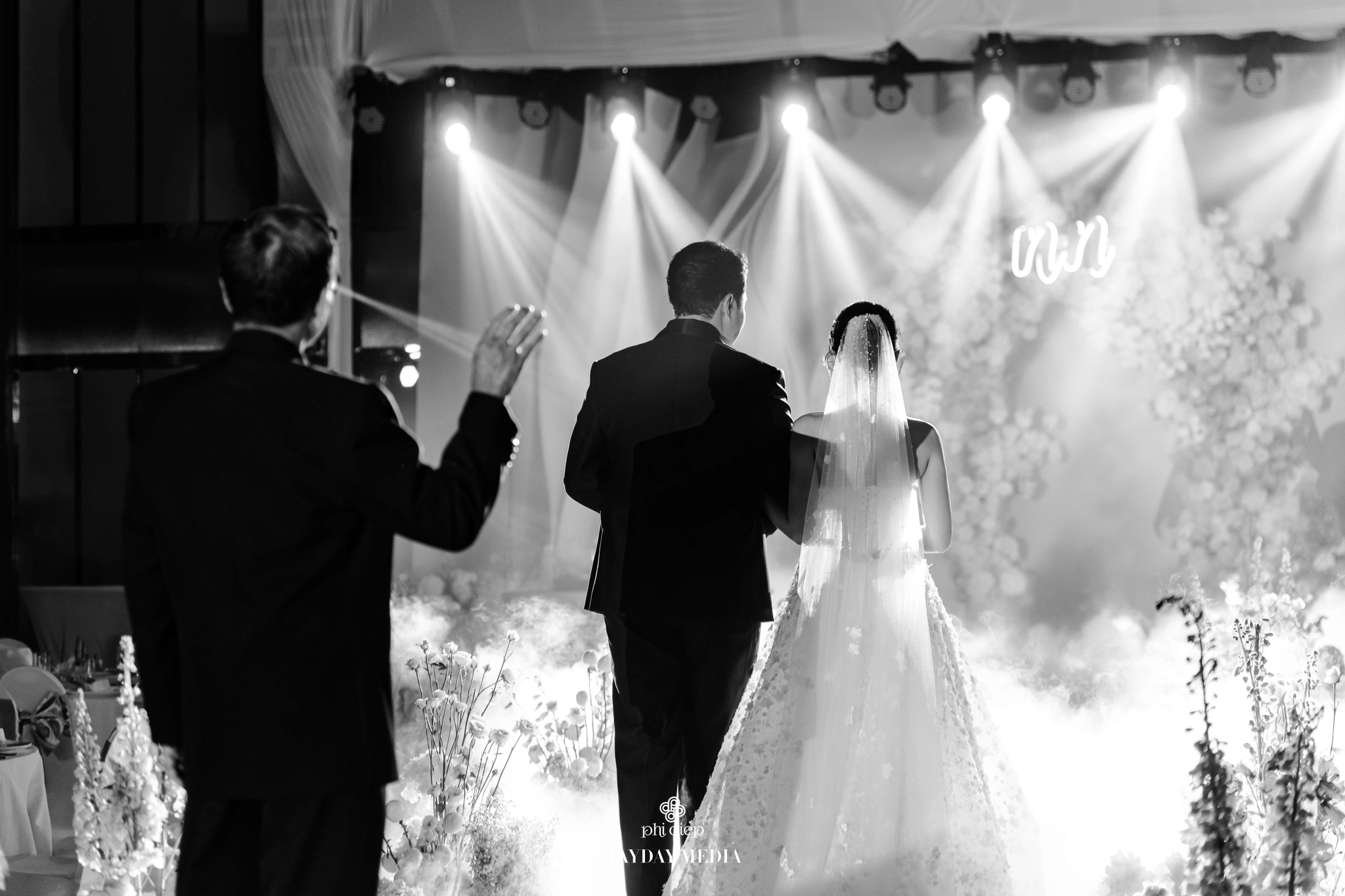 Khoảnh khắc cánh cửa lễ đường mở ra, cả khán phòng dường như chìm vào sự tĩnh lặng thiêng liêng. Đó là lúc không gian như ngưng đọng lại, chỉ còn nhịp bước chậm rãi của cha và con gái trên thảm đỏ rực rỡ. Bàn tay cha nắm chặt lấy đôi tay nhỏ bé của con, một cái nắm tay mang sức nặng của sự bảo bọc cuối cùng. Trong sự rung cảm ấy, cha dường như đang cố níu giữ lại hình bóng đứa con bé bỏng của ngày xưa, đồng thời thầm lặng truyền thêm sức mạnh để con tự tin sải bước vào một chương mới của cuộc đời.Mỗi bước đi tiến gần về phía chú rể không chỉ là một khoảng cách vật lý, mà còn là một thước phim quay chậm về những ký ức không tên. Từ những ngày con tập tễnh bước đi đầu đời trong vòng tay cha, cho đến khi con trưởng thành và tìm thấy bến đỗ hạnh phúc. Cha đã ở đó, âm thầm dõi theo, và giờ đây, cha lại là người dìu dắt con trong những bước đi quan trọng nhất. Để rồi, giây phút xúc động nhất chính là khi đứng giữa lễ đường, cha nhẹ nhàng đặt bàn tay con vào tay người đàn ông con chọn. Hành động ấy vượt lên trên mọi nghi thức cổ điển, trở thành một biểu tượng của sự tin tưởng tuyệt đối. Đó là thông điệp thiêng liêng được gửi gắm mà không cần bất cứ lời nói nào: