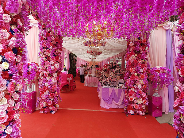 Cổng hoa trong buổi lễ ăn hỏi cũng được lấy ý tưởng từ hôn lễ của cặp đôi Lưu Thi Thi và Ngô Kỳ Long. Với mỗi chiếc cổng hoa đều phải sử dụng một lượng lớn hoa tươi tương đối đắt tiền, cụ thể phải kể đến các loại hoa như: hoa cát tường, các loài hoa lan, hoa baby và hoa hồng nhập khẩu.