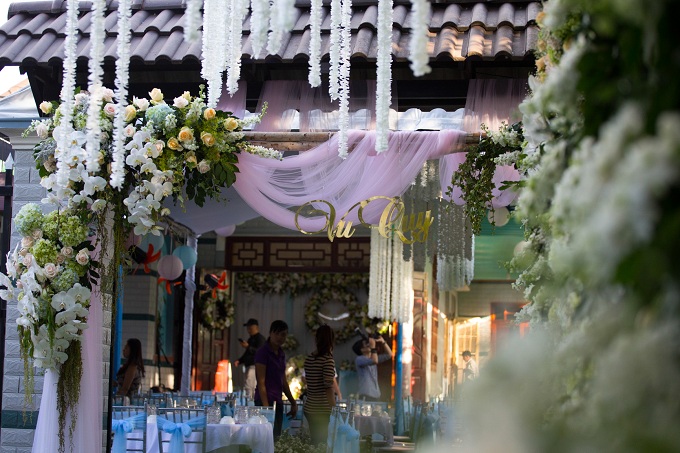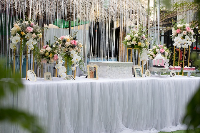 Trong không gian cưới đâu đâu cũng có hoa, hoa được trải từ trên bàn tiệc tới mặt đất.