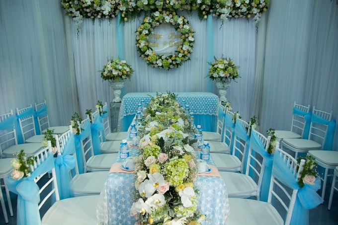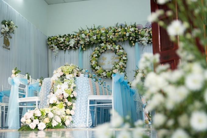 Không gian tiệc cưới của cô dâu Ngọc Diễm được trang trí khá đẹp mắt và toát lên vẻ đẹp lộng lẫy ngọt ngào. Để có được thành qua đó ngoài việc liện hệ với những nhà cung cấp suốt ba tháng trời, đội ngũ thi công cũng phải mất đến ba ngày để có thể hoàn thành xong. Phần lớn các loài hoa trang trí trong tiệc cưới được lấy từ Đà Lạt như: hồng kem, lan hồ điệp, cẩm tú cầu, hồng vàng, mỡ gà phần còn lại là hoa nhập khẩu như: hoa mẫu đơn, tai lừa, hoa hồng aloha, bibi Hà Lan, thanh liễu, lá úc nhọn,... Không gian tiệc cưới mang đến sự thanh lịch và tinh tế bời sự kết hợp hài hòa giữ tone màu xanh nước biển của các loài hoa và những phụ kiện đi kèm.