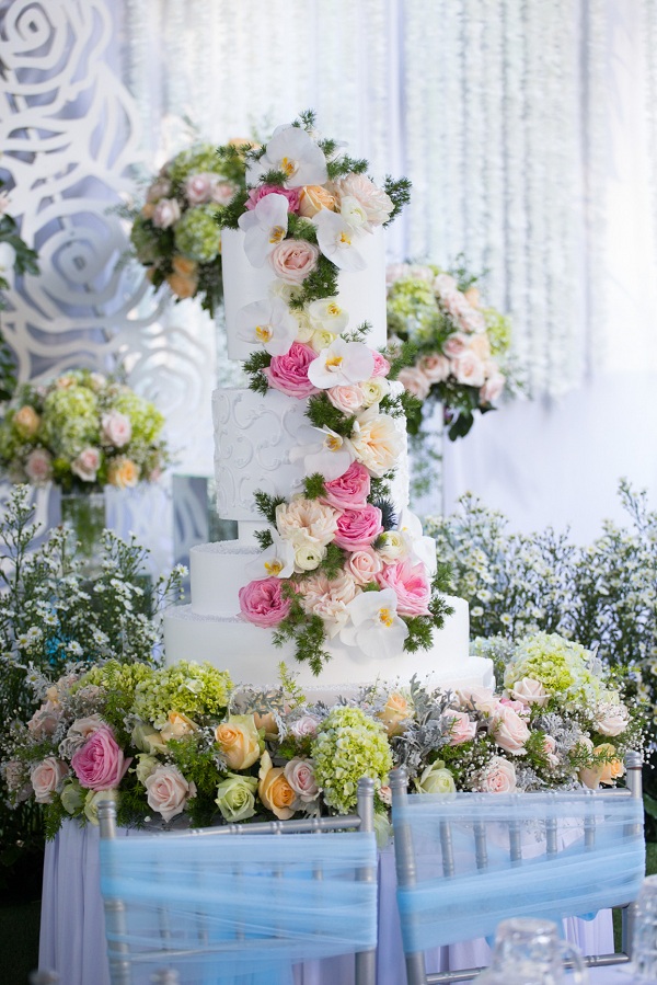 Bánh cưới cũng được trang trí bằng hoa tươi