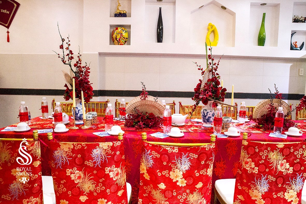 Bàn tiệc tiếp khách được trang trí tạo cảm giác ấm cúng giữa hai bên họ hàng.