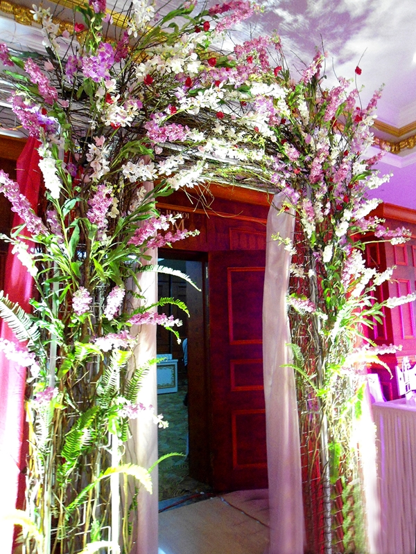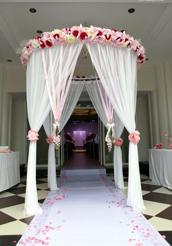Nếu cảm thấy ngân sách của mình eo hẹp, bạn có thể lựa chọn thuê các mẫu cổng hoa lụa, với chi phí rẻ hơn nhưng vẫn có vẻ đẹp riêng. Cổng hoa dưới đây kết hợp ba màu hồng cánh sen – trắng – xanh lá cây nhìn rất trẻ trung, ngọt ngào và nổi bật. Cánh cửa vào phòng cưới phía sau được trang trí bằng rèm lụa buông kết hoa màu hồng sen ton sur ton.