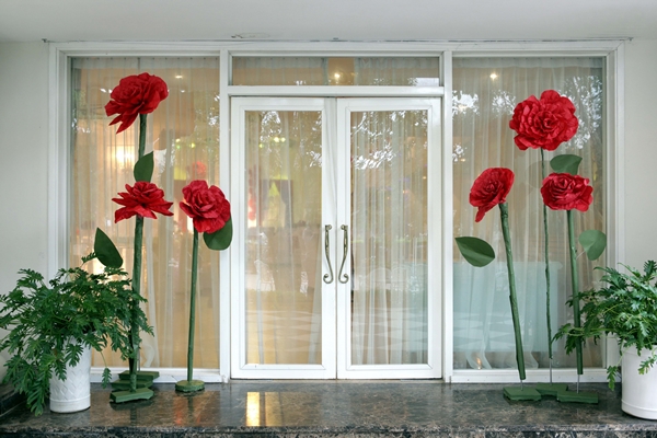Chẳng hạn như việc dùng chất liệu giấy để trang trí cổng hoa. Mẫu cổng hoa dưới đây được làm từ hoa giấy. Mỗi bên của lối vào dựng 3 bông hoa lớn màu đỏ. Cách trang trí này vừa độc đáo, xinh xắn, lại tiết kiệm chi phí.
