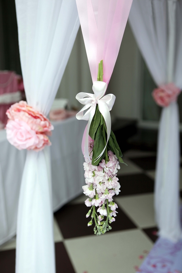 Chất liệu lụa kết hợp với gam màu Pastel tạo nên một chiếc cổng hoa lãng mạn, bay bổng.