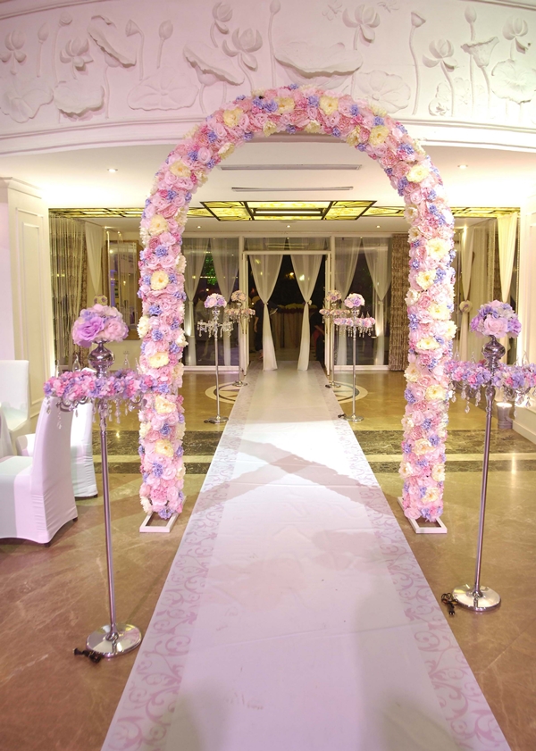 Ba màu trắng, hồng, tím pastel kết hợp với nhau tạo nên hiệu ứng nhẹ nhàng, thanh thoát nhưng cũng vô cùng bắt mắt. Cổng hoa bên dưới được kết từ ba loại hoa lụa: hoa hồng, hoa mẫu đơn, hoa cẩm tú cầu.