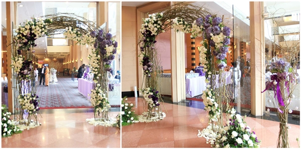 Set màu tím –trắng mang lại vẻ sang trọng, nền nã cho cổng hoa.