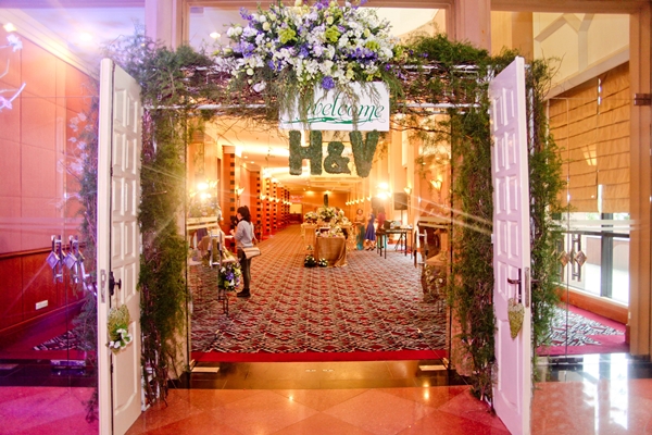Cổng hoa mang đậm phong cách thiên nhiên trong đám cưới có chủ đề “The Garden”. Cổng hoa kết từ hoa tươi với ba gam màu tím lavender – trắng – xanh lá.