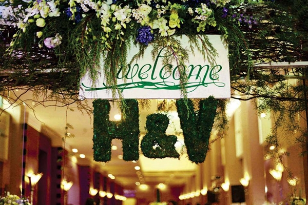 Chữ đầu tiên trong tên của cô dâu, chú rể màu xanh lá cây đậm treo ngay dưới cổng hoa.