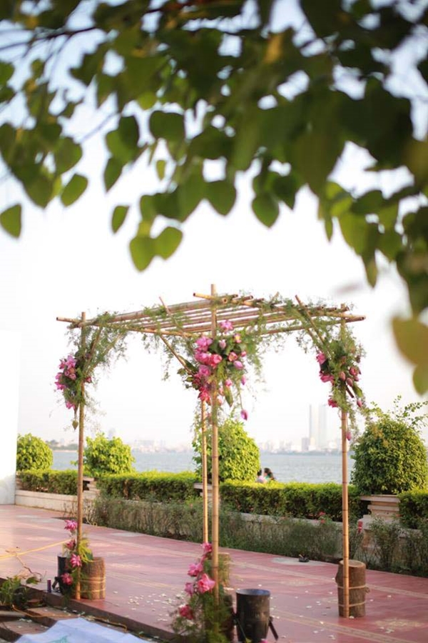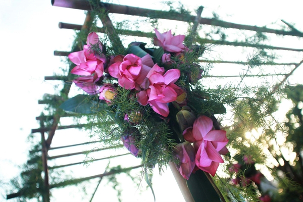 Cổng hoa dưới đây là một sản phẩm sáng tạo độc đáo của chuyên gia tổ chức cưới hỏi trong việc kết hợp các yếu tố thuần Việt vào đám cưới hiện đại. Cổng hoa được làm thủ công từ tre nứa, kết hoa sen trang trí, phối hợp với những nhánh dây leo mộc mạc, thanh nhã.