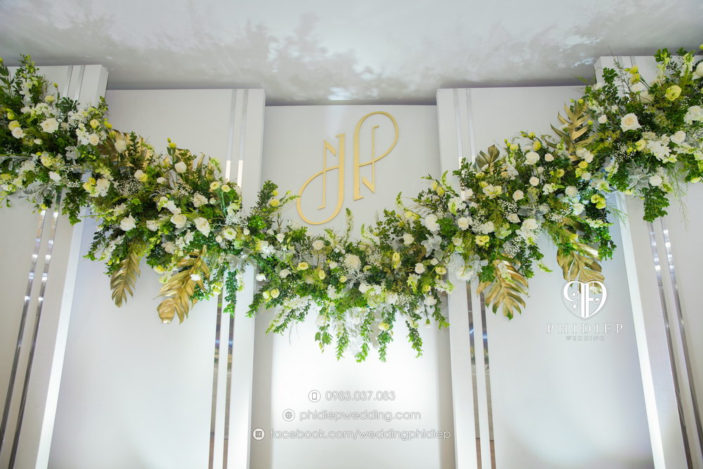 Nổi bật hơn cả trên tông màu trắng là dải hoa được cắm xen kẽ với những cành lá tươi mát. Nét độc đáo của không gian tiệc cưới này là tạo nên sự đơn giản, đường nét tinh tế nhưng lại không hề làm mất đi vẻ sang trọng tuyệt vời.